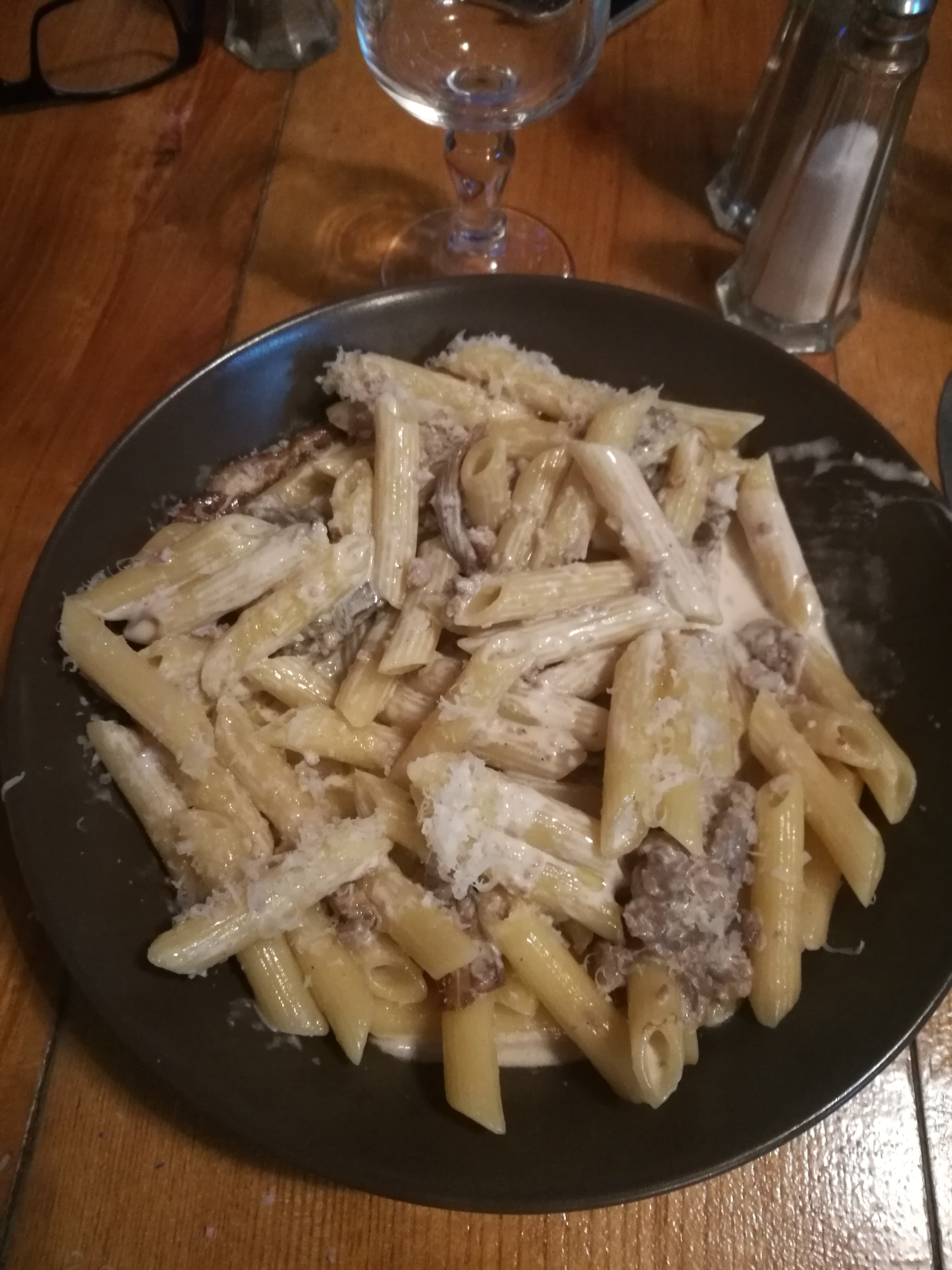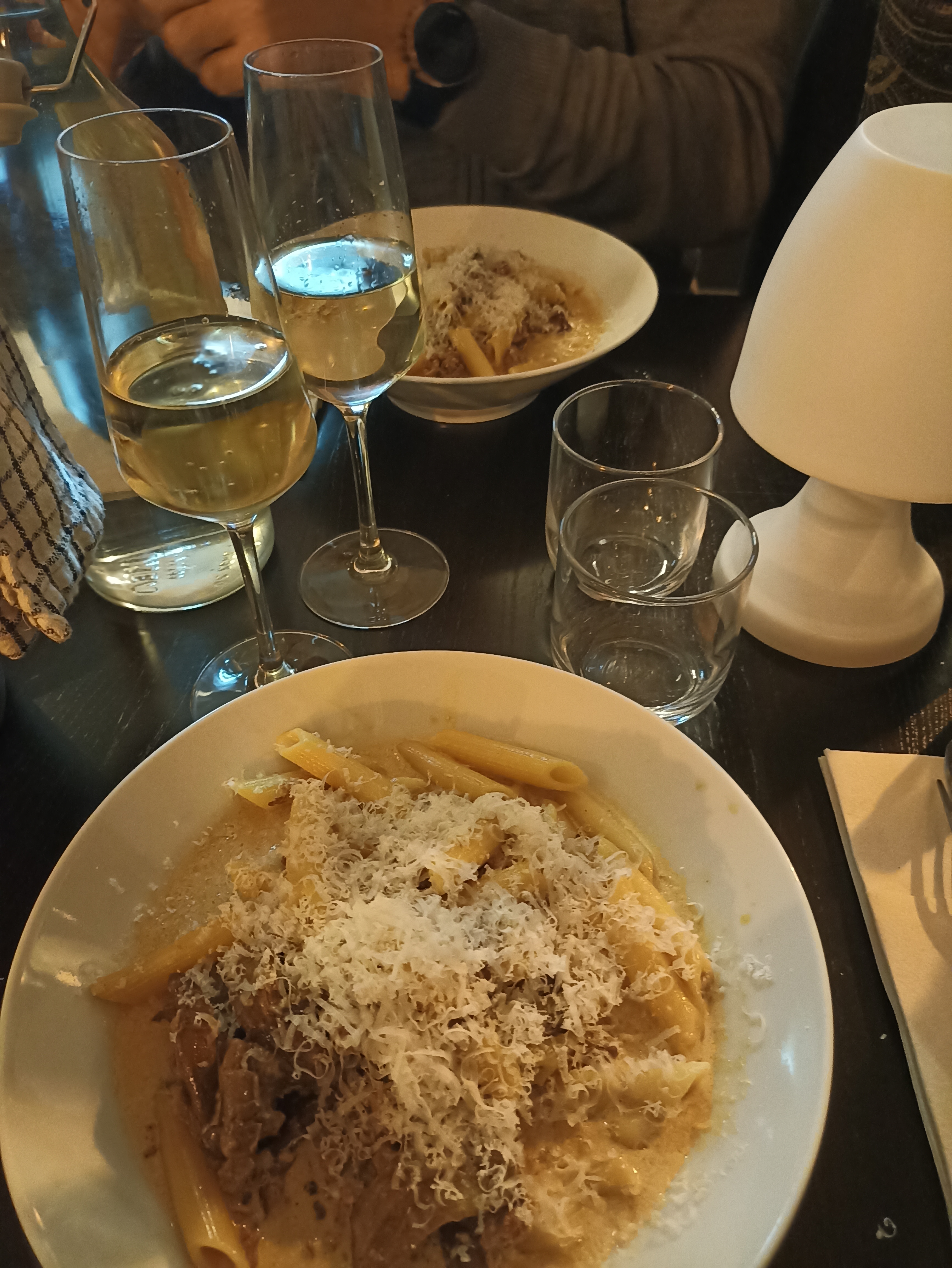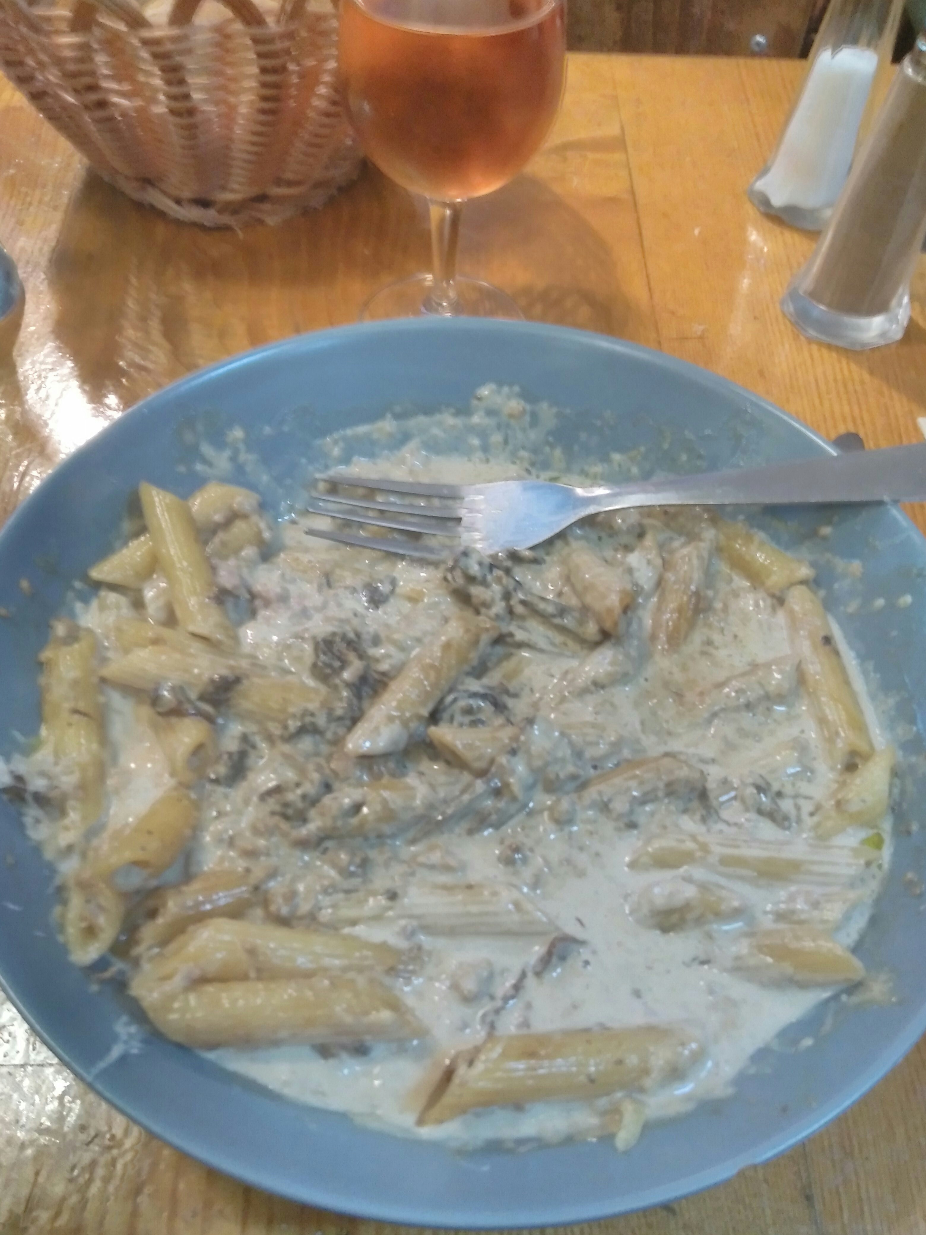 Pennes spécialité de la maison très bonne. Un peu déçu par le tiramisu. Trop de crème fraîche par rapport au mascarpone. Personnel au top et visite du patron. 👍