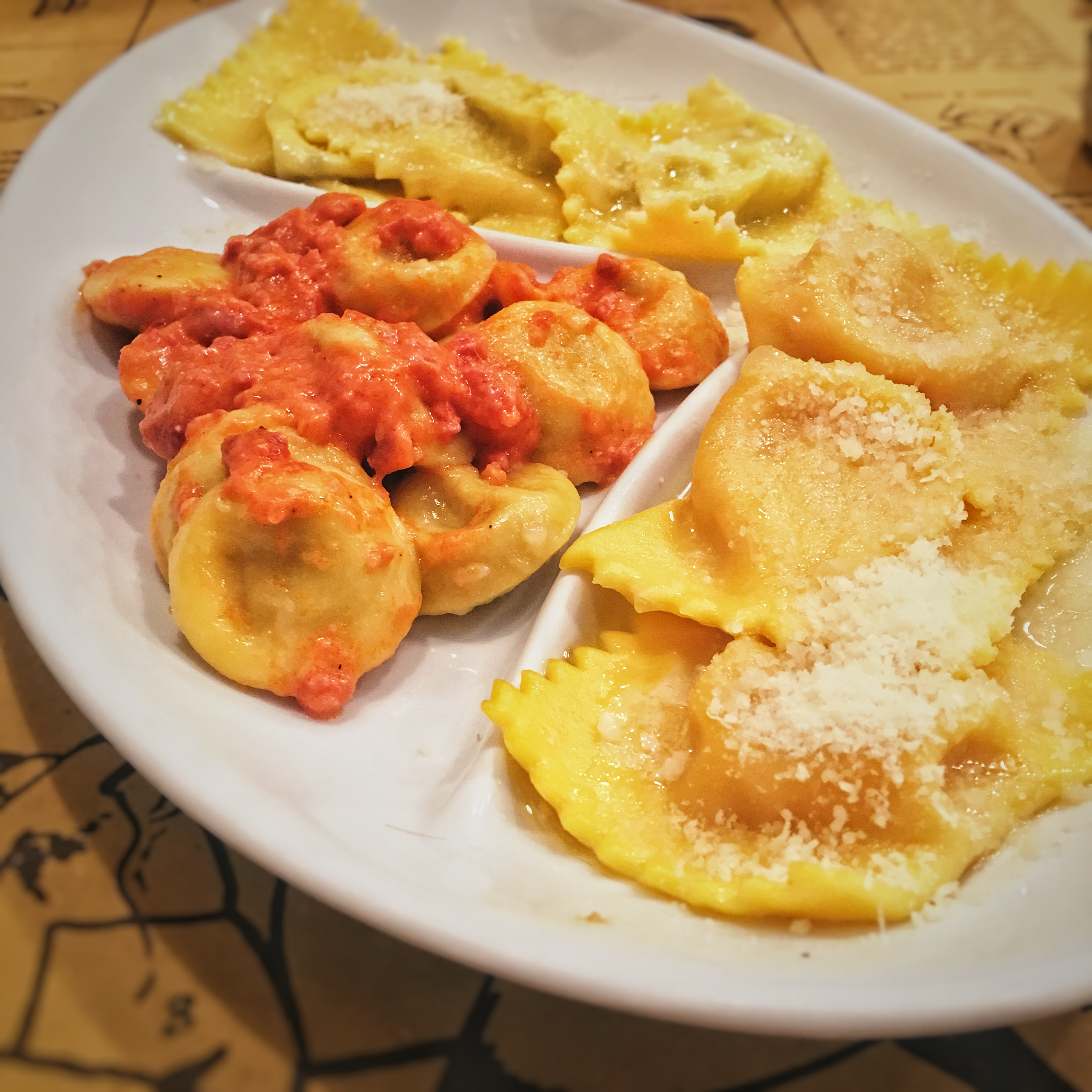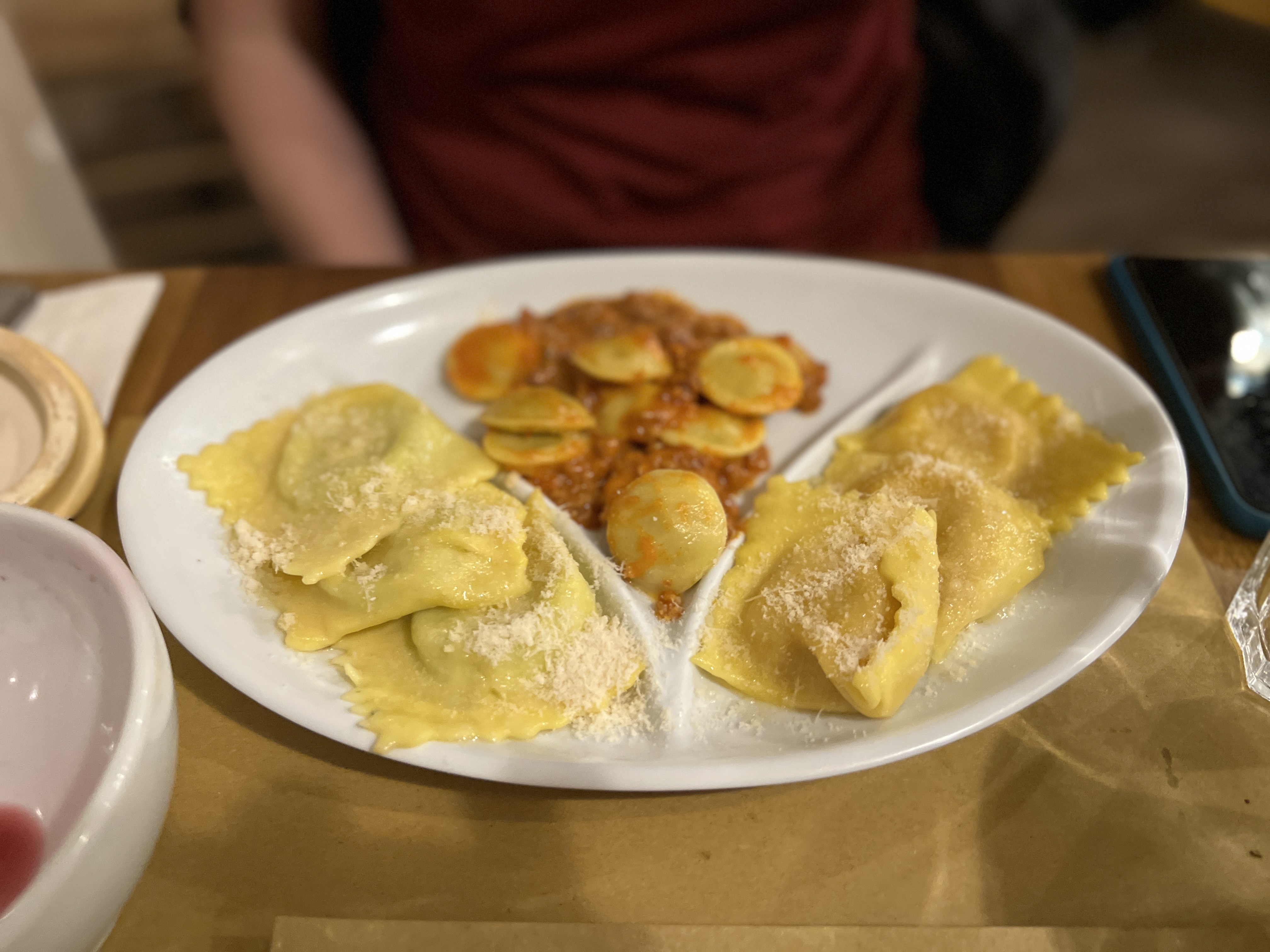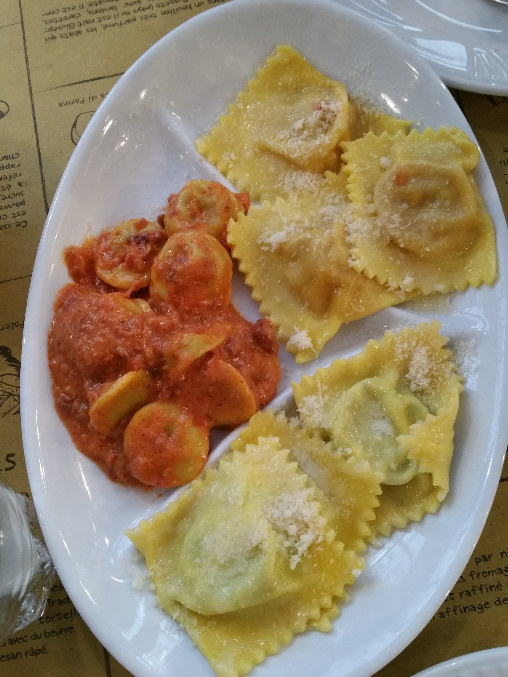 Venu sans réservation, pas le temps de goûter leur sorte de sauces que les plats sont déjà prêts, on avait pris une assiette avec les 3 sortes de ravioli qui n'étaient pas bon contrairement aux gnocchis au gorgonzola. Ensuite, il y a eu le dessert, le tiramisu était délicieux mais le sorte de sablé aux jaune d’œufs et aux amandes qui ressemblait plus à un cookie hyper sec et dur aux noix, amandes, cacahuètes avec un sabayon qui est tout sauf un vrai sabayon, la texture était bizarre, le goût pas bon. Résultat, je ne recommande pas ce restaurant et pour notre part, nous ne reviendrons pas