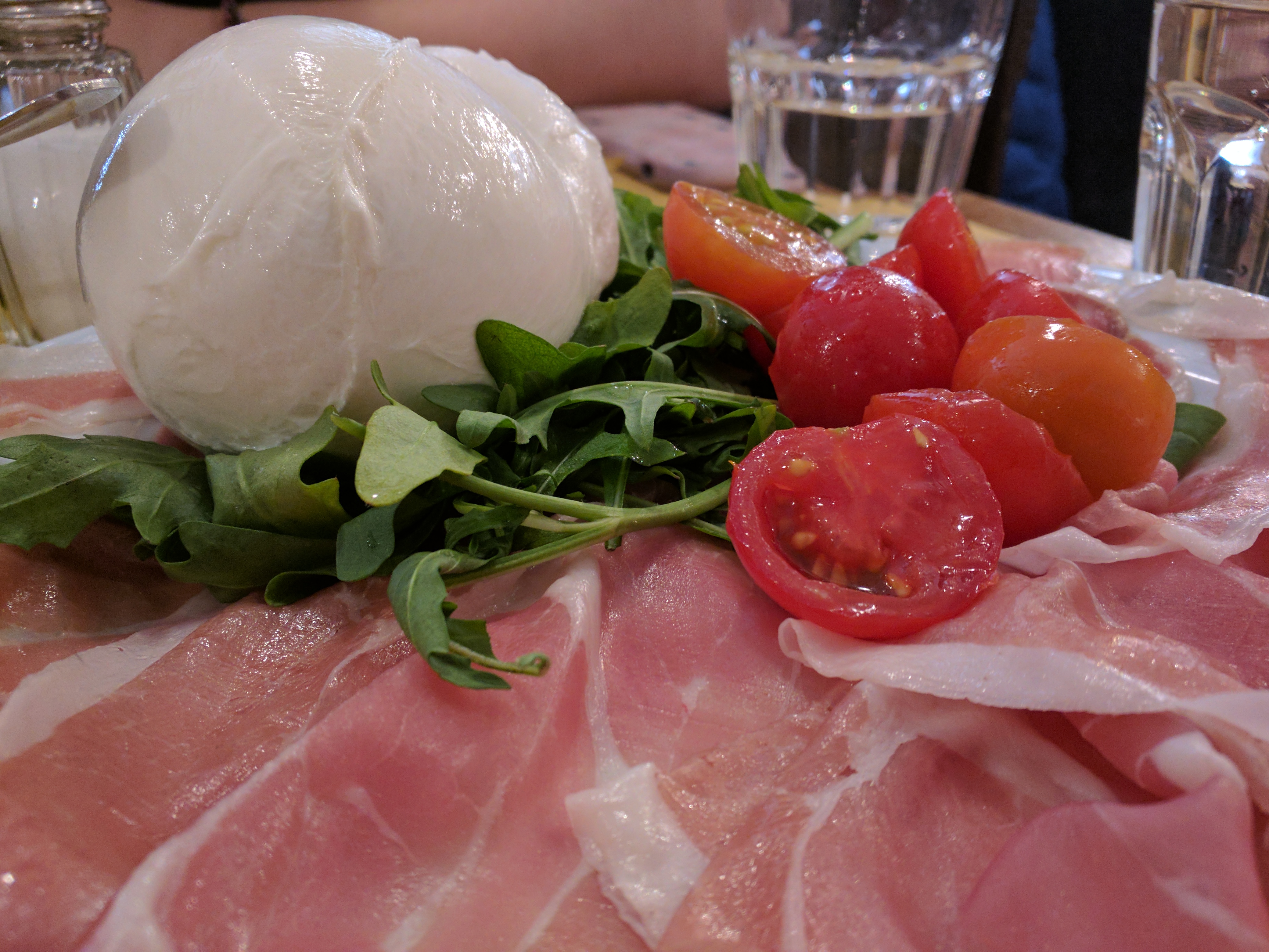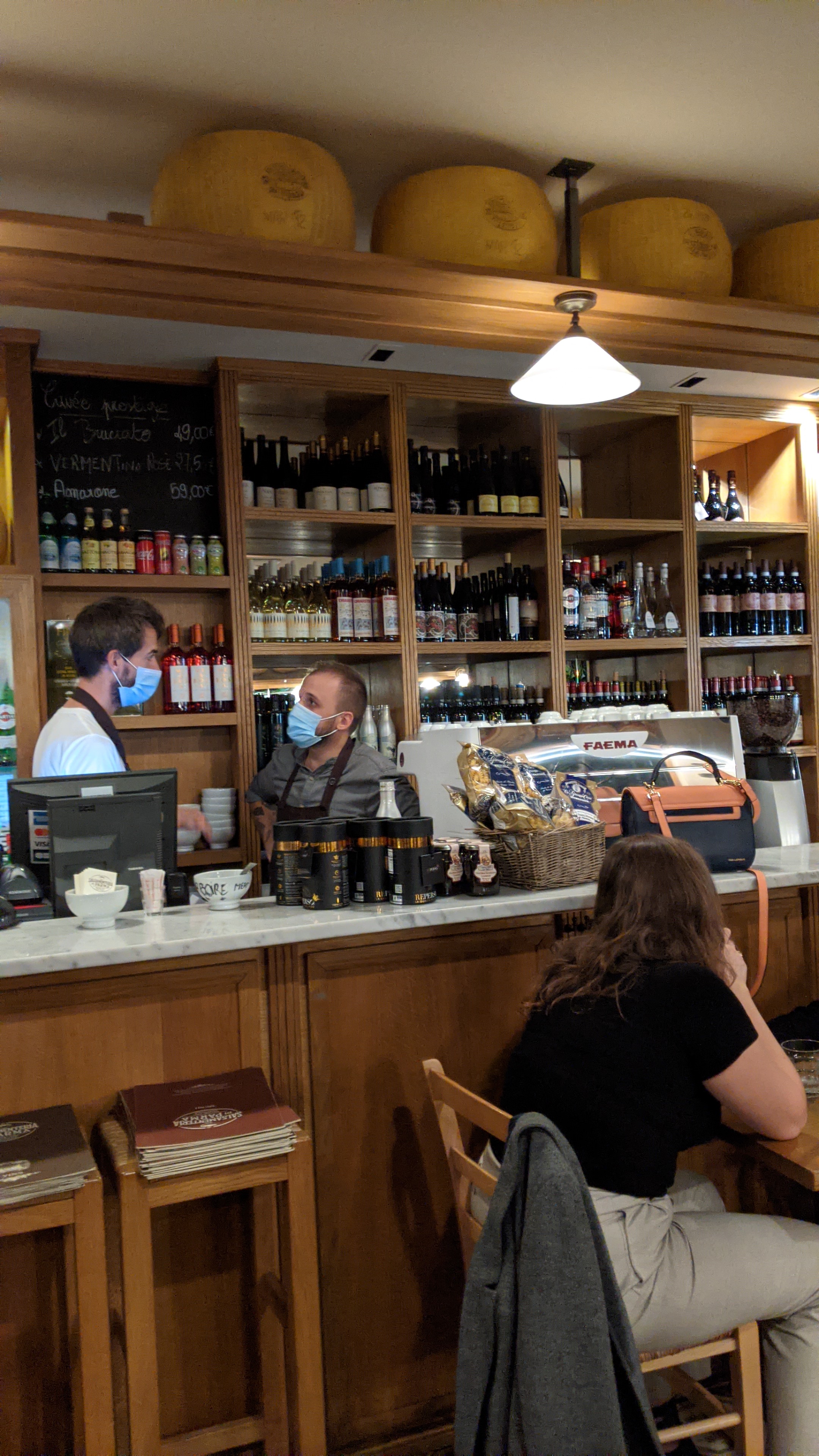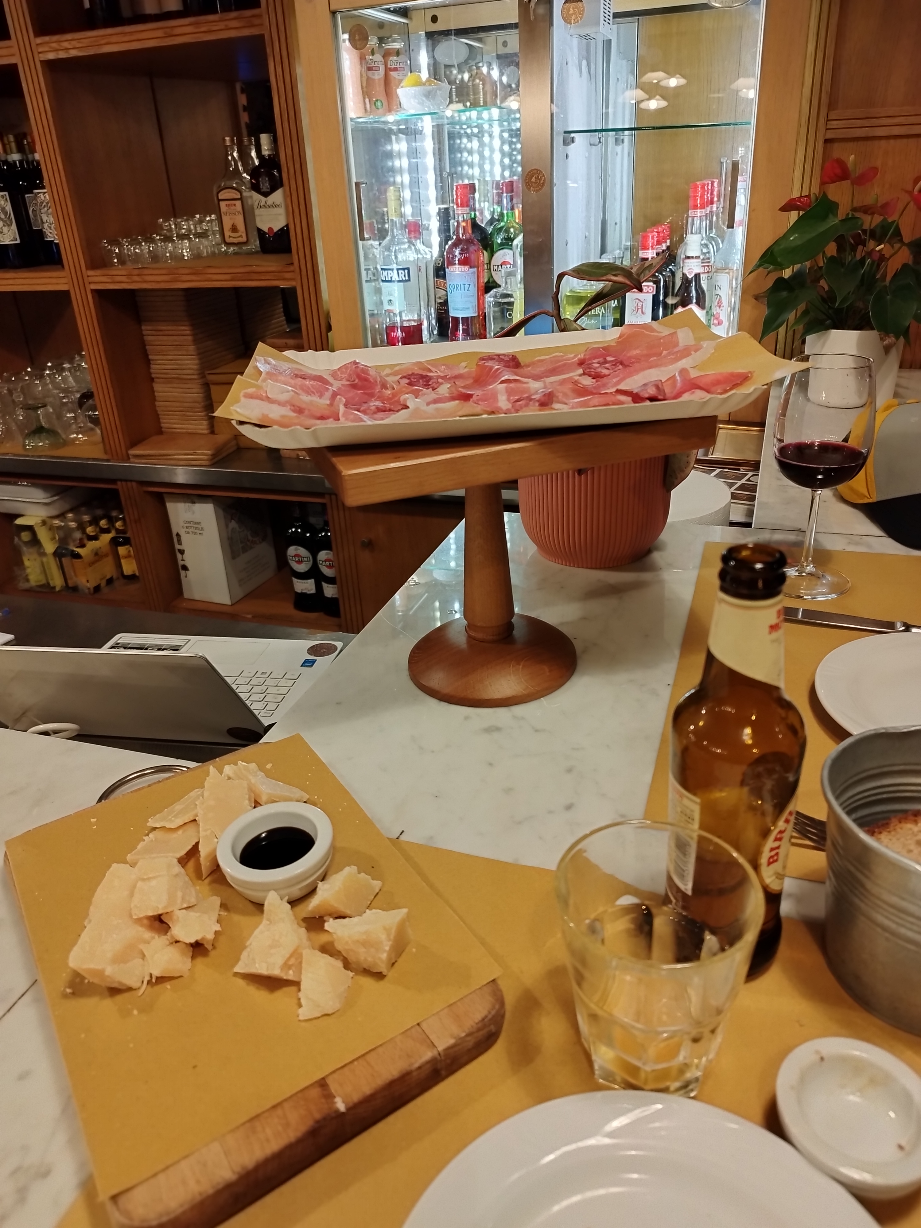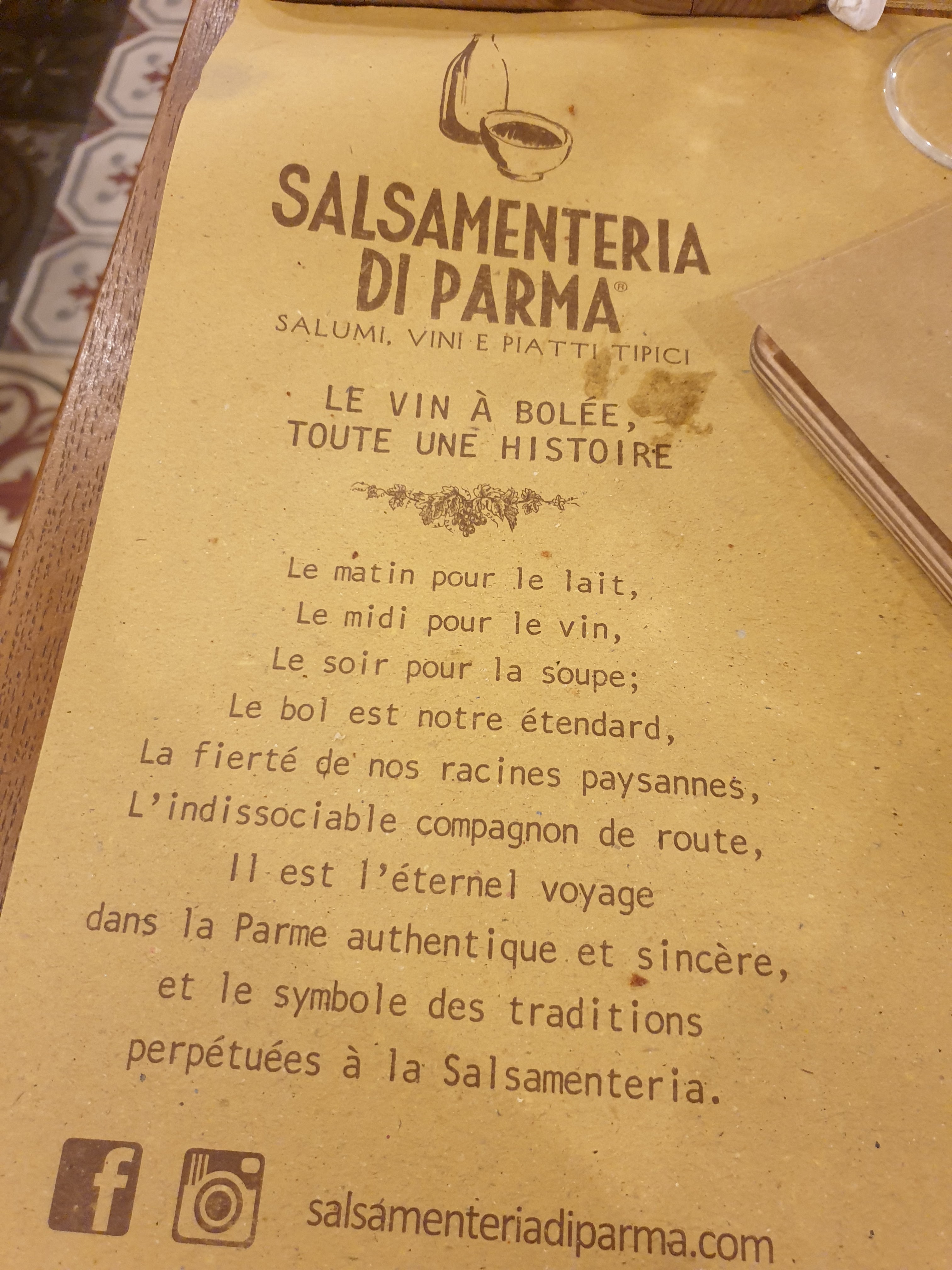 Pâtes, charcuterie et Parmiggiano. C'est de cette manière que Parme et sa région sont décrits. Ce sont aussi la base de toutes les recettes dans ce restaurant. Des pâtes fraiches (notamment des tortellini), des planches de charcuterie et en dessert, le saucisson au chocolat?