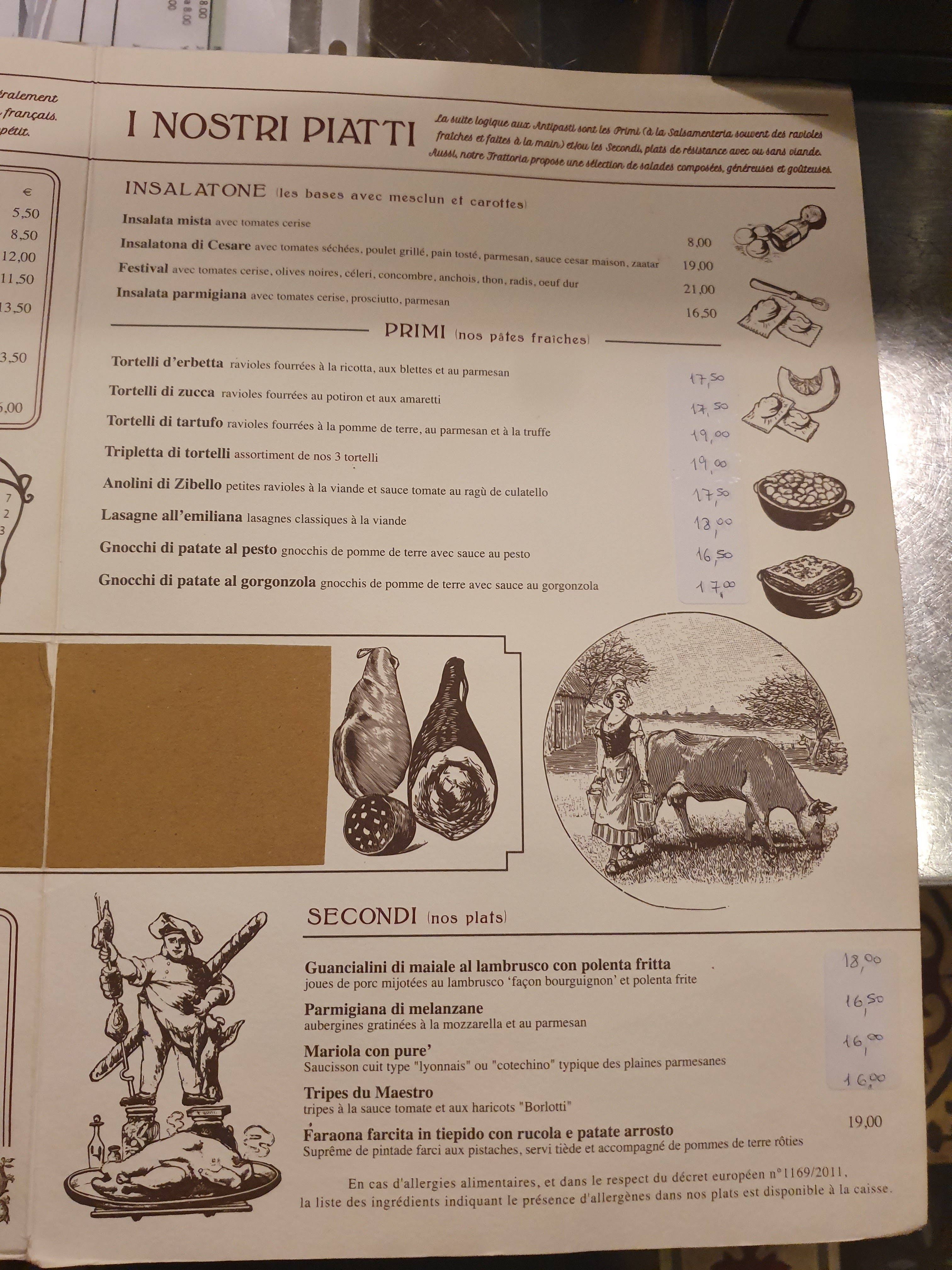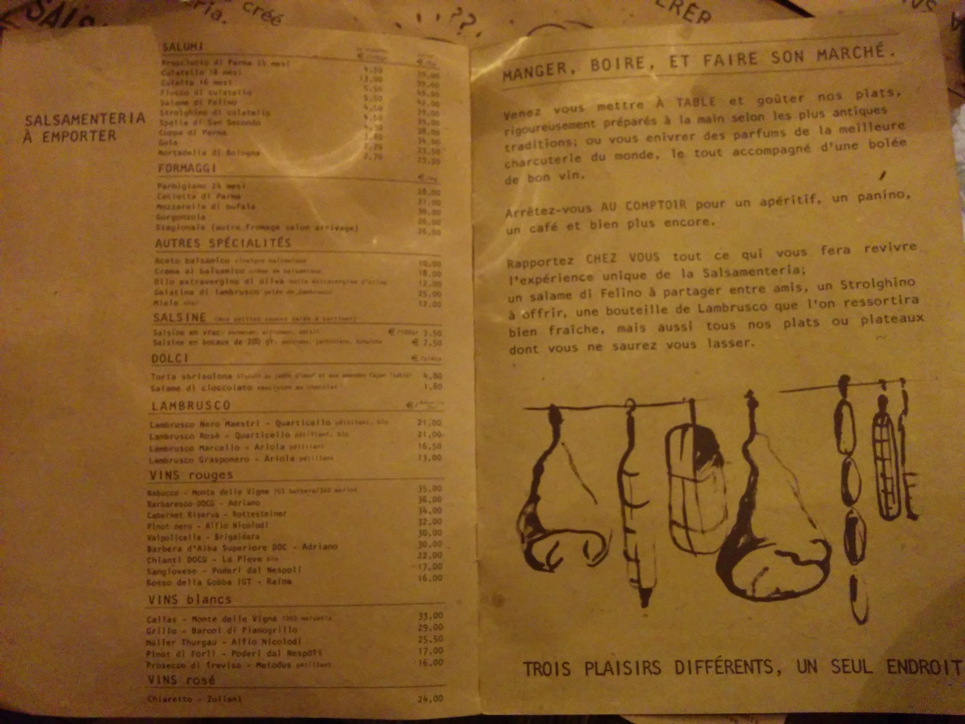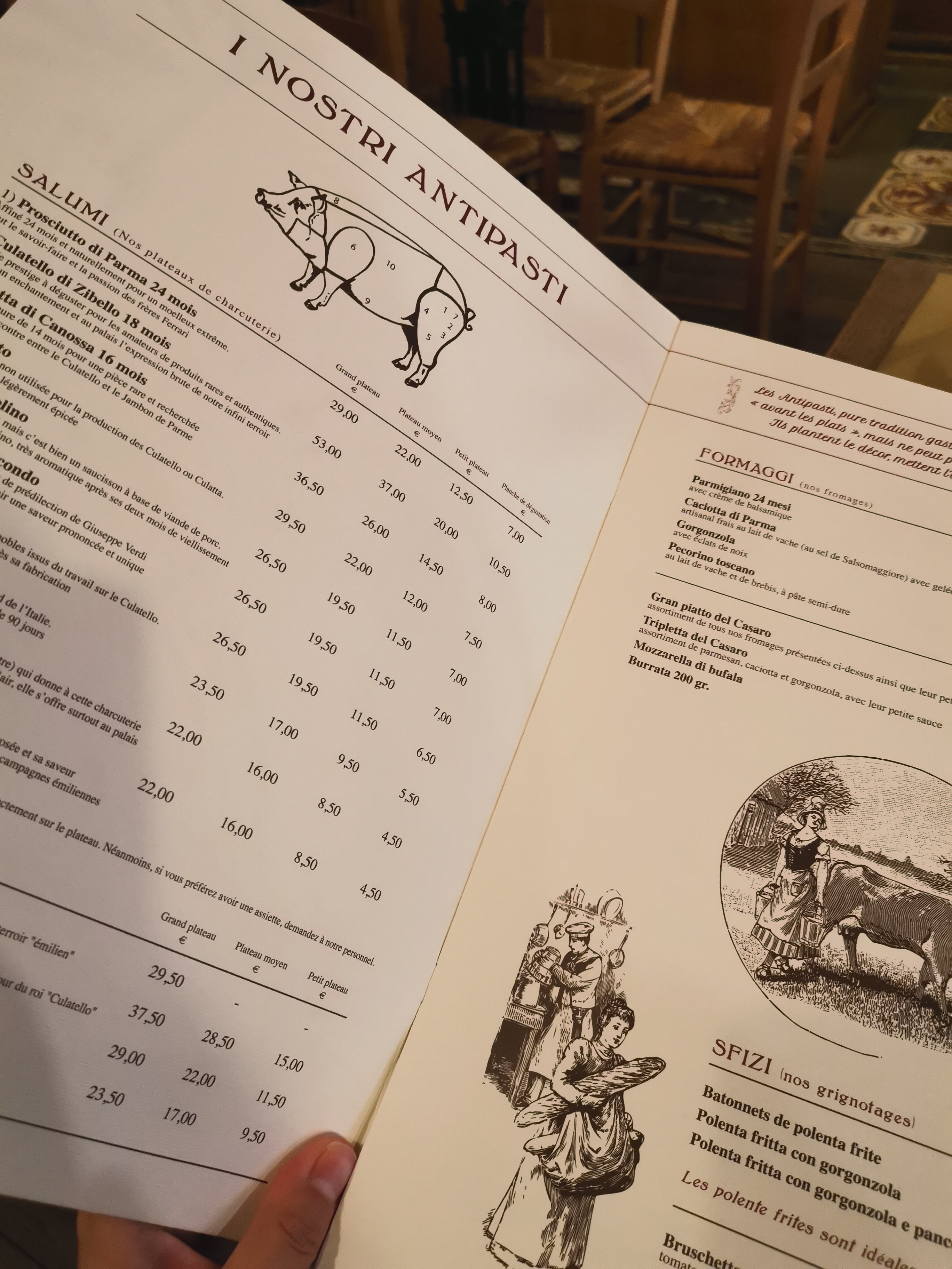 Il triumfo en plateau à partager à trois avec une explication de chaque partie pour chaque charcuterie Tripletta di tortelli (préférés, potiron et truffe) Un vin rouge pétillant servi dans un bol que j'ai aimé tout comme les tortelli Une adresse que je recommande dans un esprit authentique de la cuisine italienne