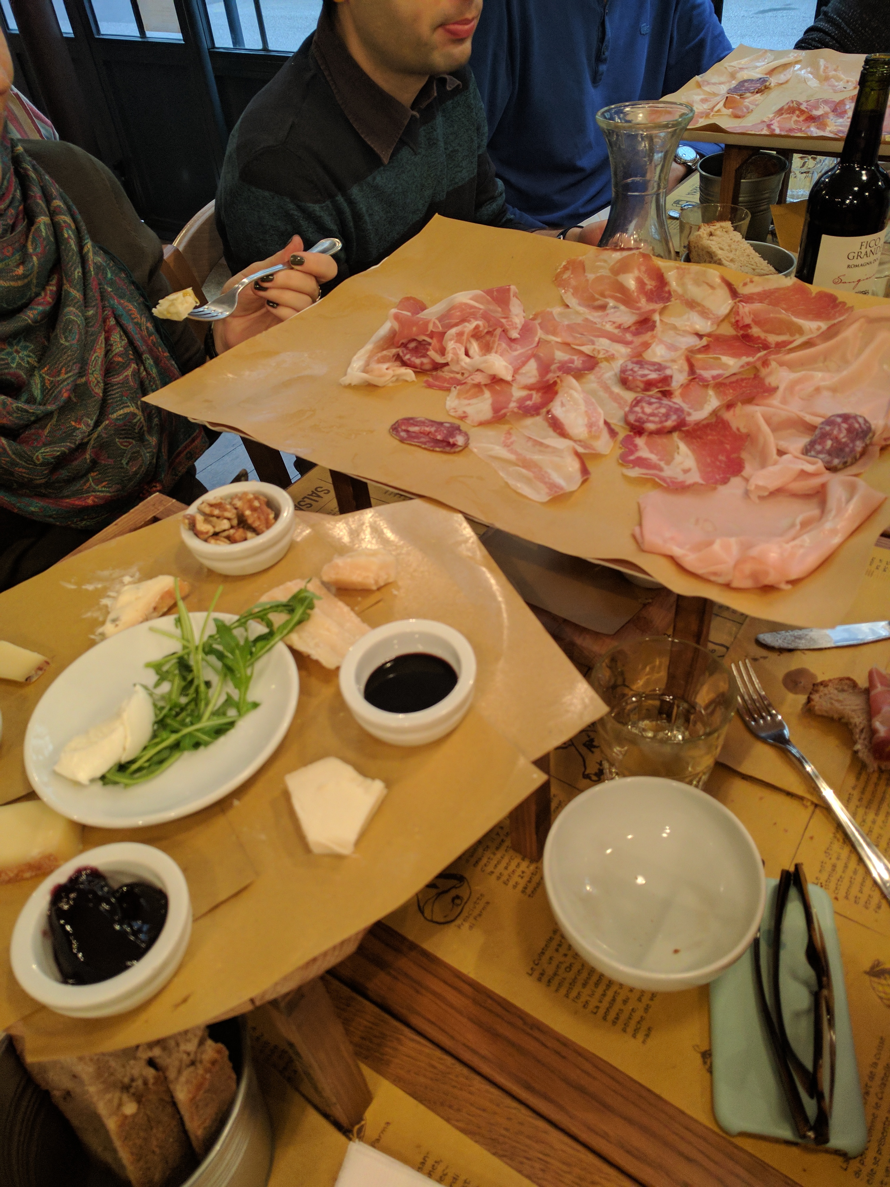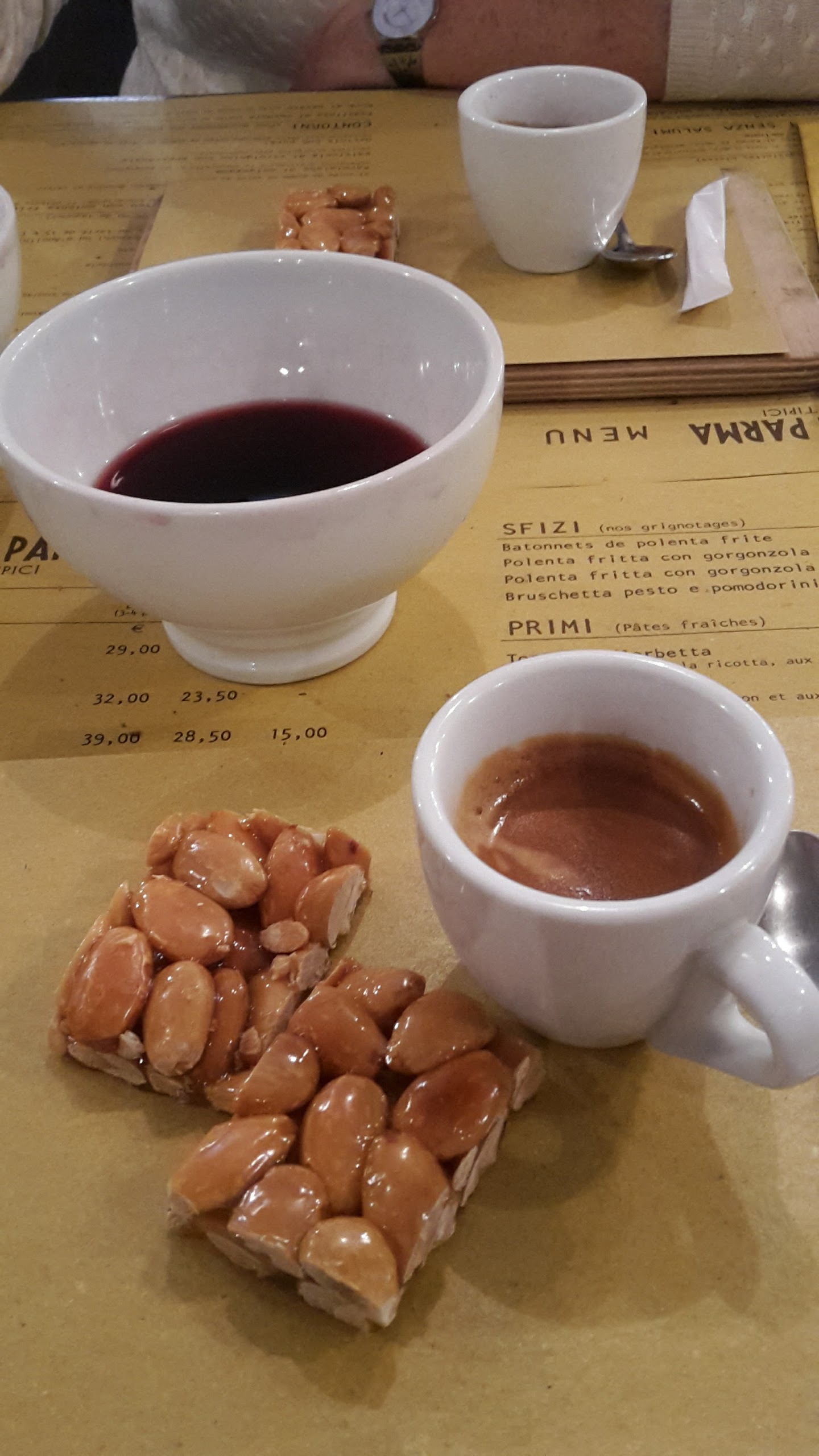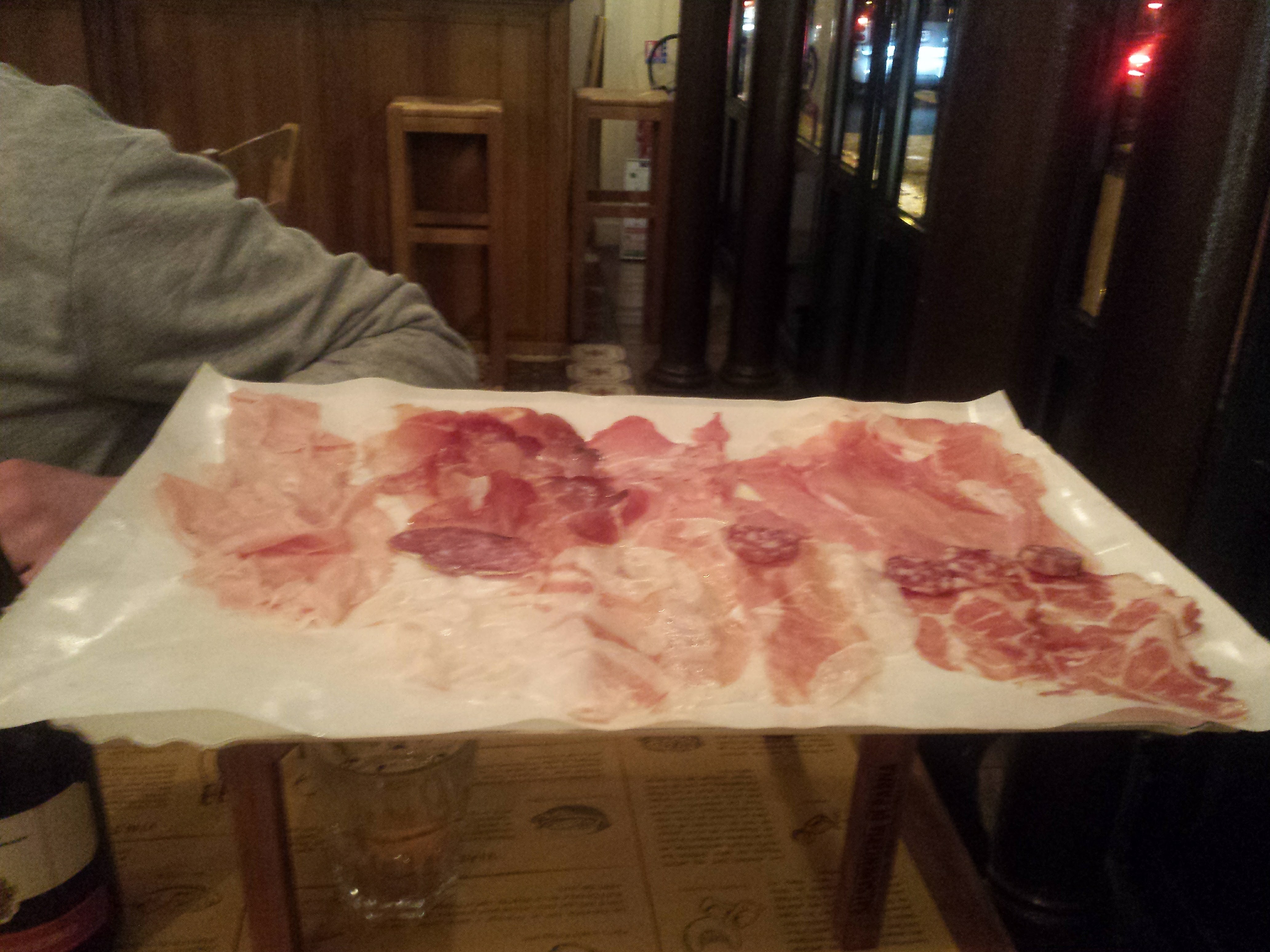 Il triumfo en plateau à partager à trois avec une explication de chaque partie pour chaque charcuterie Tripletta di tortelli (préférés, potiron et truffe) Un vin rouge pétillant servi dans un bol que j'ai aimé tout comme les tortelli Une adresse que je recommande dans un esprit authentique de la cuisine italienne