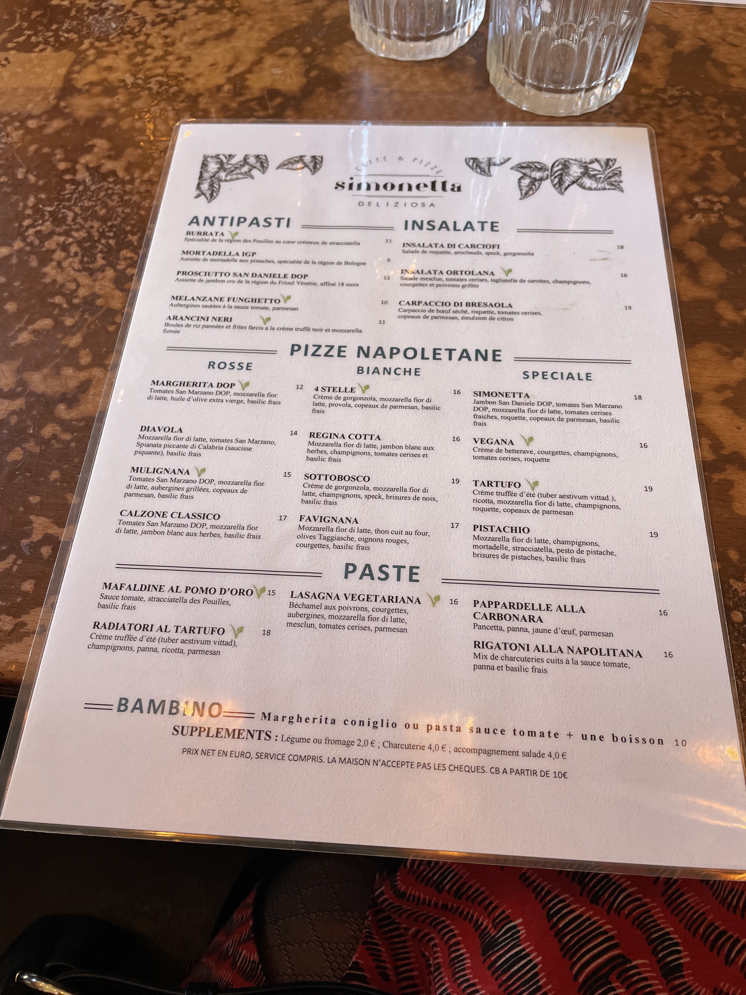 Pour y avoir mangé à deux reprises en 2017 puis 2024 avant un concert, je ne peux que conseiller Simonetta. Le lieu est agréable, aussi bien en terrasse qu'à l'intérieur, le personnel l'est tout autant et les pizzas napolitaines y sont excellentes !