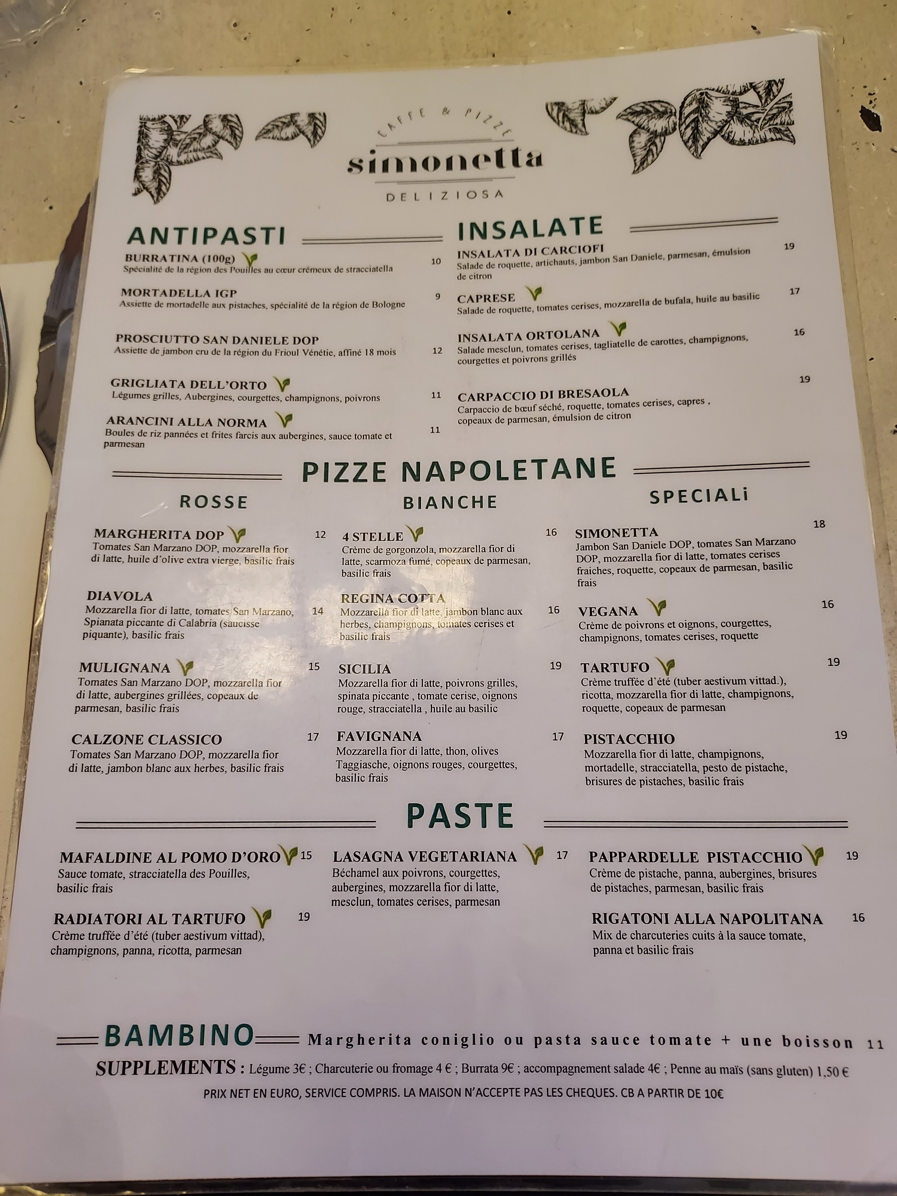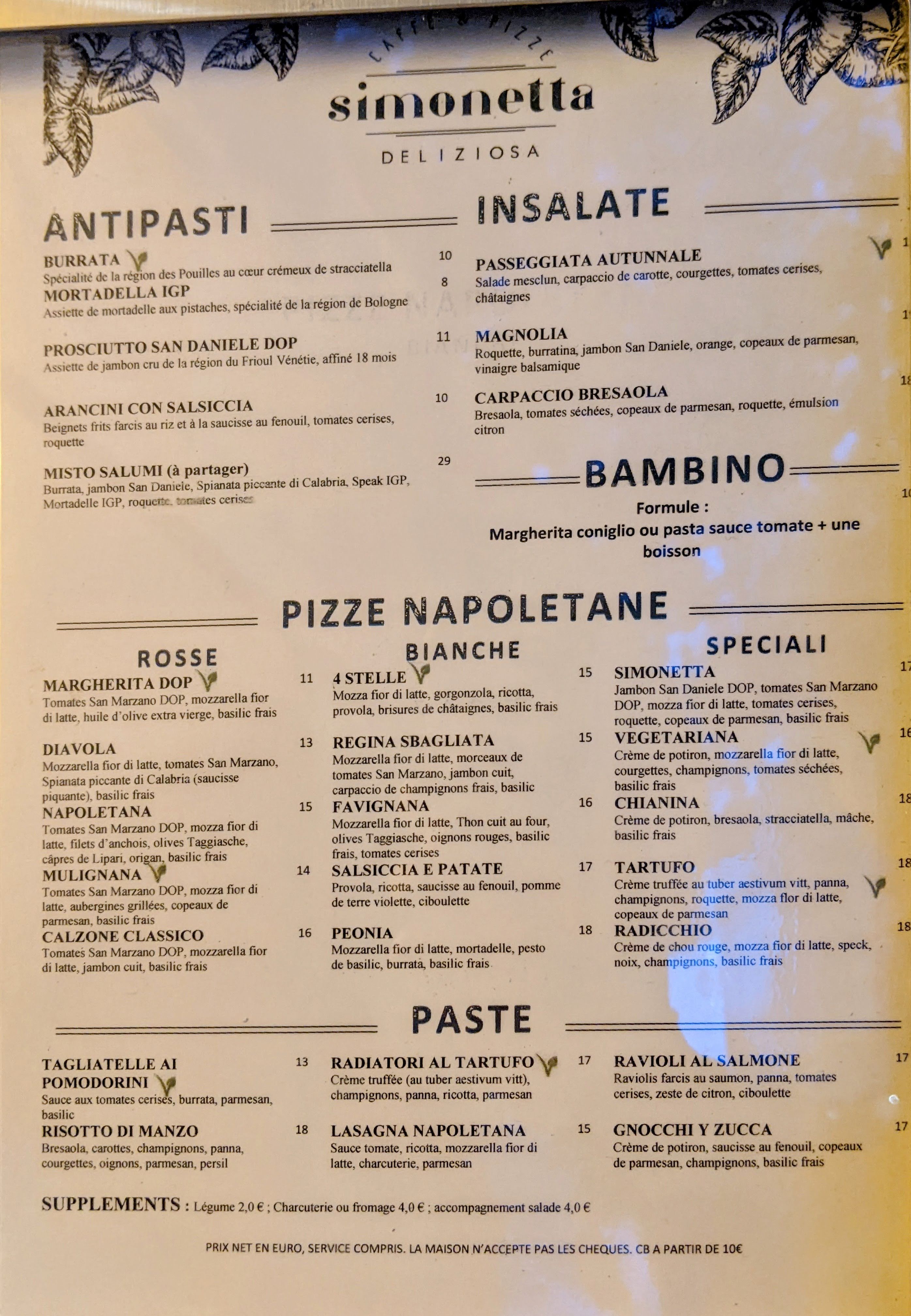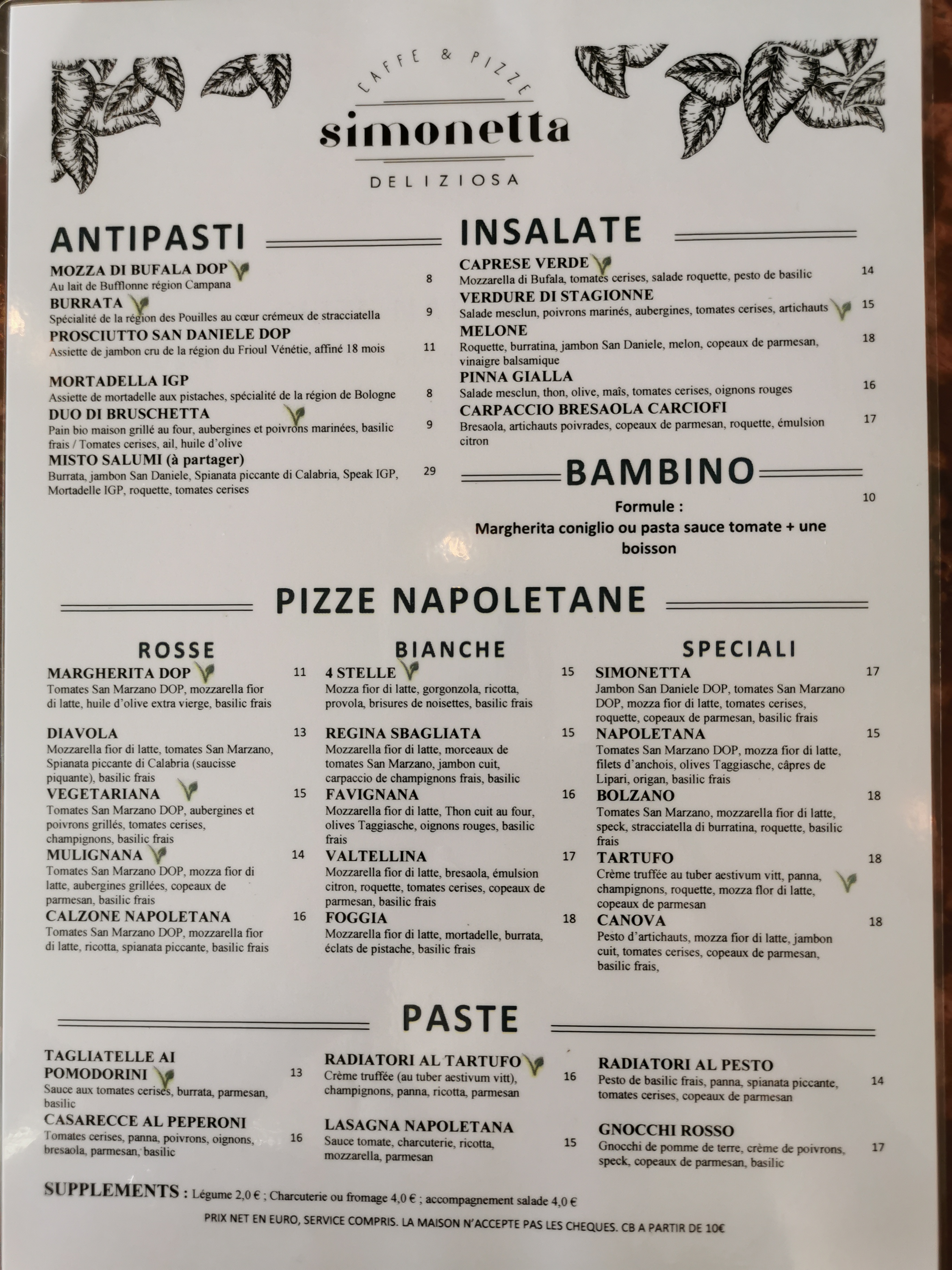 On se régale toujours chez Simonetta ! Les « pizze » sont justes délicieuses ! Évidemment le restaurant est victime de son succès il y a donc vraiment besoin de réserver et si vous avez besoin de silence et de tranquillité ça risque d’être compliqué ! Venez y pour au moins goûter une bonne pizza