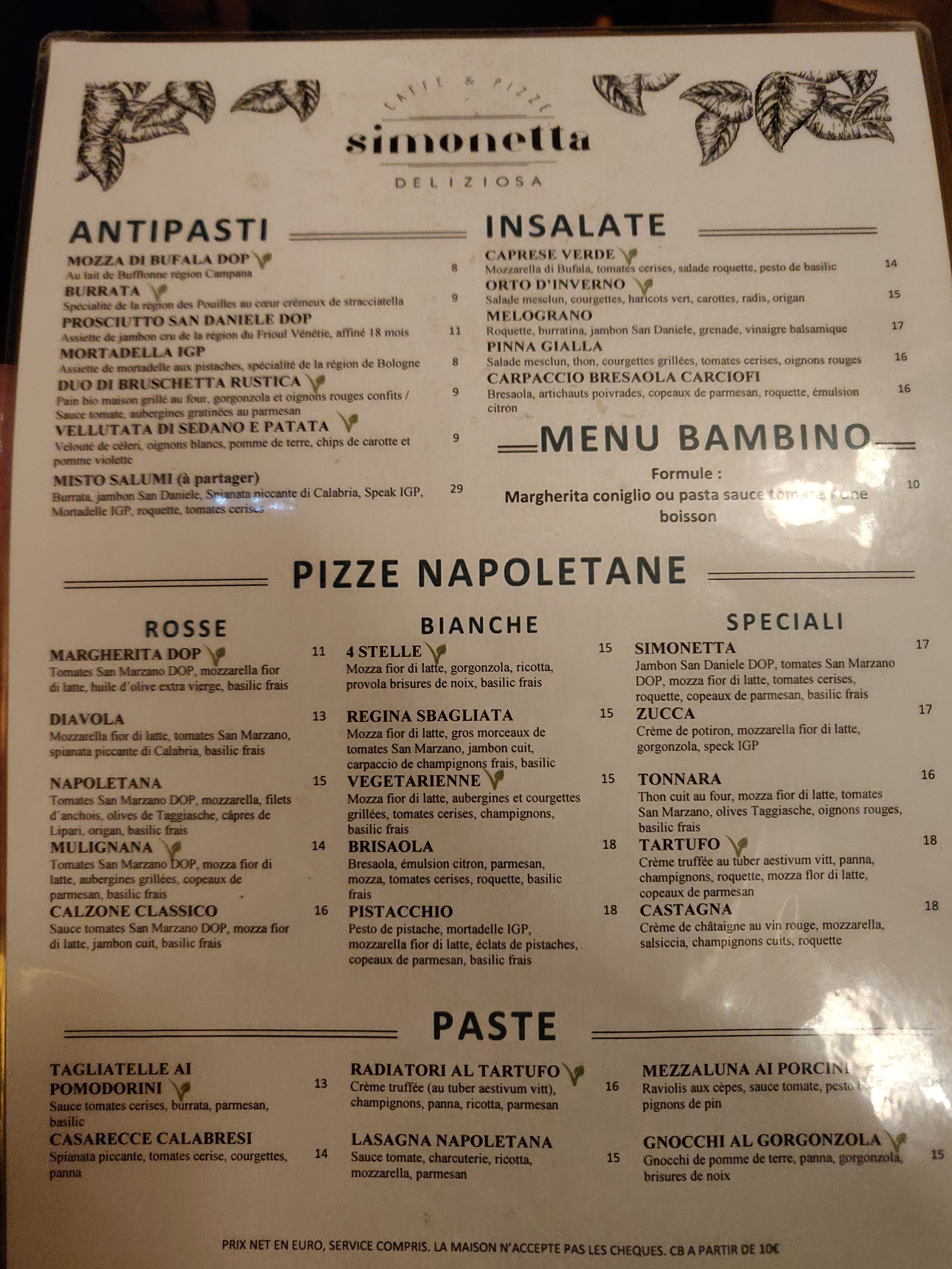 C’était ma première visite, et certainement pas la dernière ! J’ai commandé la pizza “Simonetta”, et elle était tout simplement délicieuse, avec des saveurs parfaitement équilibrées. En plus de la qualité des plats, l’ambiance du restaurant était chaleureuse et conviviale. Le personnel était accueillant, attentionné et toujours souriant, ce qui a rendu l’expérience encore plus agréable. Une adresse à découvrir absolument, je recommande les yeux fermés !