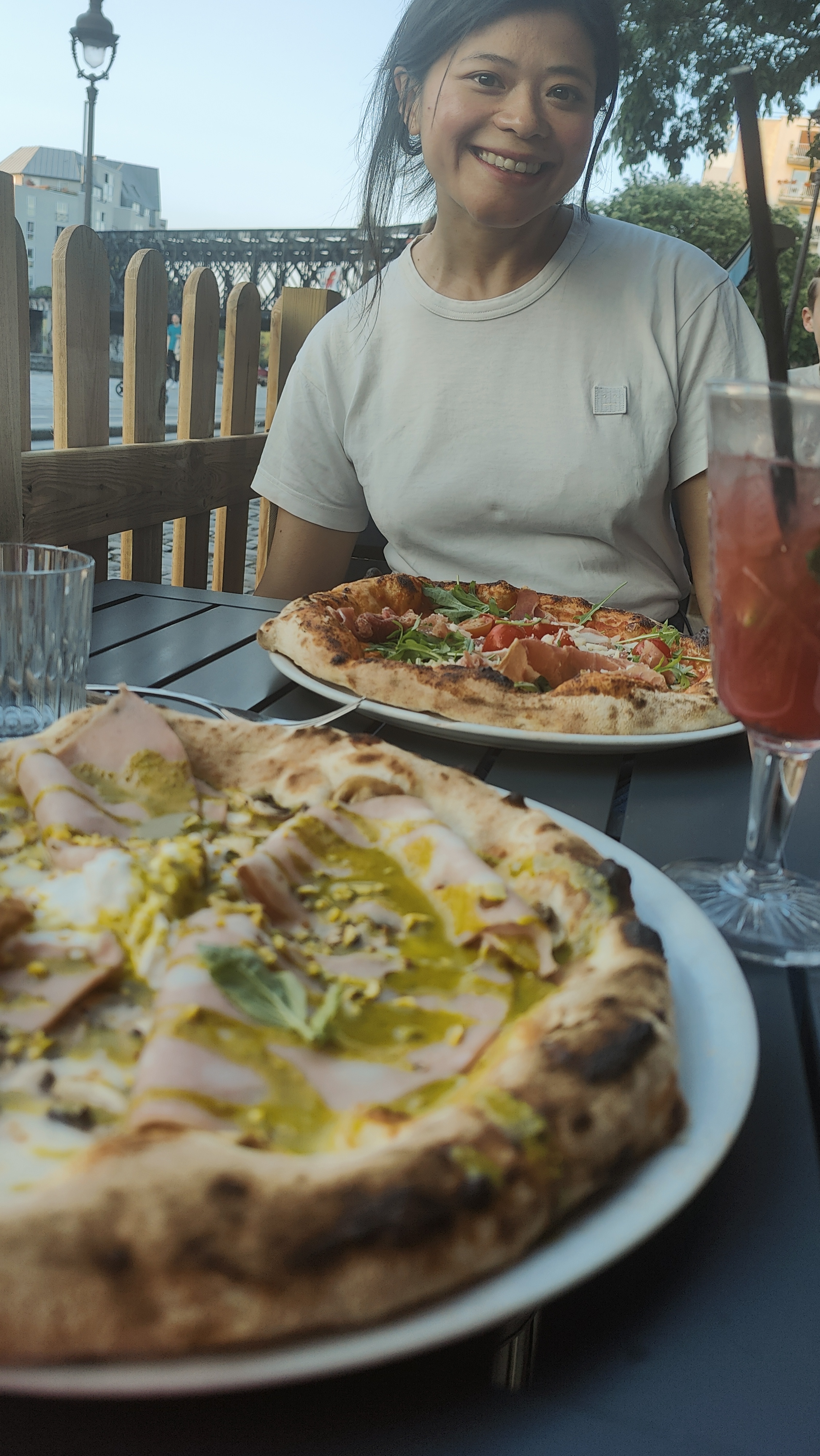 Les pizzas napolitaine comme on les aime. Une pâte aérée, légère qui croustille sur le pourtour. Des ingrédients de qualités: on sent l'Italie à pleine nez. Notre entrée était une pizza pour 2, notre plat: 1 pizza chacun. Nous voulions profiter de ces mets juste parfaits pour notre palet. La terrasse qui donne sur le bord de seine est très agréable.