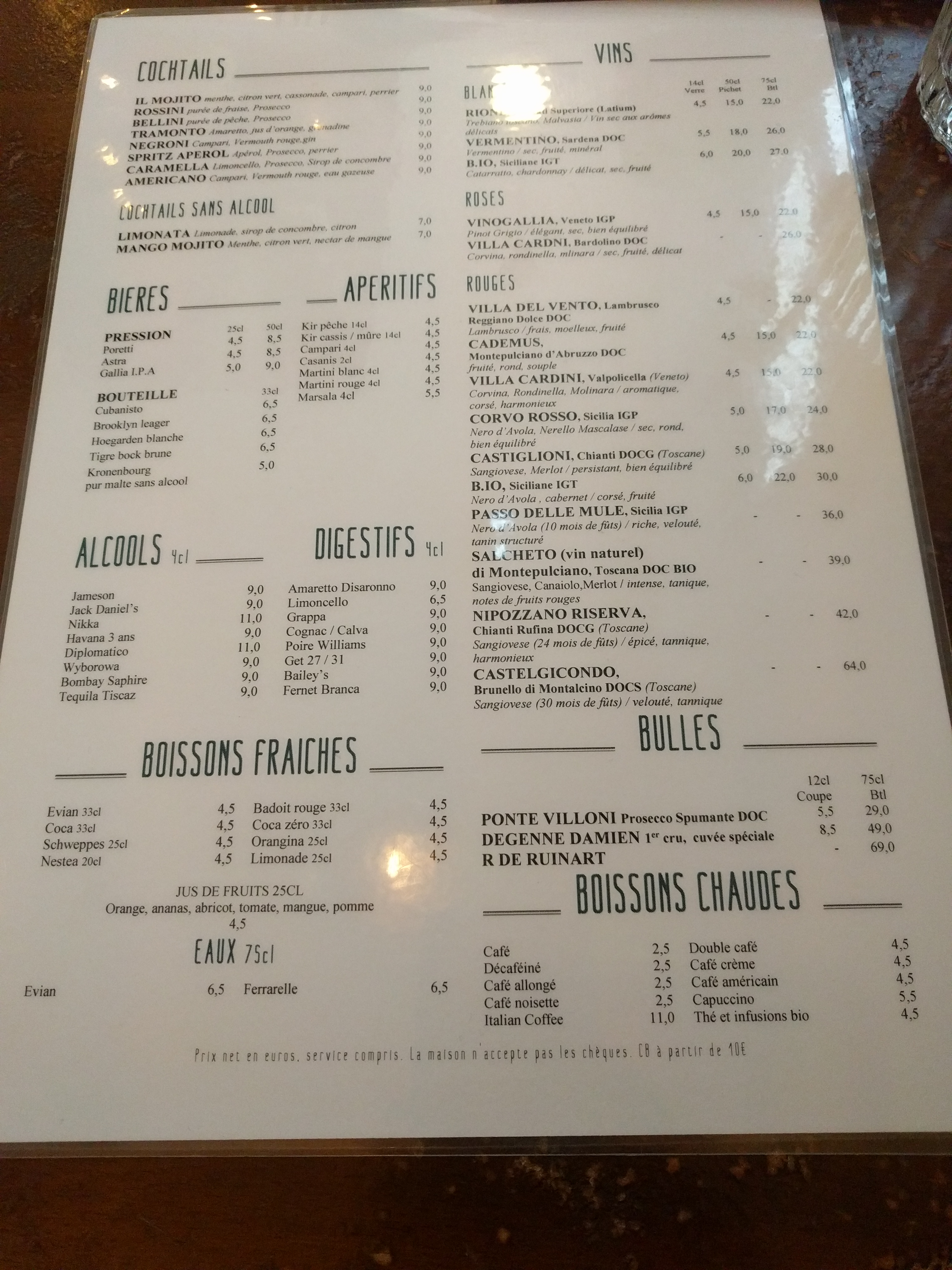 La pizza est très bonne mais les desserts sont un peu chère ! Il faut compter entre 15 et 18 euros la pizza, 4,50 euros la boisson et 8 euros environ un dessert