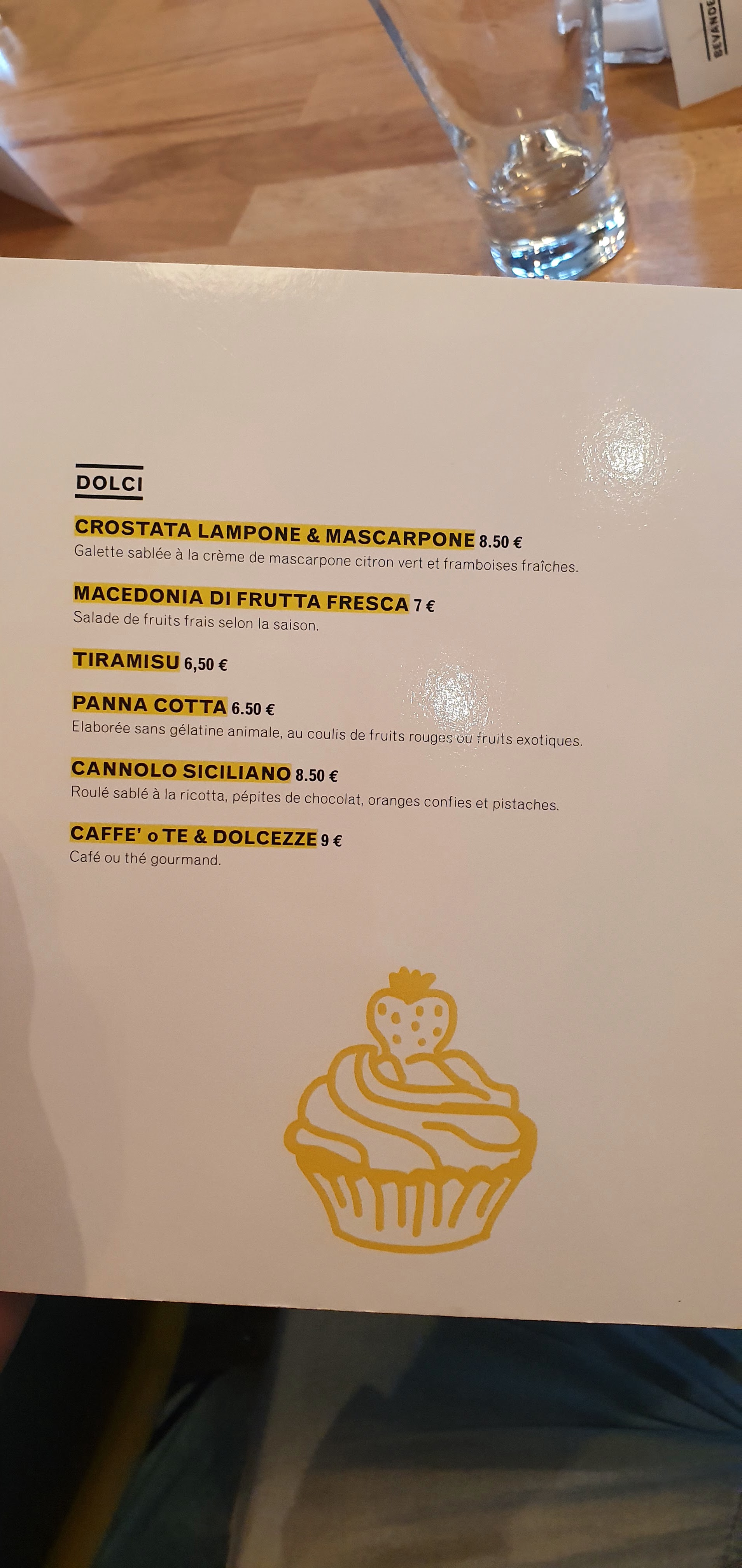 Oui je vous le confirme Monsieur les produits au So Italia sont de qualité. La recette du Tiramisu est celle authentique au café avec de l’amaretto liqueur italienne préparée avec les amandes des noyaux d’abricots et pour en adoucir un peu le goût, nous y ajoutons de la liqueur d’amandes. Il semblerait que vous soyez l’exception car il est très très apprécié par tous nos clients. En ce qui concerne notre panna cotta, je ne peux vous laisser dire qu’elle est sans saveur !!!! elle est faite maison sans gélatine animal à la vanille de bourbon et accompagnée d’un coulis aux fruits rouges ou aux fruits exotiques. Quant à notre formule du midi à 19,50€ avec un plat préparé à partir de produits frais, de qualité + une boisson soft et un dessert au choix est de bon rapport qualité prix pour tous ceux qui en font leur choix le midi. Aux vues de vos griefs Monsieur, il est effectivement préférable que vous fréquentiez les autres restaurants du quartiers qui sont pour la majeure partie des Brasseries.