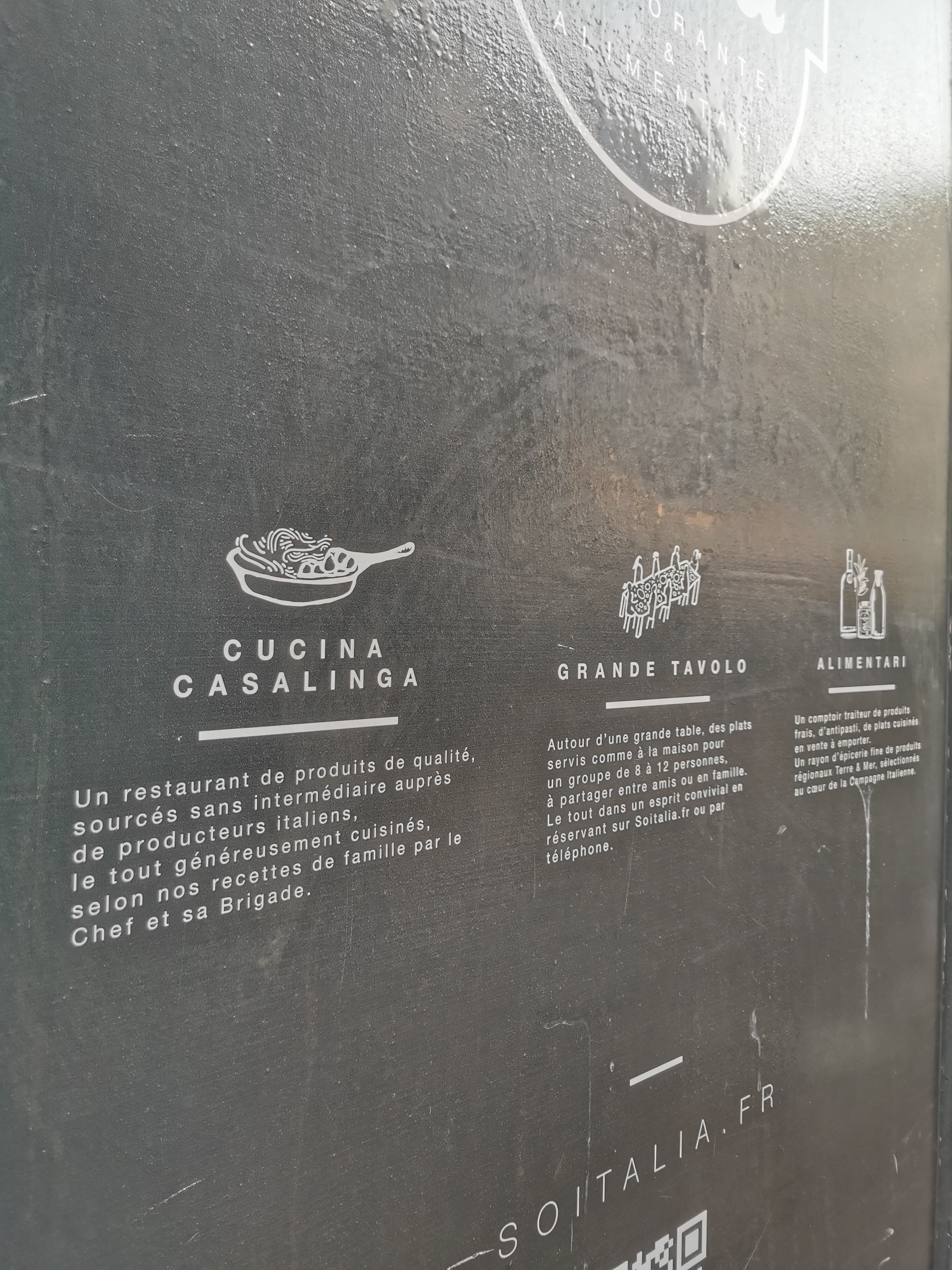 Madame, Alors que nos clients se tarissent d’éloges en ce qui concerne notre accueil chaleureux et notre sens du service, vous trouver vous Madame notre accueil sec et froid. En quoi il a été cavalier de vous demander à votre arrivée : avez-vous réservé ?? Alors que nous attendions des réservations ce lundi midi. Aucune acidité dans ma demande, soyez en assurée Madame !!! Au même titre que mes indications à votre départ, pour vous rendre à pieds du So Italia à la Gare de Lyon. Conseils qui sembleraient eux, ne pas vous avoir provoqué d’acidité !!!! Vous nous qualifiez de cavaliers alors que c’est vous Madame qui vous êtes comportée de façon cavalière en posant vos gros sacs sur la banquette de la table voisine à la vôtre sous prétexte qu’elle était inoccupée. Nos banquettes en tissus sont destinées à l’assise de notre clientèle pas pour leurs bagages !!! Et oui je vous ai proposé, sans pour autant insister de positionner vos sacs sur le porte manteaux juste à côté de votre table, nos portes manteaux étant équipés d’accroches pour les sacs. Croyez bien Madame qu’animés par notre passion et l’amour de notre métier nous mettons tout notre cœur à l’ouvrage et en toute sincérité. C’est pourquoi eu égard à ce lieu que vous avez trouvé très joli, nous sommes en droit d’exiger un minimum de respect pour un bien que nous nous efforçons de maintenir agréable, propre et en bon état. Heureux que vos papilles aient été séduites par notre cuisine.