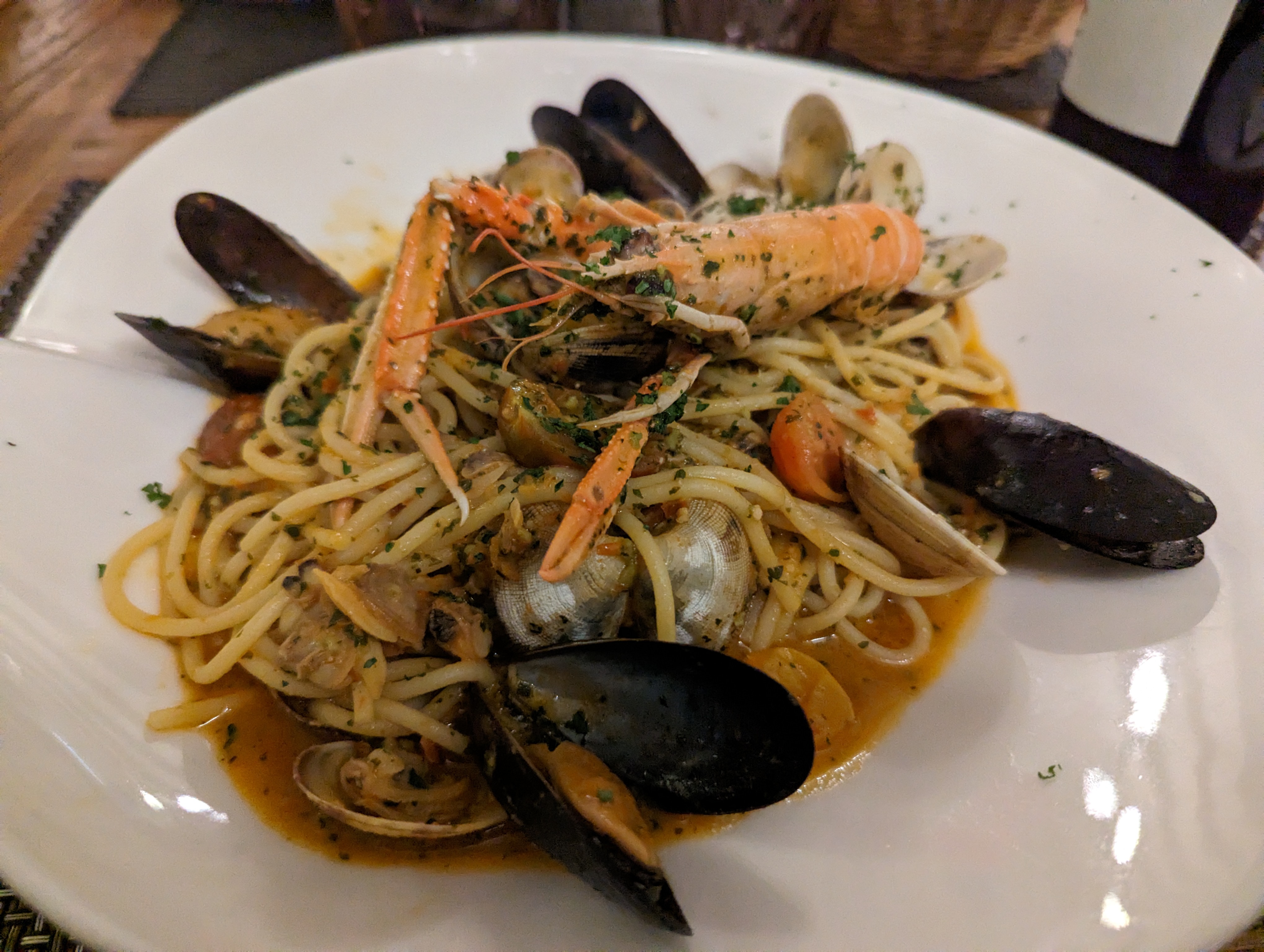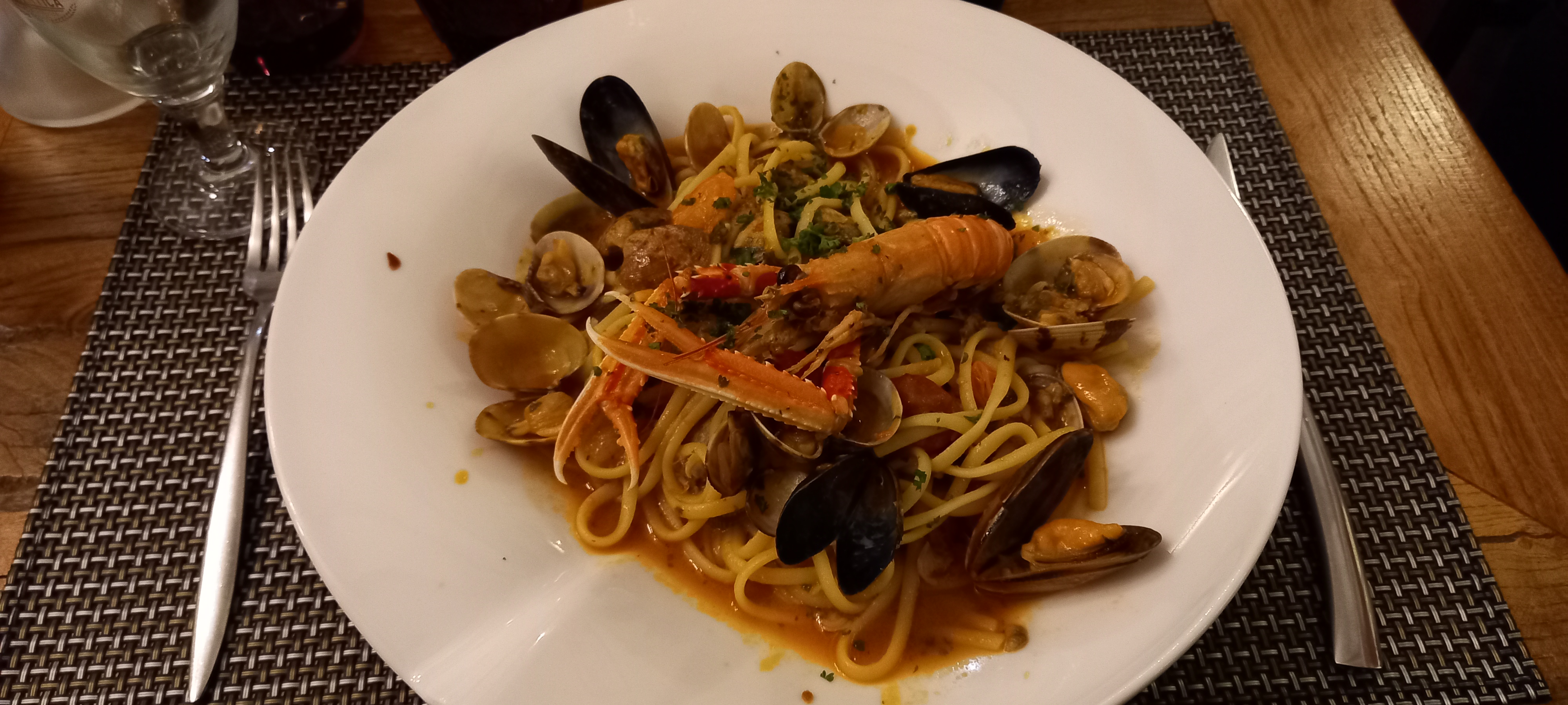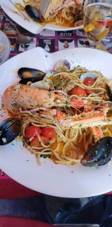 Tagliatelle aux St Jacques et Spaghetti Vongole arrosés d'une petit Lambrusco rosé, le tout sur une jolie terrasse entourée de verdure ... service rapide et sympa, ingrédients très frais, les pâtes restent chaudes longtemps, et très bon rapport qualité/prix ... ALLEZ-Y !