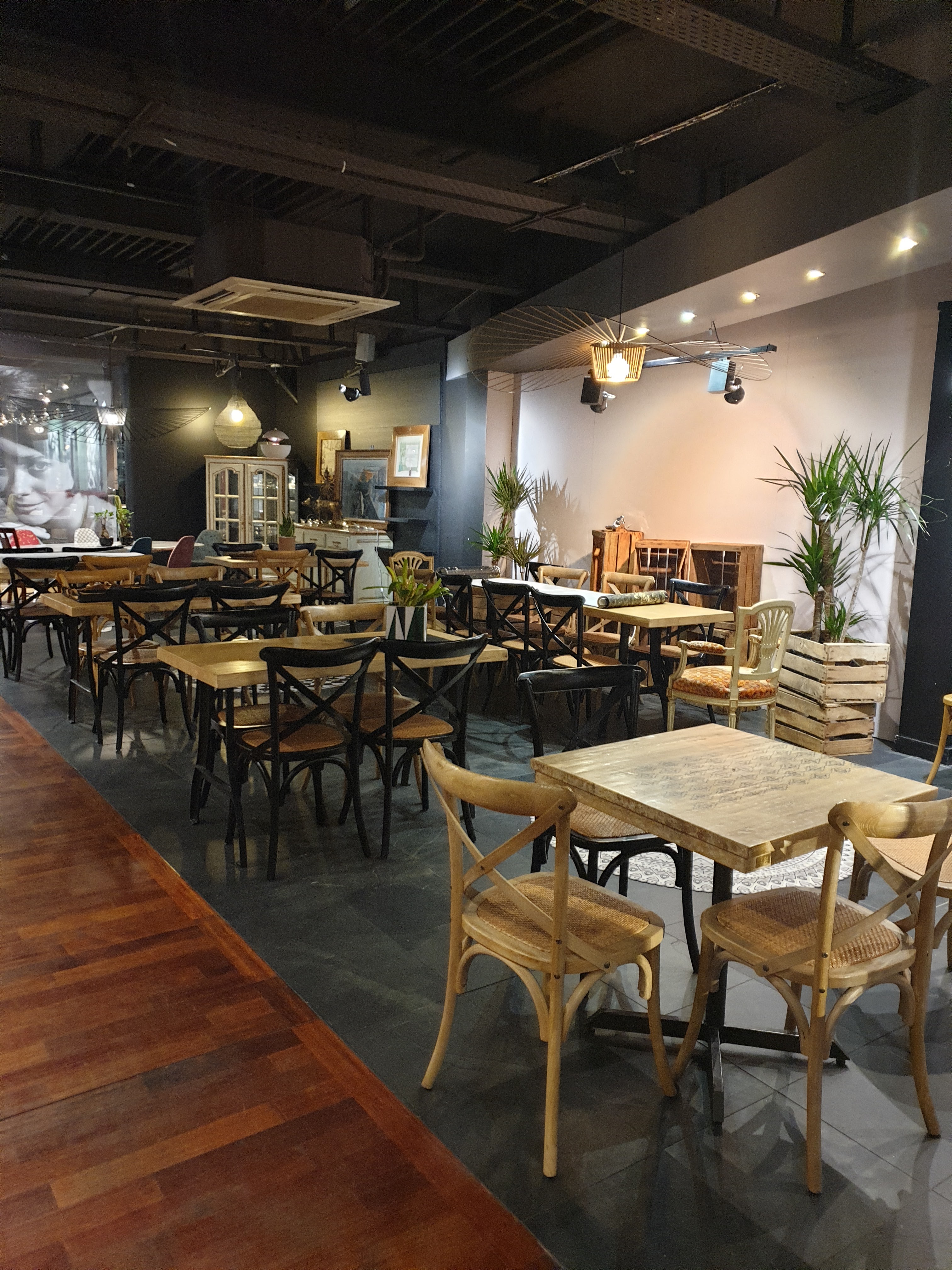 Que dire ....un endroit improbable..au fond d un magasin de meuble chic..vous avancez et là bar et restaurant très agréable à regarder ..des tableaux d artistes encore inconnu accrochés au mur ..la déco vient directement de leur magasin ...placement de leur produit qui est magnifique mais chère pour le porte monnaie.le personnel est très professionnelle...vous pouvez demander en cuisine de vous retirer de la viande ..et vous avez un plat végétarienne ..cela à été mon cas pour mon entrée..j ai trouvé le geste super pro 👏👍le tiramisu passe crème un délice 😁😁 il faut le faire au moins une fois ...de préférence en été car il y a une terrasse cachée magnifique avec palmier..J ADOREE😁😁😁😁