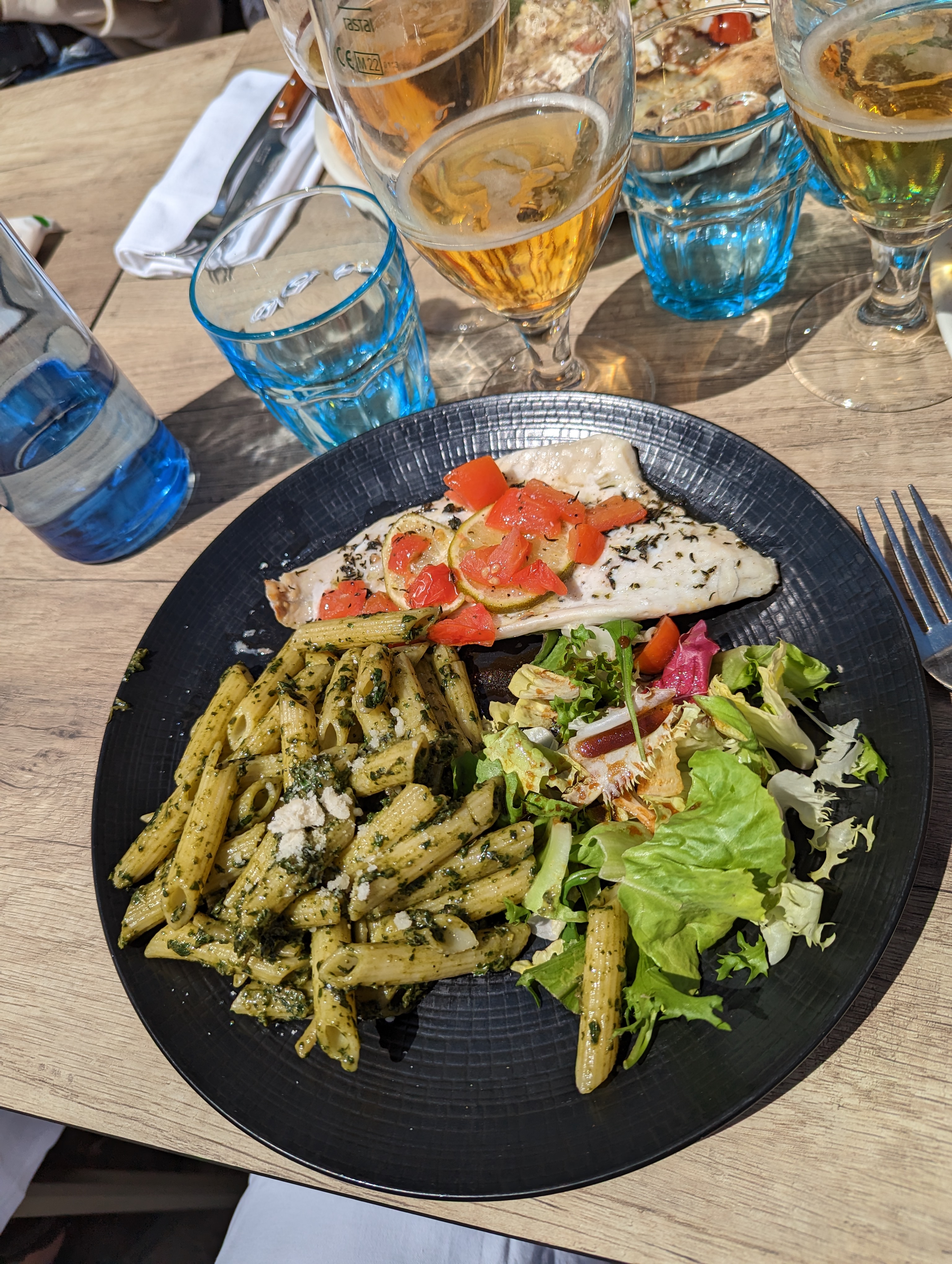 Déjeuner à 2 en terrasse avec assiettes de jambon et plats. L'assiette de jambon était bonne et avait des quantités généreuses. Les carbonara était très bonnes ainsi que le carpaccio servi avec une portion de pâtes au pesto ce qui est plus qu'appreciable. Le service était très rapide et les serveurs étaient souriants et efficaces. Très bon moment, merci à toute l'équipe.