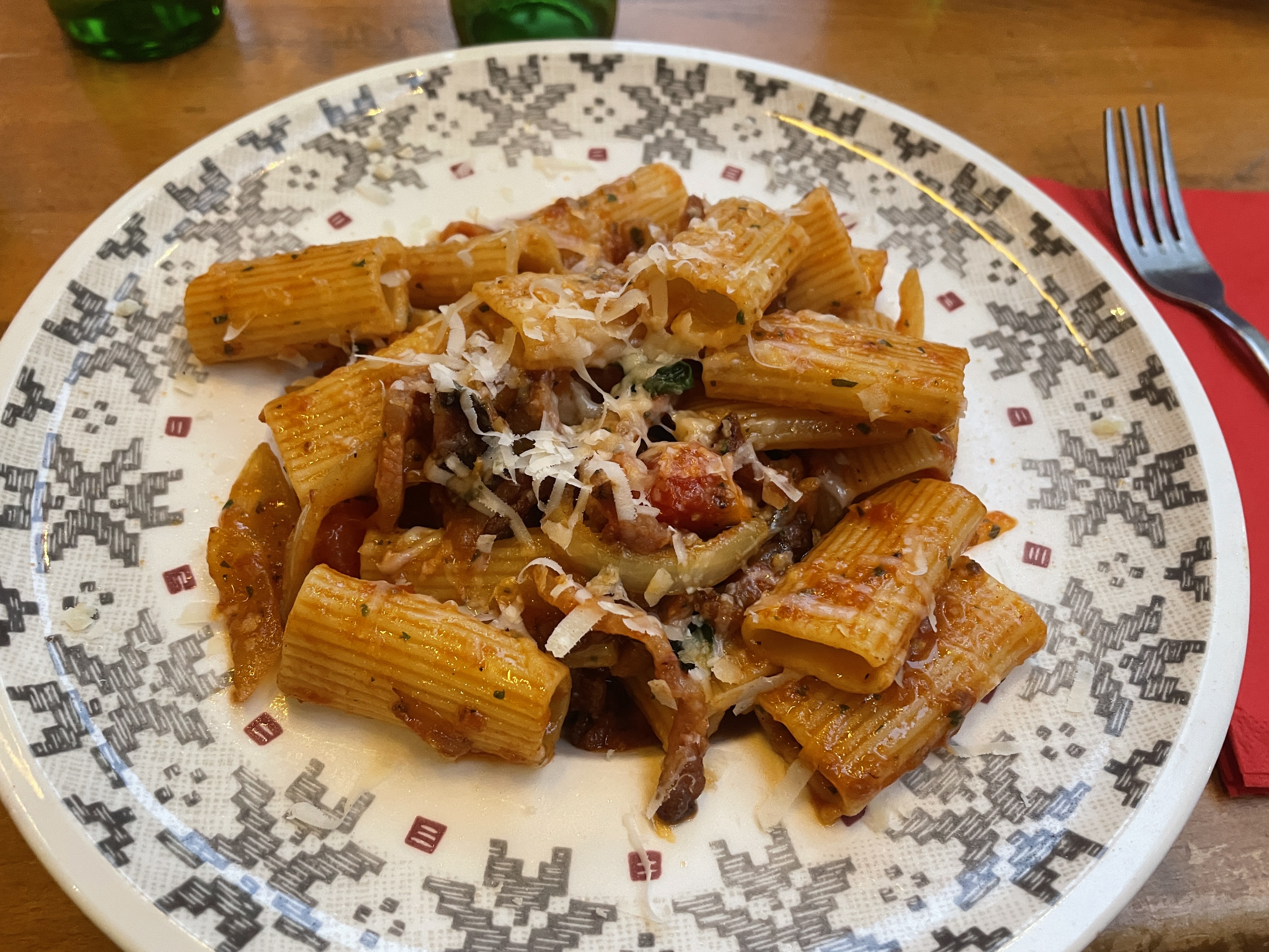 Pâtes à la carbonara un peu trop salées. Vin un peu cher. Ali