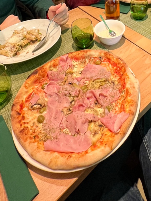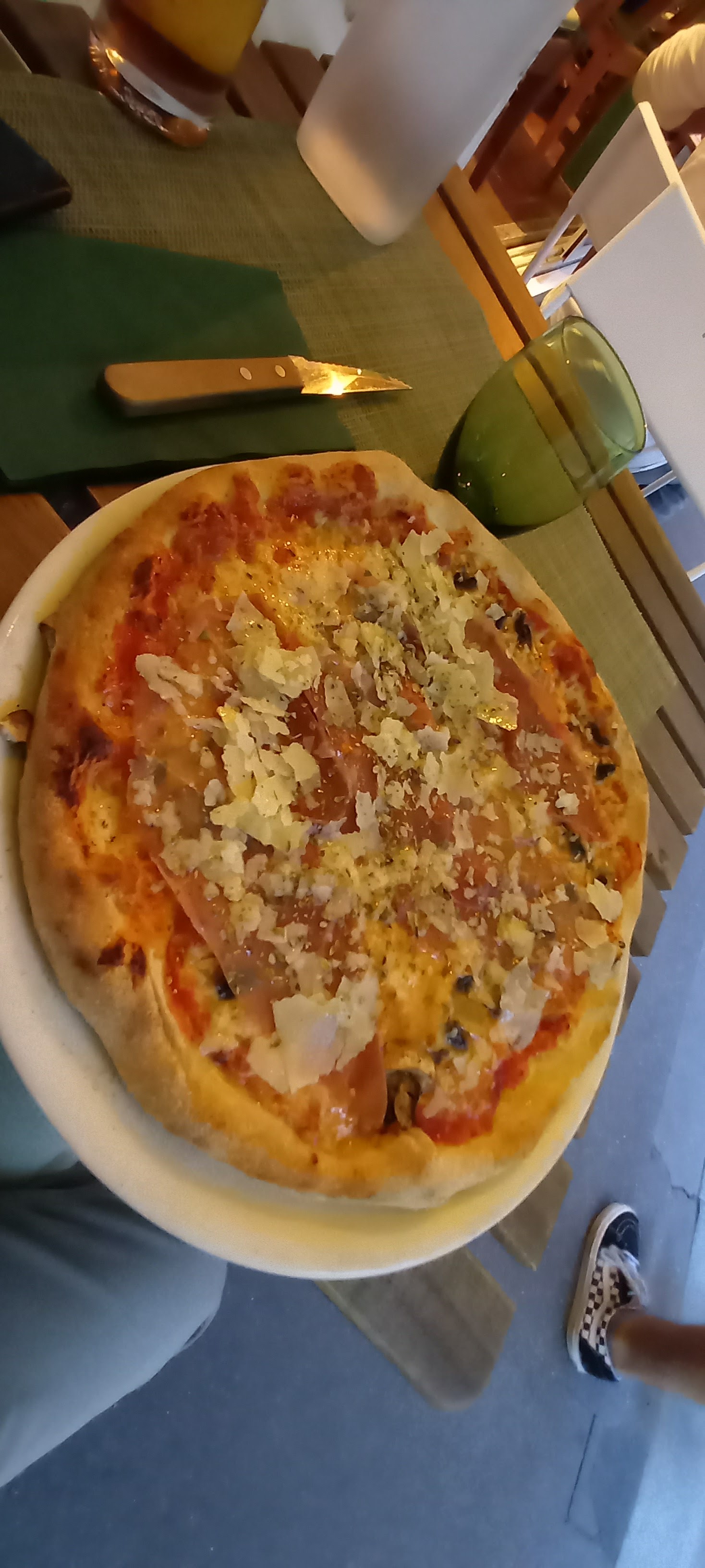 Surpris par la bonne qualité de la garniture, du jambon probablement à la coupe bien meilleurs que ce que l'on trouve habituellement dans les pizzeria. Fromage tres bon aussi, plat très copieux. Excellente surprise.