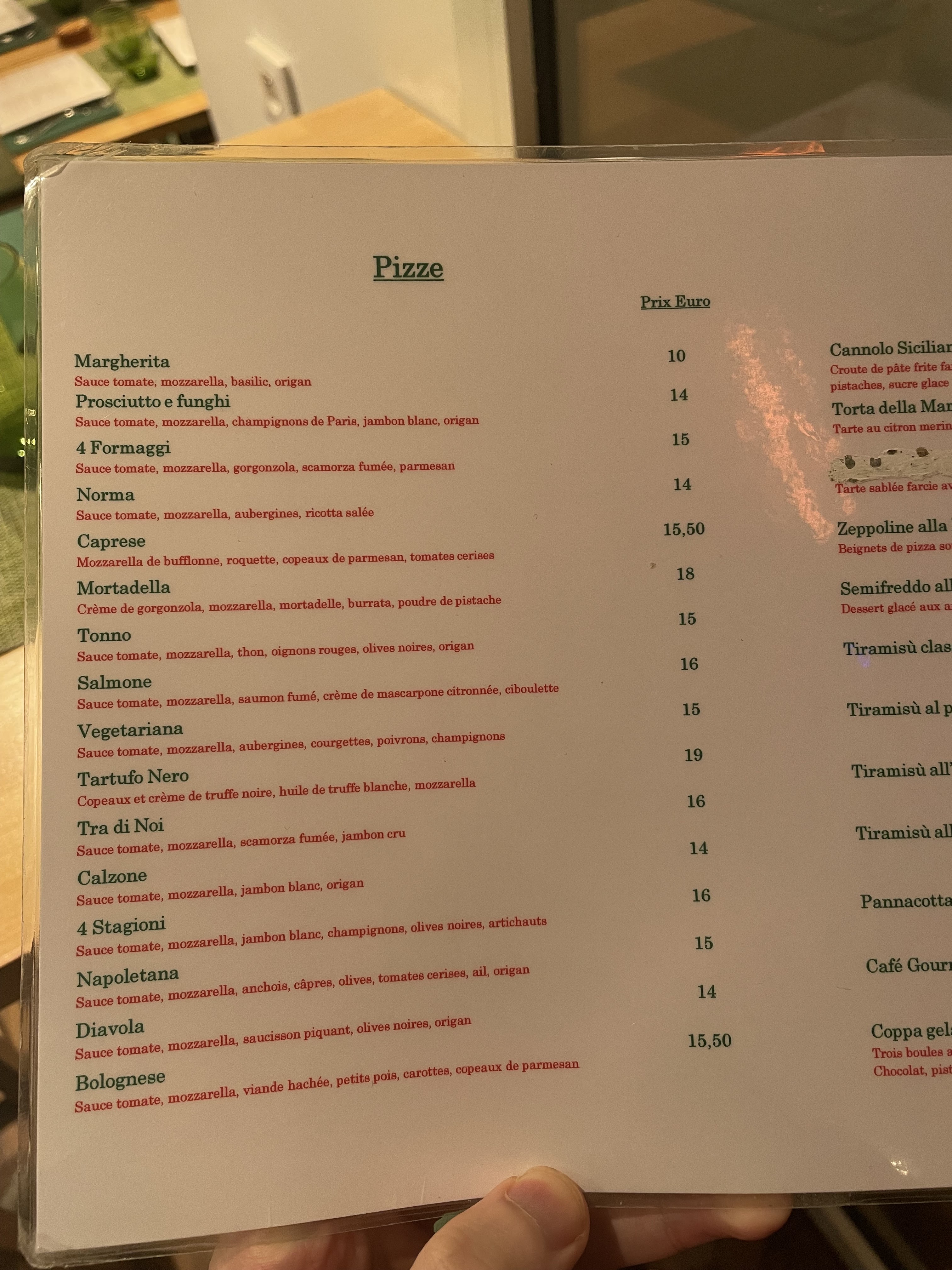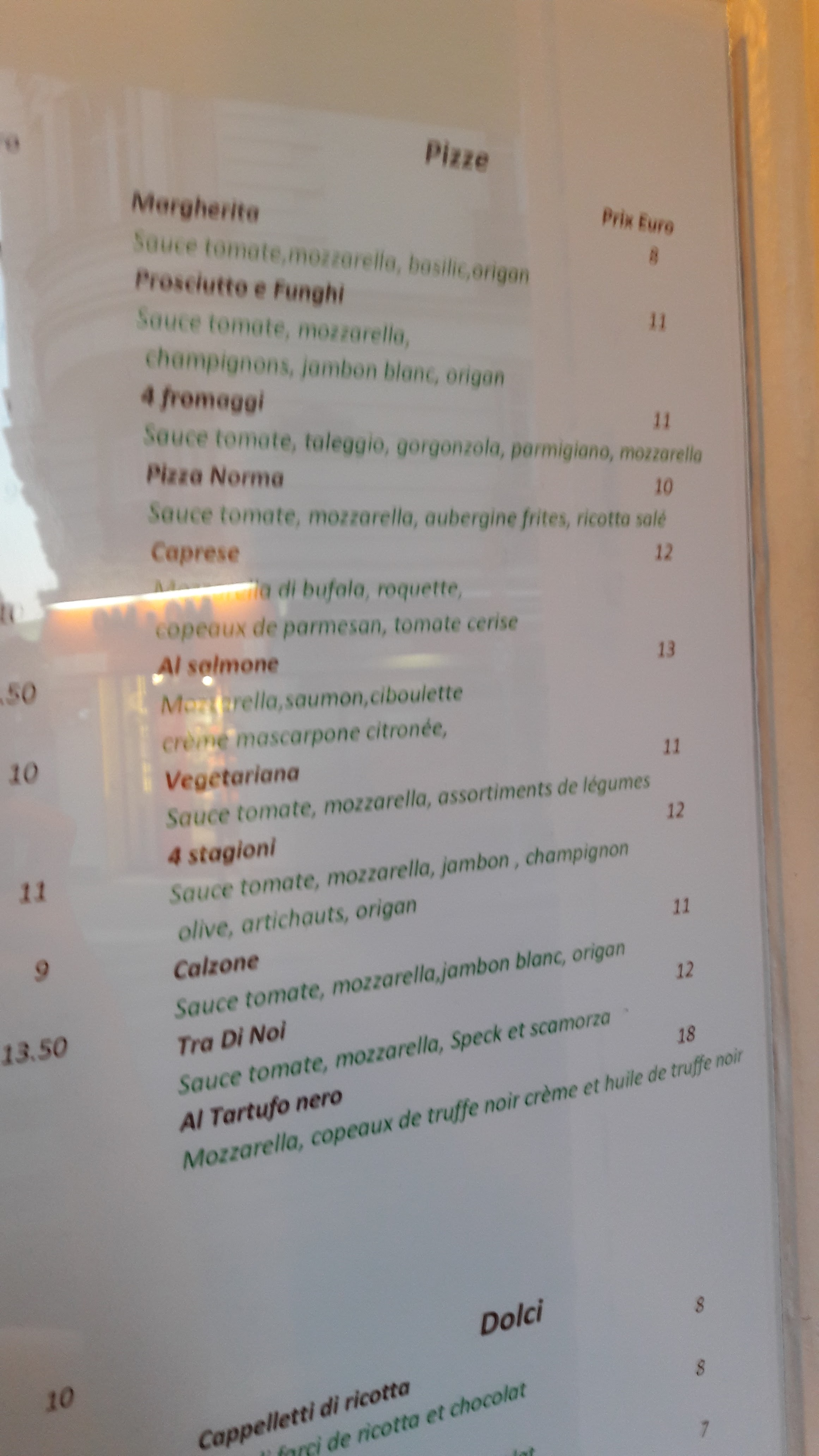 Merci pour avoir baissé le son de la musique c’était vraiment très très très top ! Le Lambrusco était succulent et BIEN FRAIS. Les antipastis étaient incroyables !!!! Les pâtes étaient ok et pizza très bonne ! Tiramisus très très bon ! Pas du fake tiramisu en bombe !