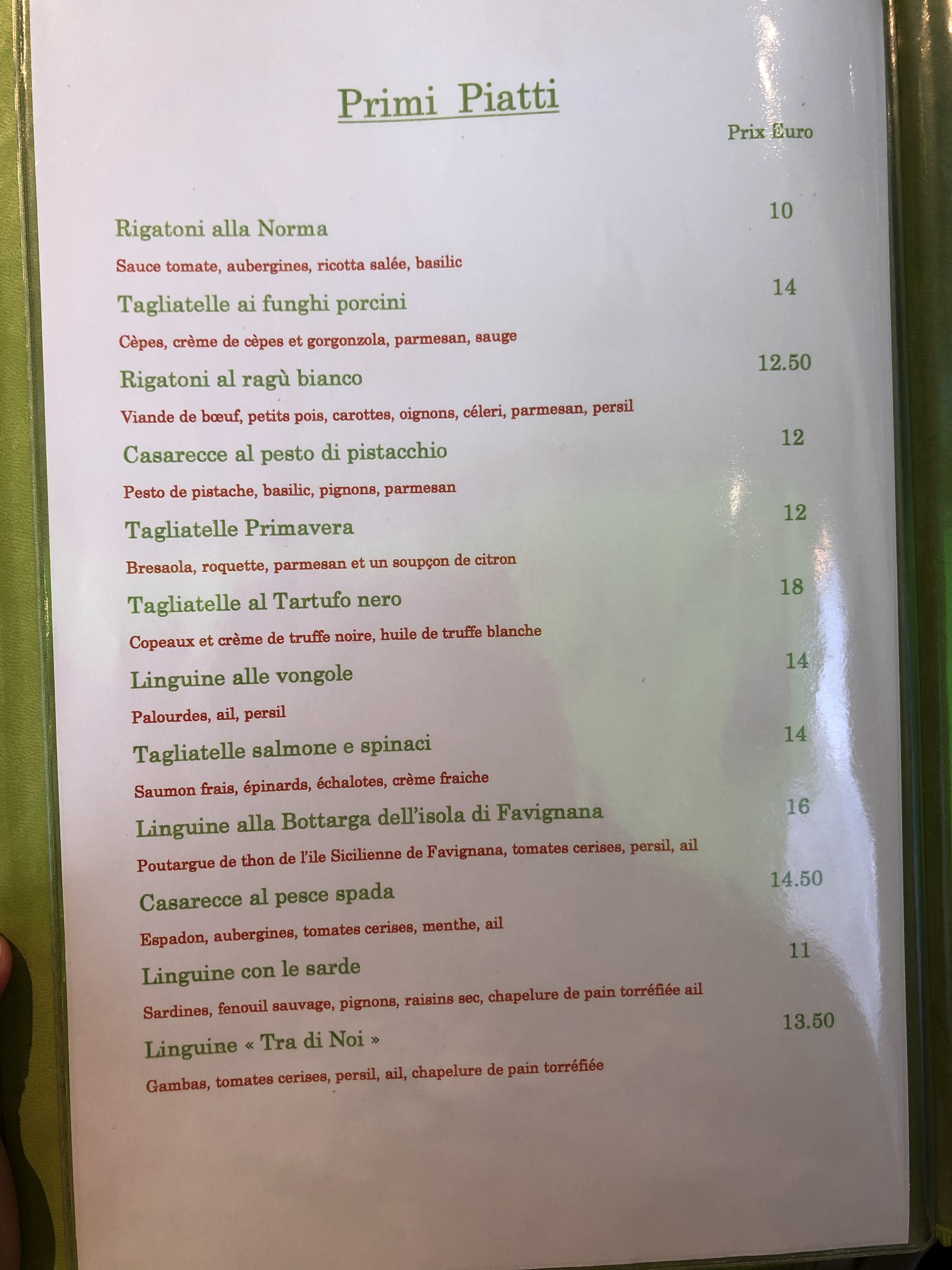 Il y a pas un restaurant comme Tra di Noi dans toute Paris. C’est la que vous allez manger de la cuisine sicilienne 100% authentique dans une atmosphère chaleureuse grâce à Valentina e Emmanuel. Les produits sont frais et excellents. La vraie découverte ça sont les spaghetti bottarga : un plat typique pas trop connu, essaye le ! Ne oubliez pas les desserts de Valentin : délicieuses !!!