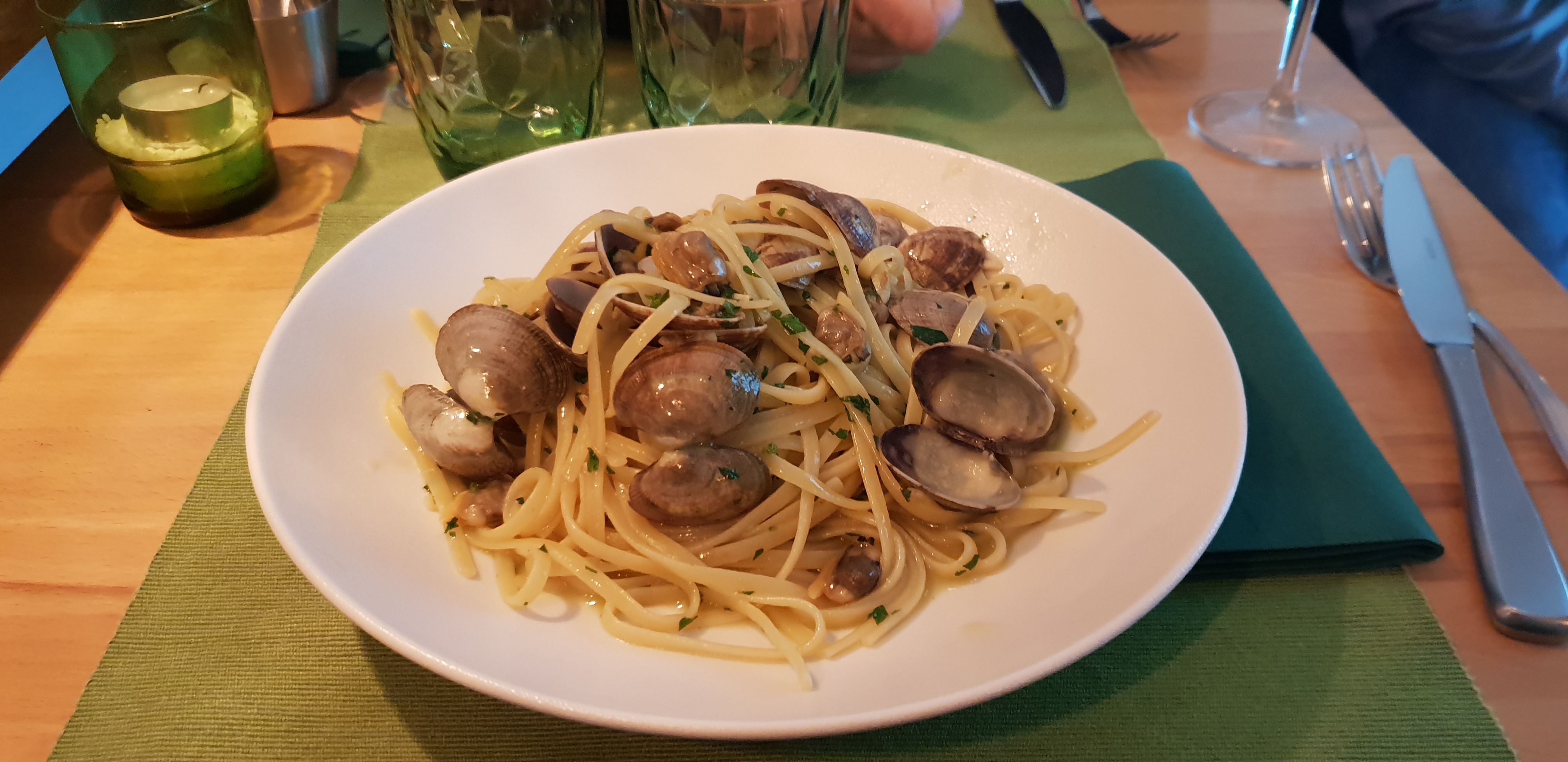 J'adore leur Linguine allo scoglio : Gambas, calamars, palourdes, moules, seiches, tomates cerises, persil, ail. C'est riche en goût de fruits de mer relevé au persil et à l'ail.