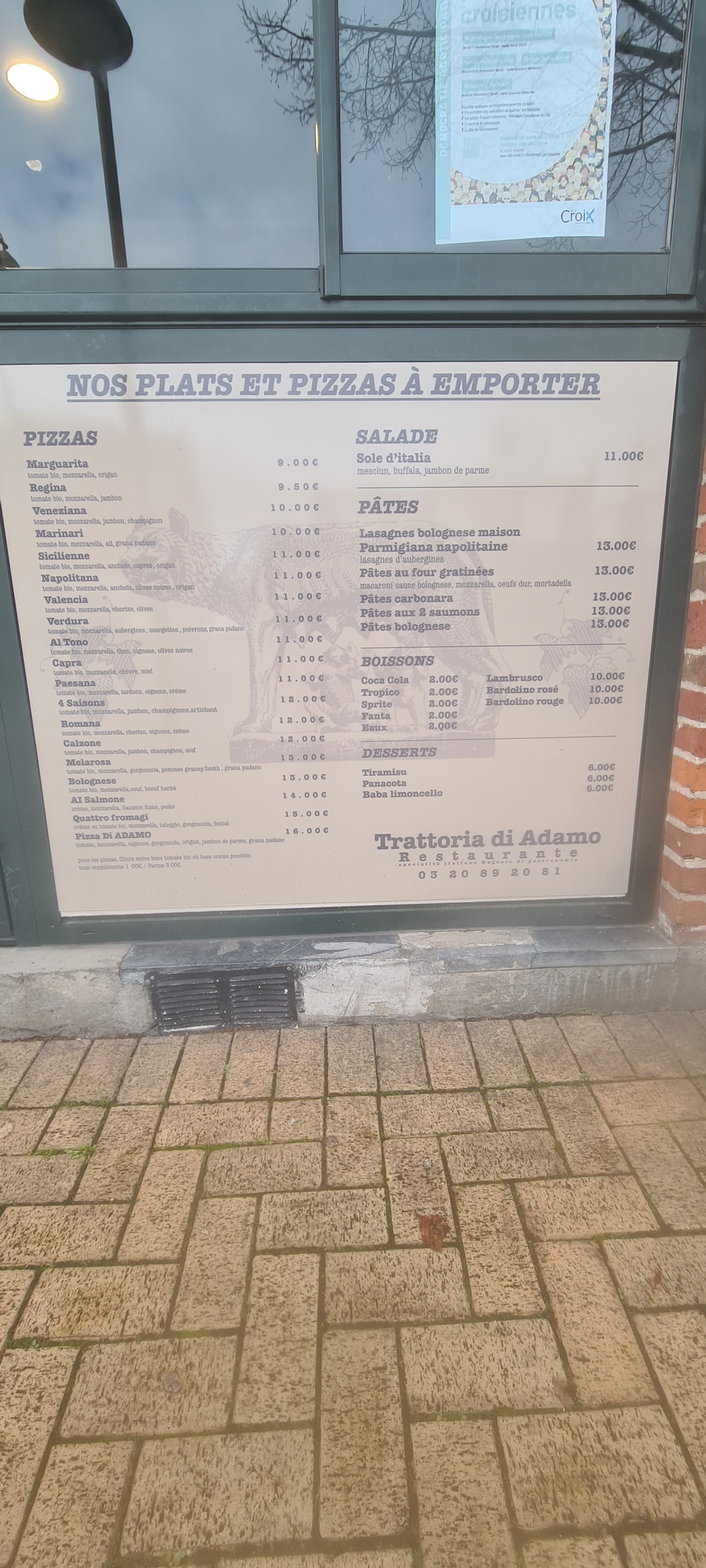 Enfin un italien où l on mange bien. Il y a les traditionnelles pizzas mais elles sont bien garnies et ont un goût different, travaillé, qui fait envie d en reprendre. Certaines sont en forme de carré ou d étoile. Ce n est pas le cas partout loin de là. Il y a des plats originaux comme les pâtes au saumon ou les lasagnes à l aubergine. Le chef prend plaisir à renouveler sa carte avec un plat du jour intéressant. Cela plaît beaucoup. Résultat : c est vite complet. Il est prudent de réserver. On vient là pour bien manger pas pour fêter la saint Patrick ou autre chose. Le service est efficace. On n attend pas longtemps même si c est complet. Côté dessert j apprécie le baba au limoncello. J aurais aimé y trouver la Soupa Inglese que j ai mangée à Naples mais l Italie est l Italie. A défaut de pouvoir y aller, faites un tour un midi ou un soir à la Trattoria du Adamo et régalez vous.