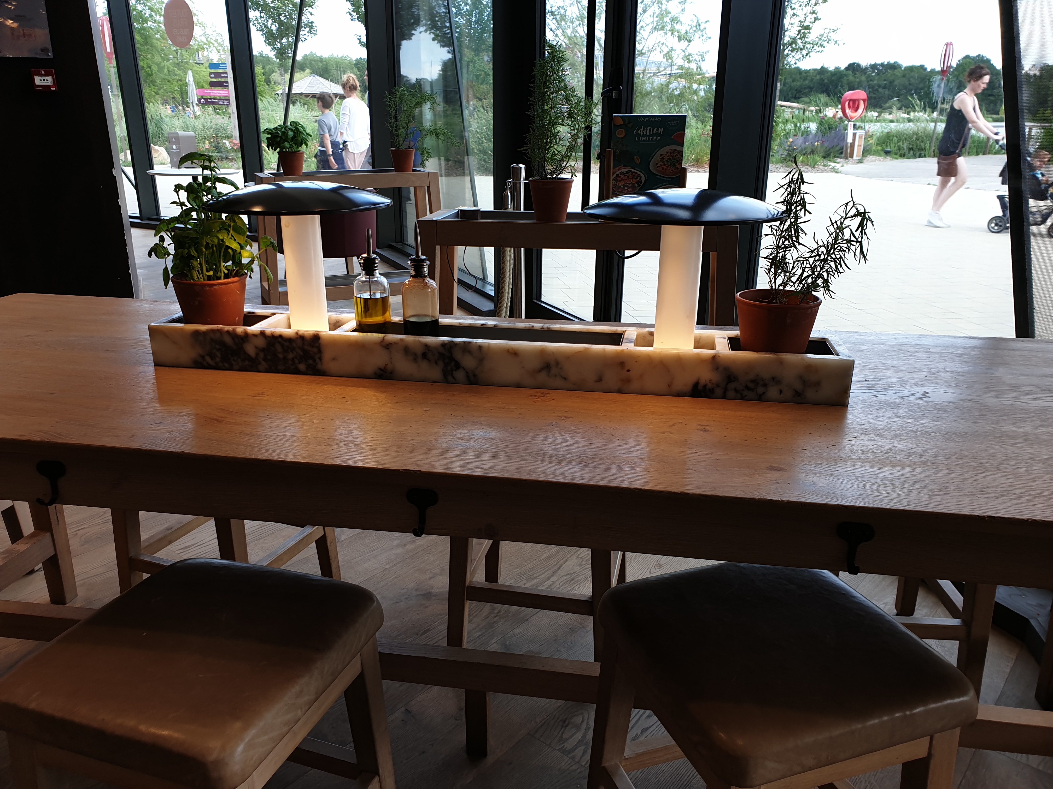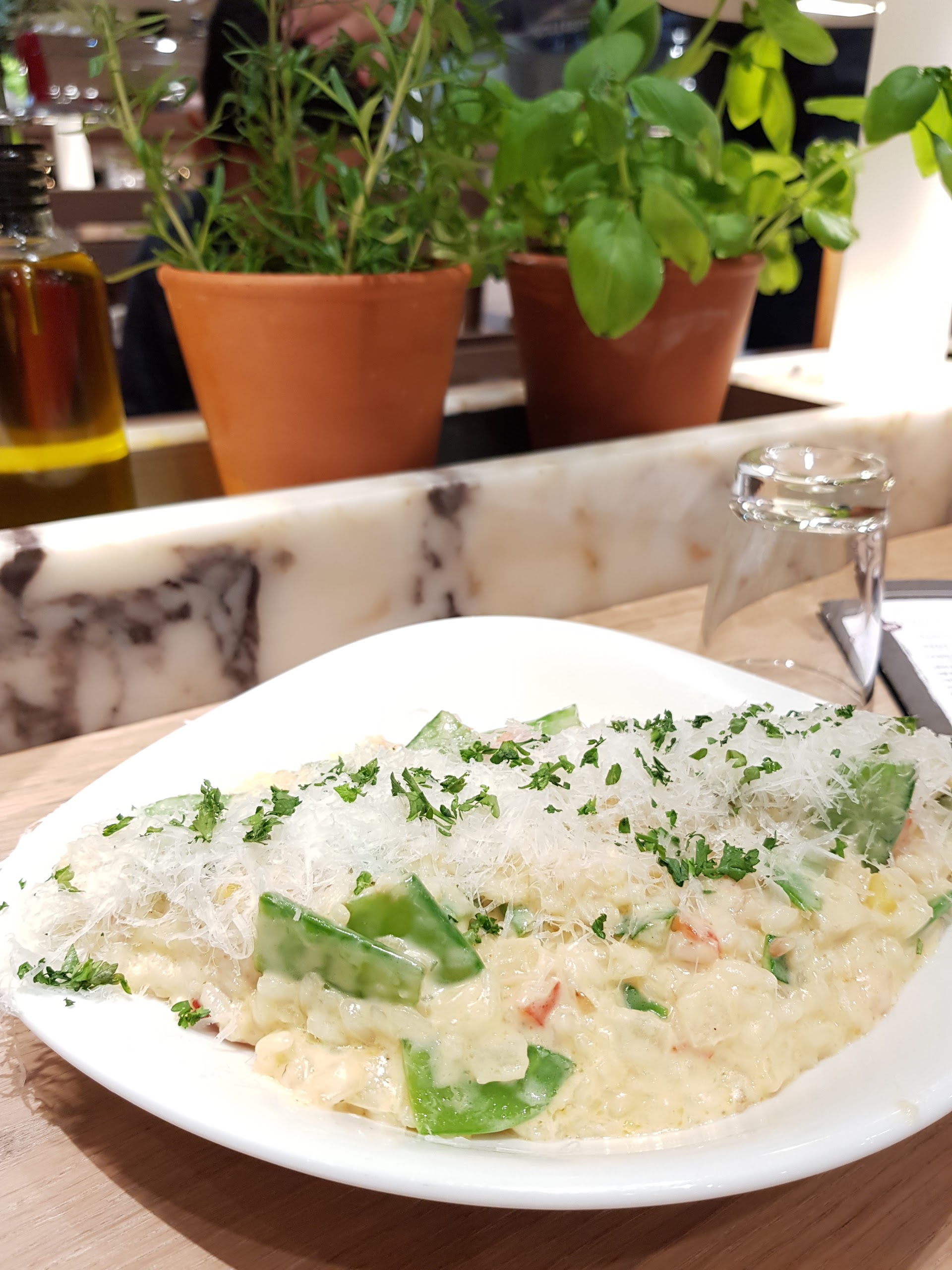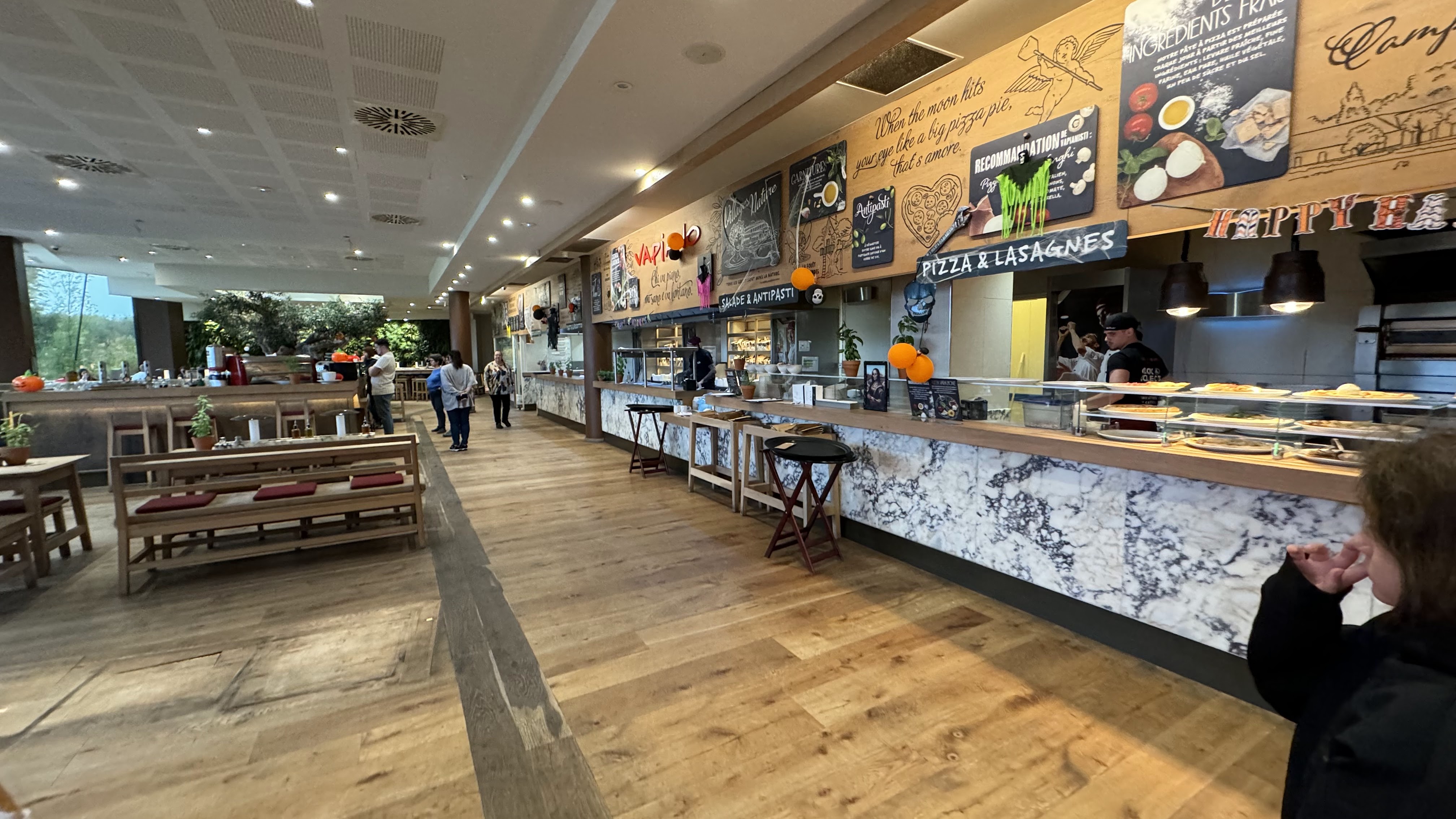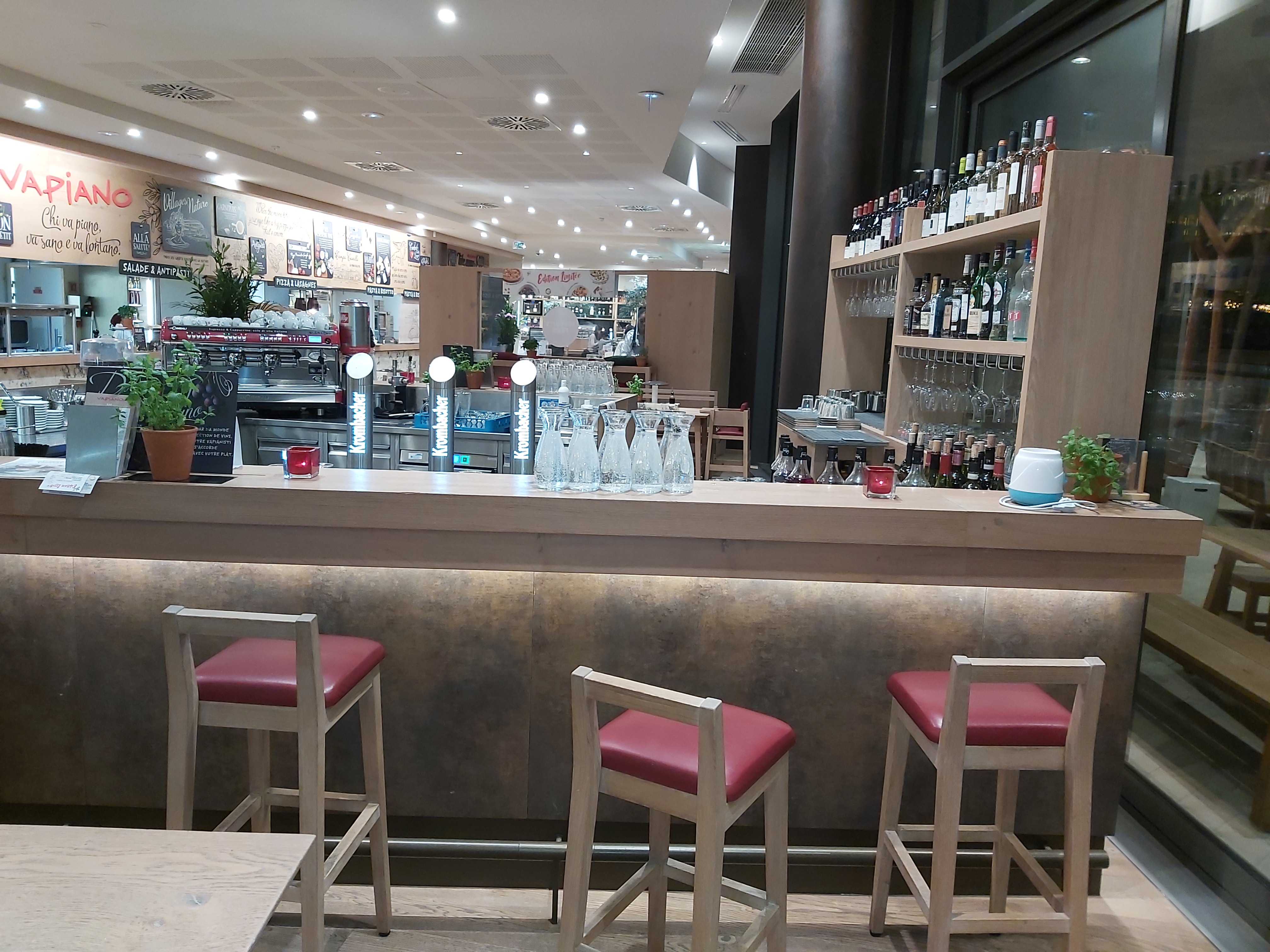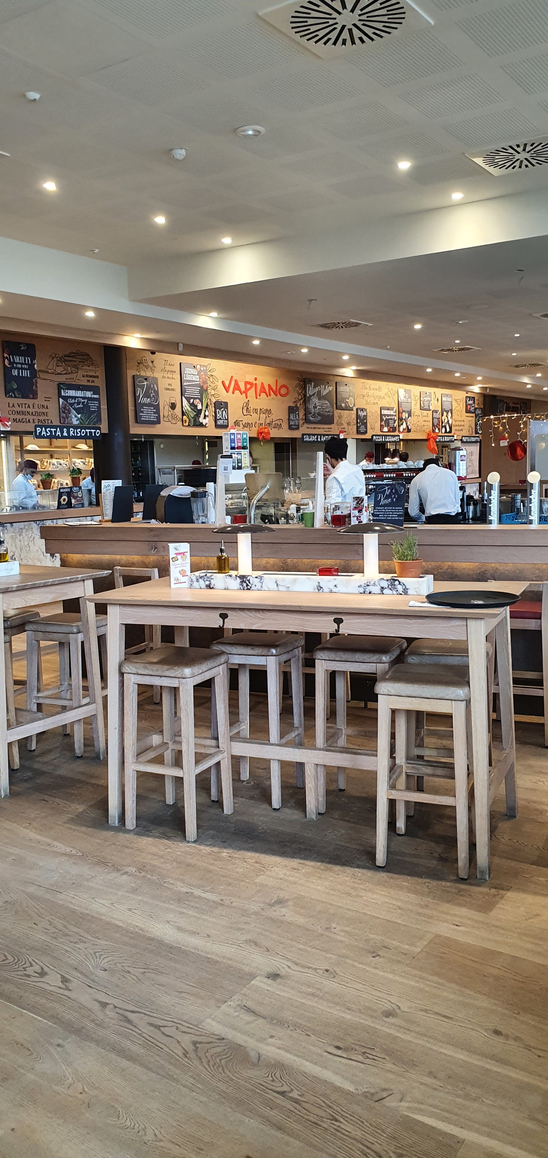 Magnifique endroit dans merveilleu lieu.. aliments frais, deco sympa avec le mur vegetal et l arbre dans la salle de resto. Les herbes fraiches à disposition au meme titre qu un assaisonnement donne un cote special... cest un restaurant a la flunch (sans le « a volonte » italien ultra classe! Le coin jeux enfant -voire grands- avec un mur de tableau a crai ou on peut laisser un petit message... le seul bemol : wc sans desinfectant (a contrario de tous les toilettes du village nature) ni meme de protection d hygiène, et surtout sales.. pas de papier toilette.. le pire: pas de savon dans les 2 bacs, heureusement qu il en restait dans le toilette accessibles aux personnes en fauteuil! Mais bonne note quand meme , la plus part du personnel est sympa :) Ps: attention. Fermeture a 23h, mais ne servent plus des 22h30!!! Si vous y allez bientot : A gouter : pizza thon asperge! Et crumble rhubarbe fraise =D @vapiano d ailleurs, ce serait sympa de faire quelques exemplaires sous plastique histoire qu il soit réellementa emporter le dessert.. sinon, prevoir une consigne de 2€ et donc de forcement devoir passer redeposer le verre sans l avoir cassé entre deux.. a bon entendeur :)