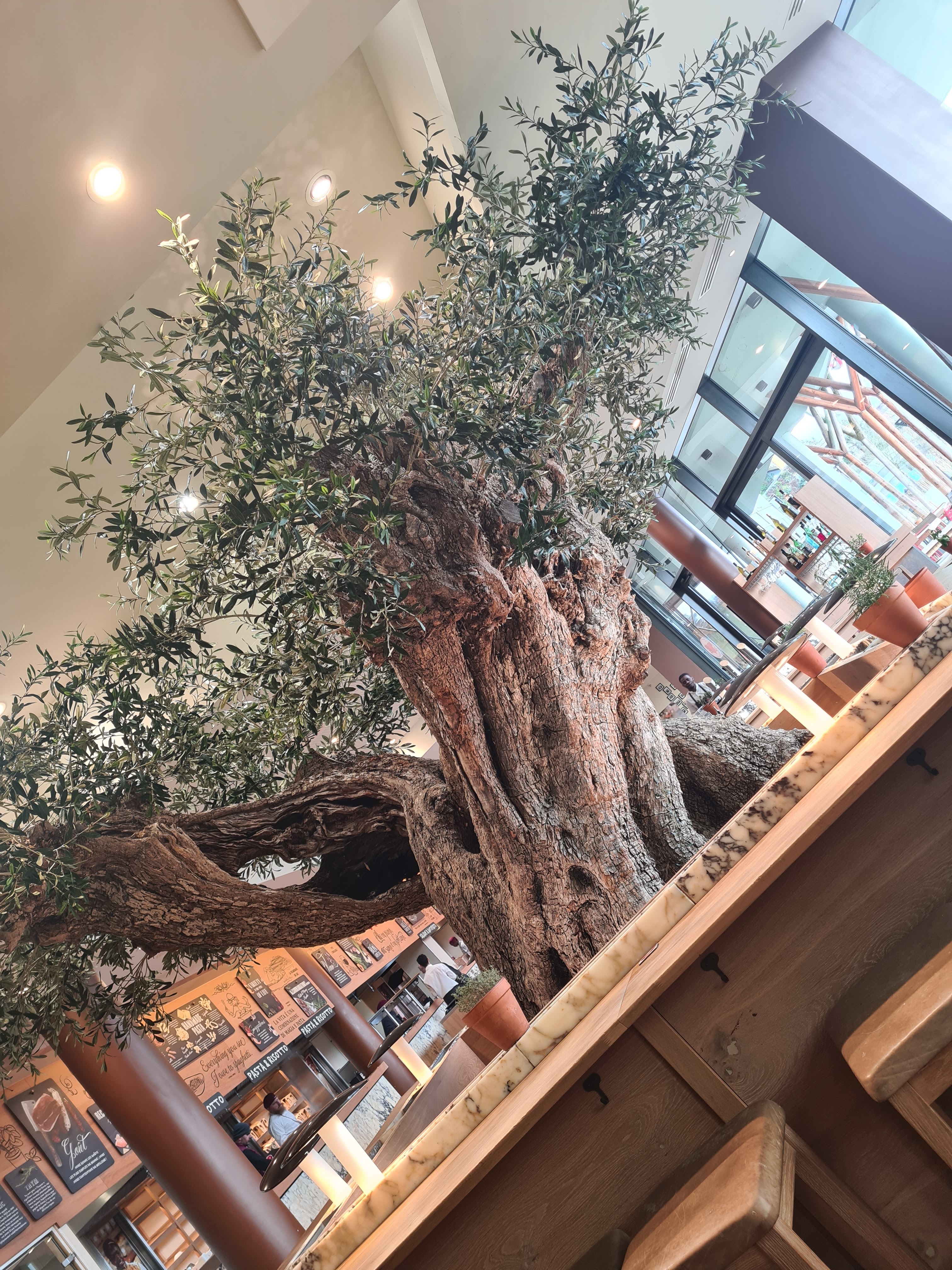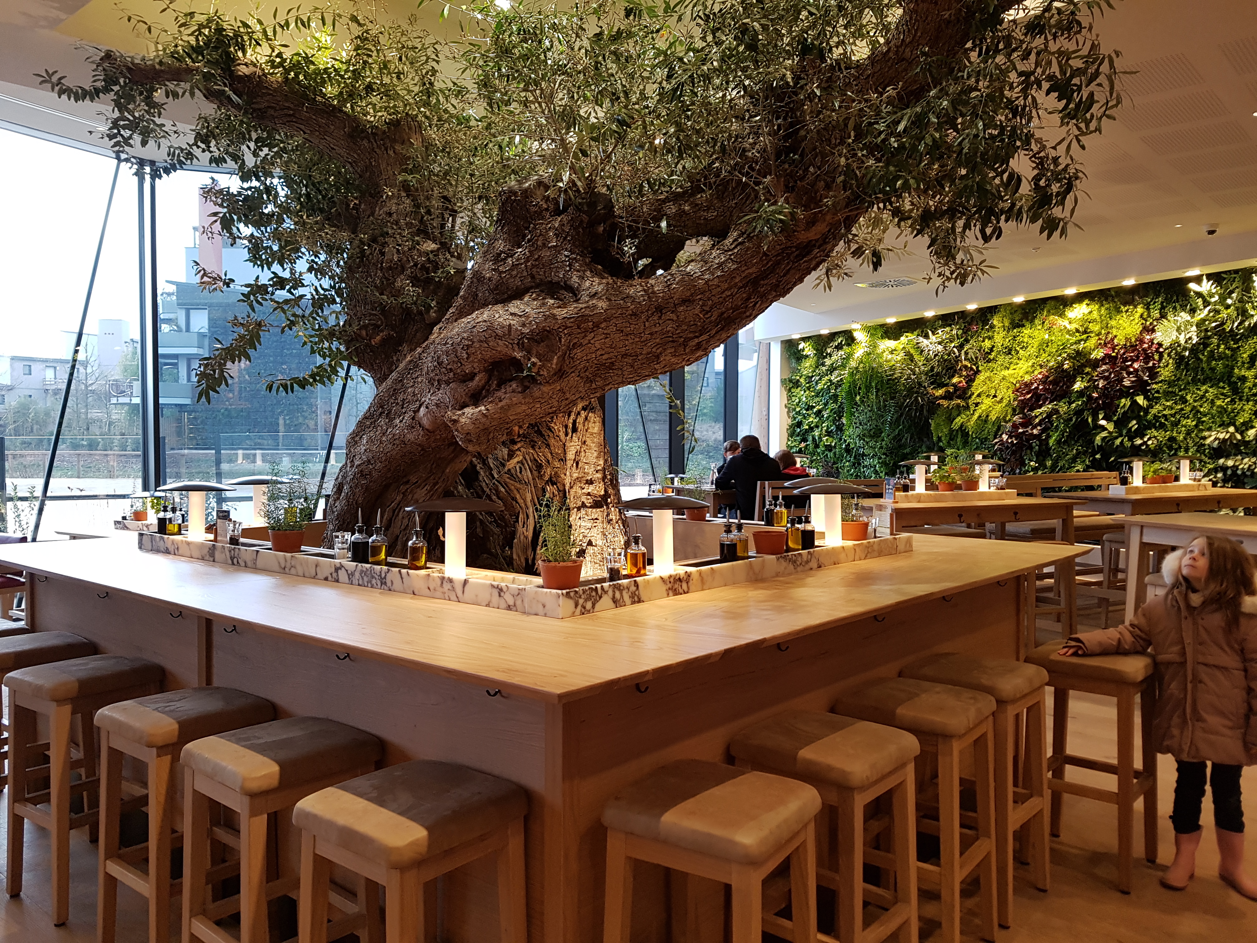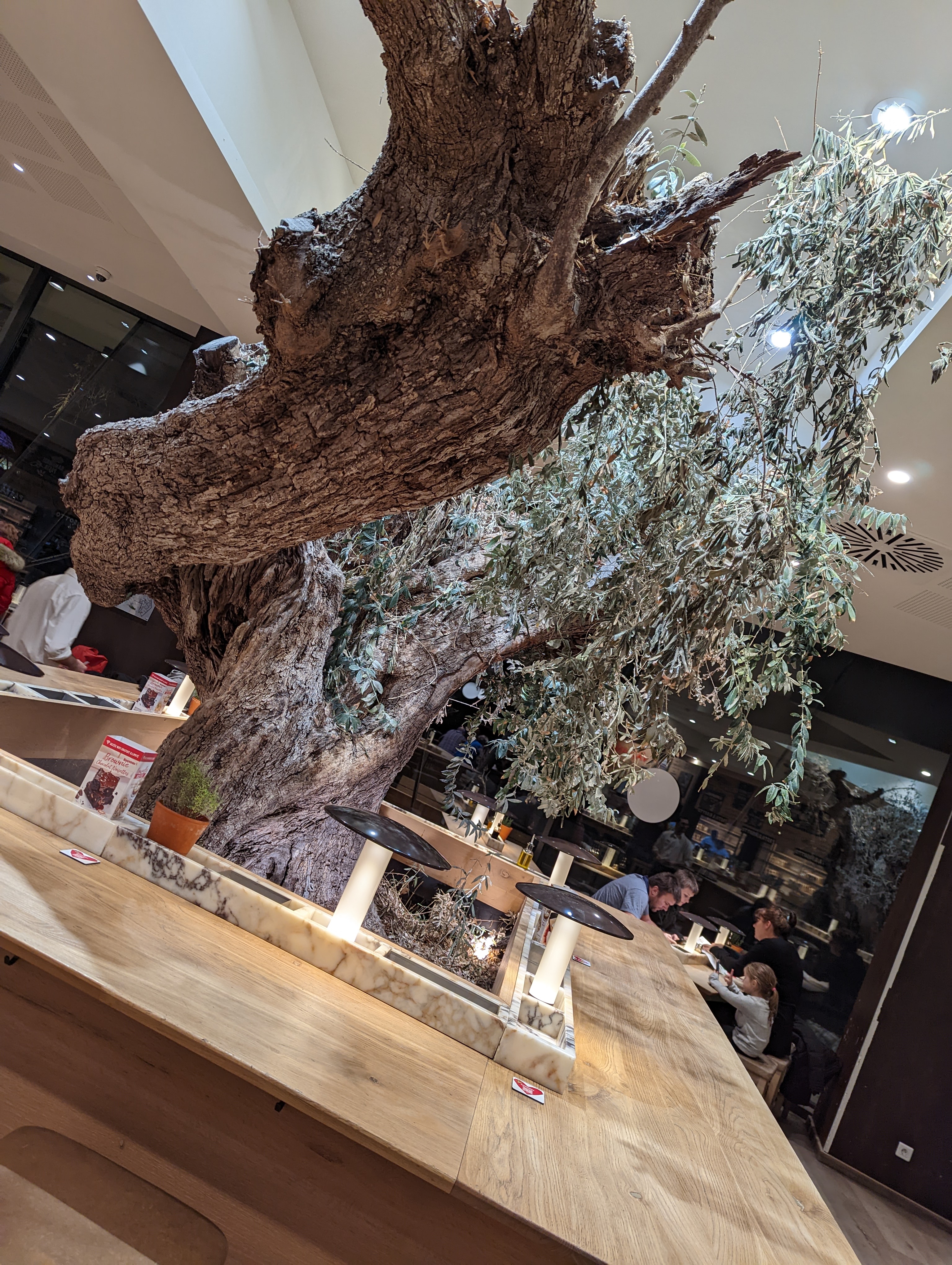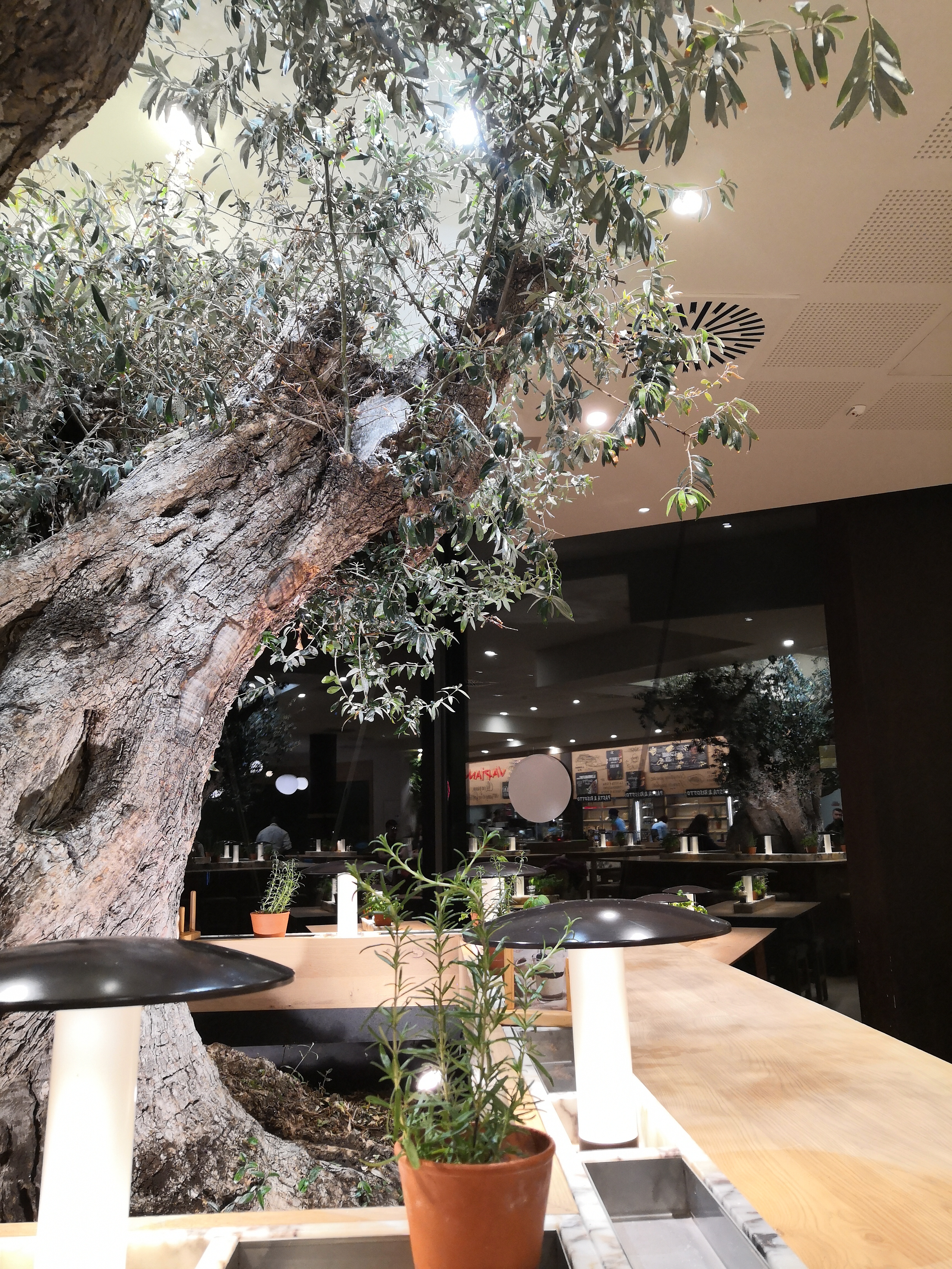 Prise en charge a l'entrée pour nous placer, service souriant, mais un trop long moment entre la commande validée/payée (en ligne sur smartphone avec QRcode sur la table) et le service. Tarifs largement trop élevés pour la qualité et la quantité des produits. Pour le positif les tables sont plutôt bien espacées, nous ne sommes pas entassés les un sur les autres. Un espace jeux pour les plus petits est disponible (avec un grand tableau noir avec craies). Quelques vrais moineaux volent dans les restaurant, trouvant refuge dans les oliviers (moins naturel eux..., du moins pour le grand... Pas été regarder le plus petit). Mais du coup les oiseaux logent dans le restaurant la nuit ?