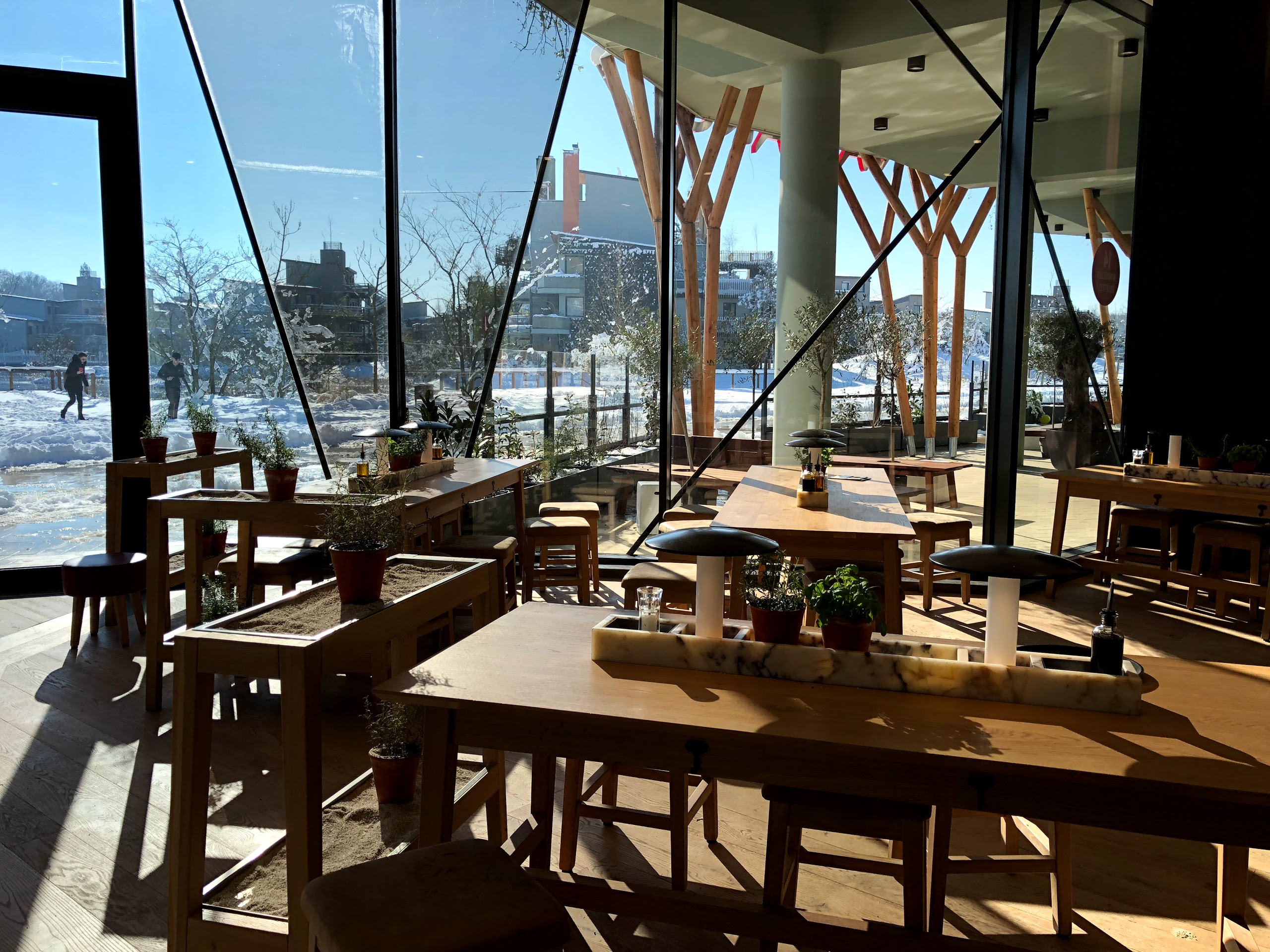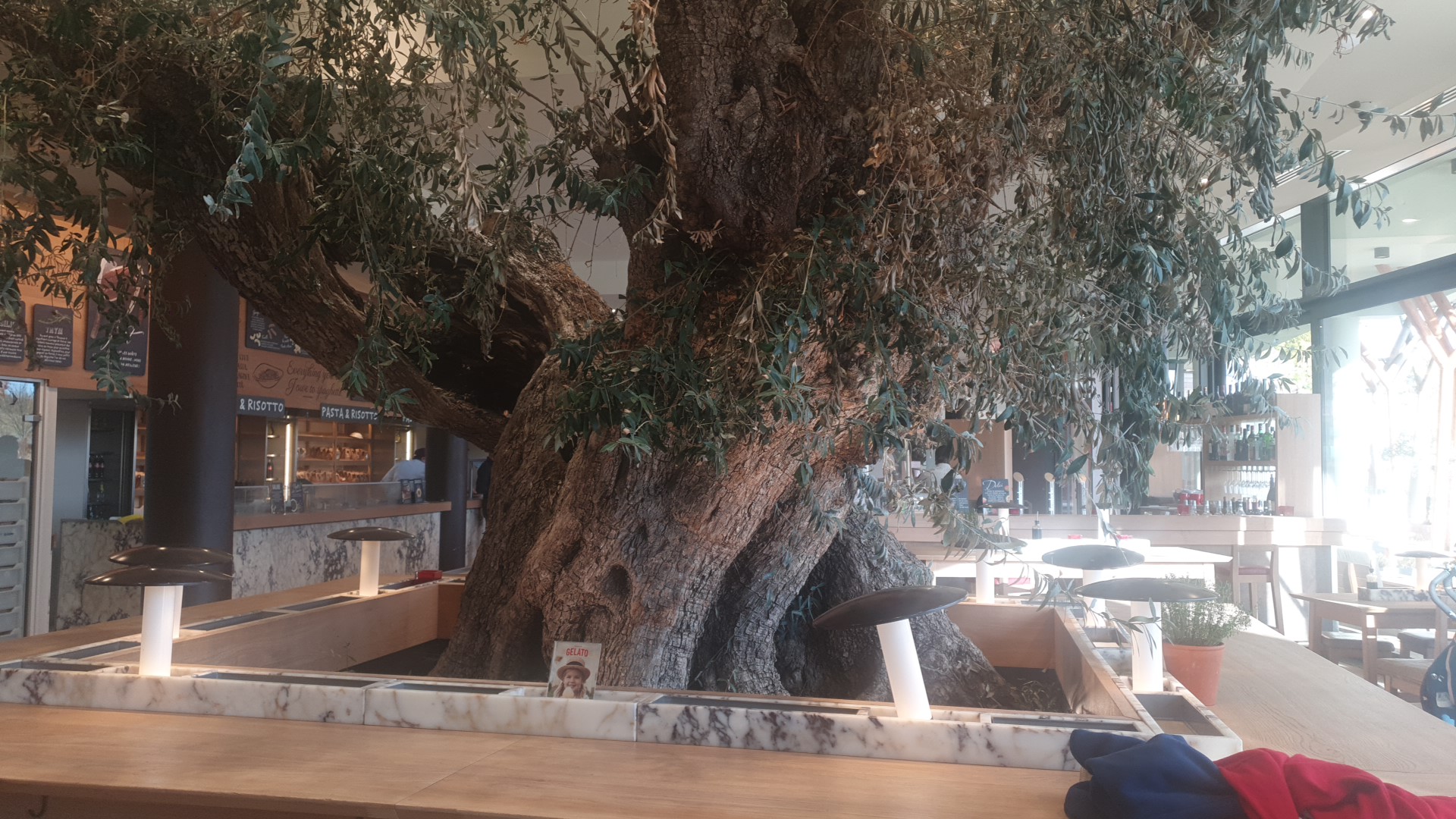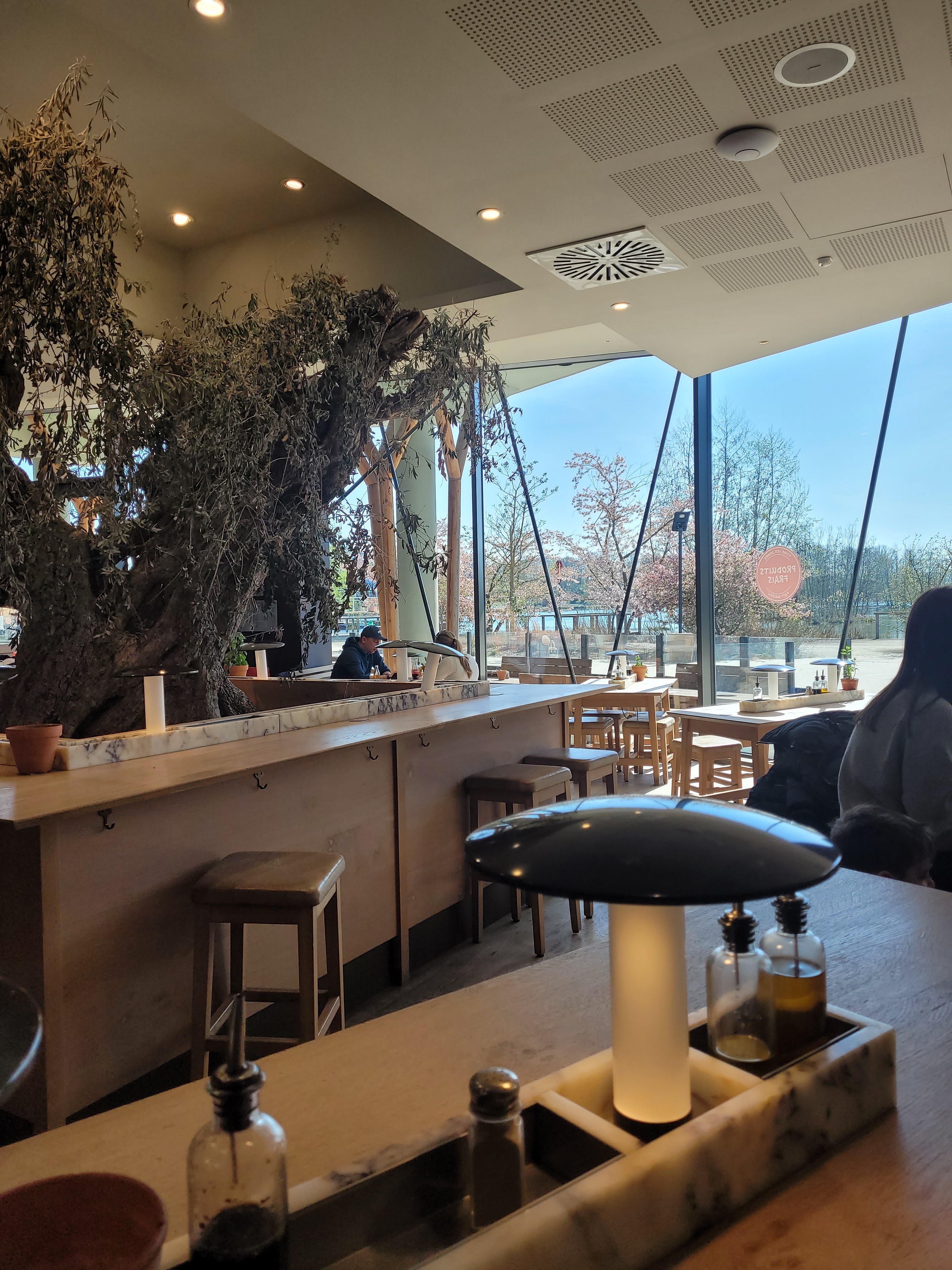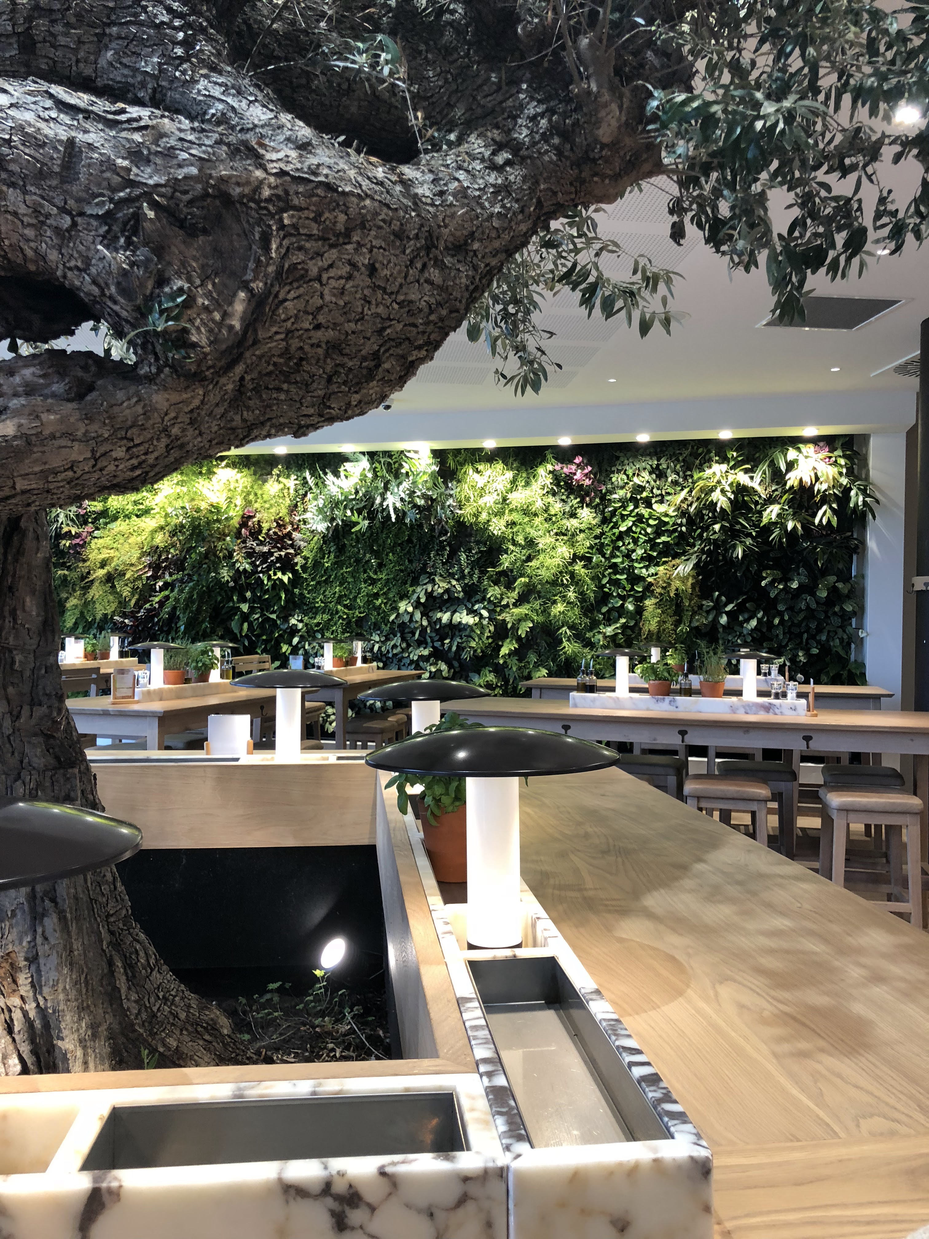 Prise en charge a l'entrée pour nous placer, service souriant, mais un trop long moment entre la commande validée/payée (en ligne sur smartphone avec QRcode sur la table) et le service. Tarifs largement trop élevés pour la qualité et la quantité des produits. Pour le positif les tables sont plutôt bien espacées, nous ne sommes pas entassés les un sur les autres. Un espace jeux pour les plus petits est disponible (avec un grand tableau noir avec craies). Quelques vrais moineaux volent dans les restaurant, trouvant refuge dans les oliviers (moins naturel eux..., du moins pour le grand... Pas été regarder le plus petit). Mais du coup les oiseaux logent dans le restaurant la nuit ?