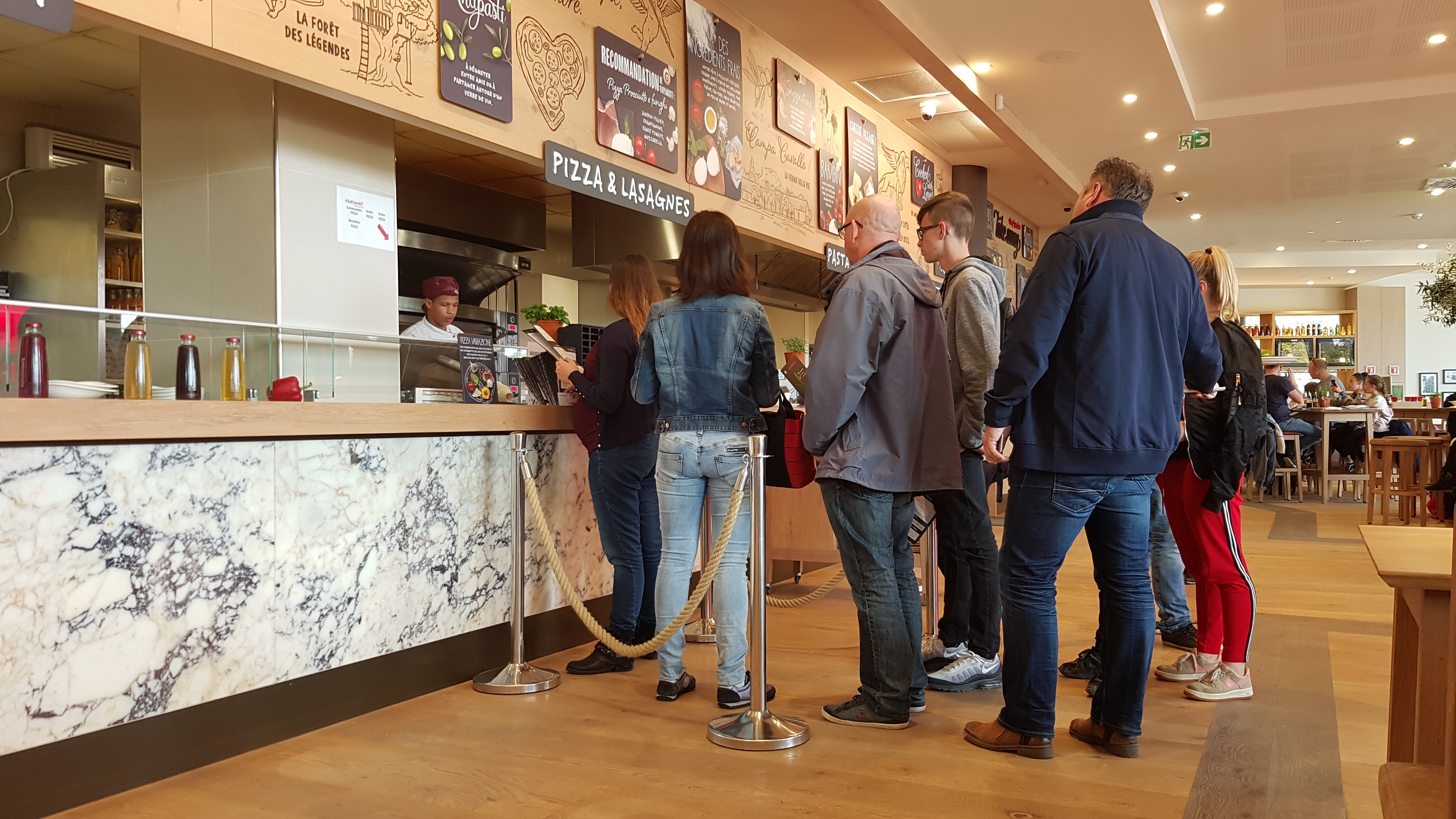 Très mauvaise expérience ce soir, 20 minutes en attente dehors devant une corde qui barrait l’entrée, personne pour accueillir les clients malgré un restaurant à 1/3 plein. Nous avons été obligé de nous énerver un peu pour que quelqu’un vienne nous voir et nous explique qu’il fallait encore attendre 20 min dehors alors que plein de tables étaient libre. Finalement à force d’insister, on nous installe sur des tables blanche qui ressemblaient à des tables de discothèque alors que les belles tables en bois étaient libres. Les pizzas ( très bonnes) sont arrivées avant l’apéro. Le fait de devoir payer avant de manger ne donne pas envie de prendre dessert ou autres consommations. Bref, une catastrophe, nous sommes la toute la semaine , nous irons manger ailleurs, j’espère que les autres resto du parc sont tenus autrement.