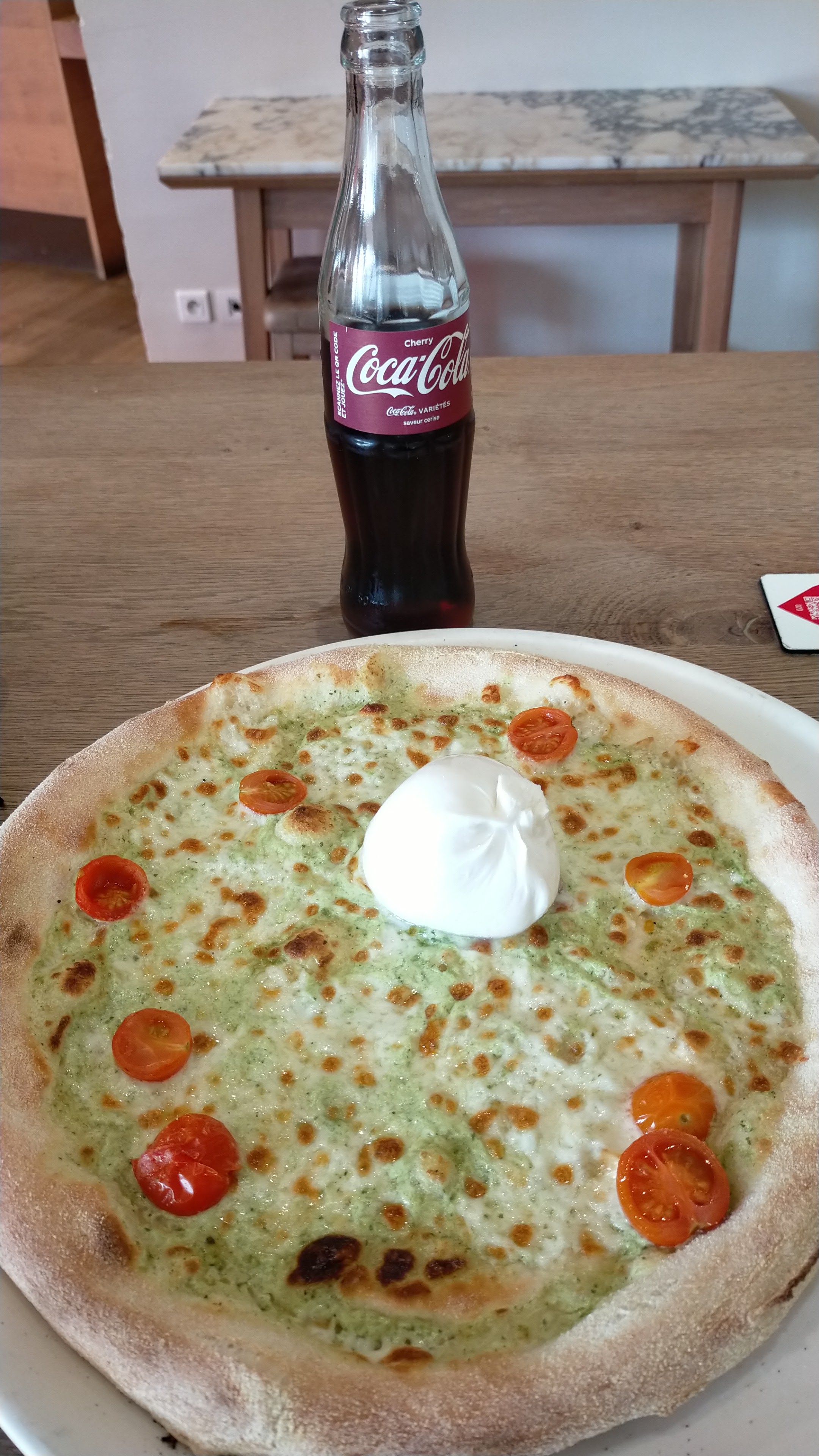 Accueillis par une personne agréable qui nous a installé et expliqué le fonctionnement du restaurant ou il faut scanner le qr code pour commander et payer. Nous avons commandé 4 boissons et 4 pizza. Les pizza sont arrivées en 1er, au bout d'un moment je me lève voir au bar pour nos boissons et la serveuse avait l'air perdue elle retrouve le ticket de commande je lui dis oui c'est ça et la même pas un excusez nous je vous prépare c'est moi qui lui dit c'est bon je peux retourner à la table. Ensuite elle arrive à la table avec nos boissons je lui dit on avait été oublié ? Ce que je peux comprendre ça arrive et la elle me répond on avait plus de verre au lieu de s'excuser. La bonne blague derrière le bar c'était remplie de verre. Sinon les pizza étaient bonnes.