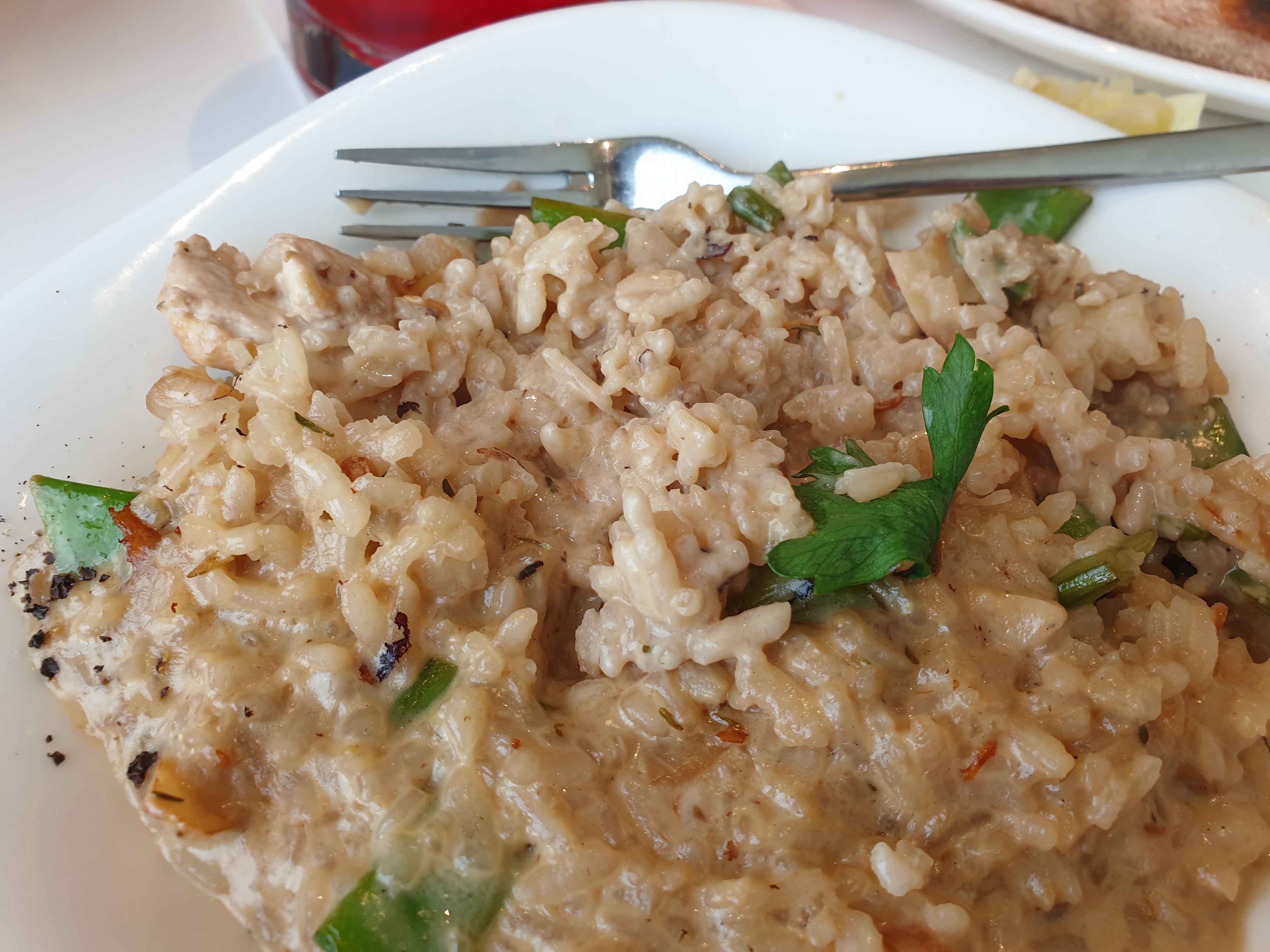Le restaurant est spacieux et agréable Pour ce qui est du cadre. Les commandes se font via l'application, je ne suis pas hyper fan, je préfère généralement les commande avec une vraie personne en face de moi mais admettons :-) Par contre alors que j'essayais de commander via leur appli qui plantait, ma petite de 4 ans m'a fait part d'un besoin urgent. J'ai demandé où se trouvaient les toilettes et je me suis fait remballer car seul ceux qui ont commandés sur place ont accès aux toilettes... Pour un restaurant faisant partie d'un complexe qui travail avec Disney, j'ai trouvé ça très bof... (D'autant plus que l'état de propreté des toilettes laisse vraiment à désirer) Le personnel est plutôt sympa mais sans plus. Pour ce qui est de la cuisine en elle même, ce n'est pas de la haute gastronomie, mais c'est bon! J'ai commandé le risotto au fromage un soir, il était délicieux. J'ai recommandé le même le midi suivant, il était beaucoup moins bon, mais on va dire que ce sont les variations normales d'une cuisine. Leurs pizzas à pâte fines sont assez bonnes je trouvais. Le prix est raisonnable par rapport au complexe du parc.