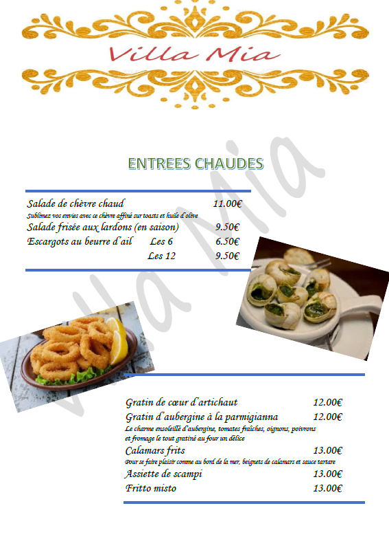 J'ai récemment dîné au restaurant Villa Mia et je suis enchanté de partager cette expérience exceptionnelle. L'ambiance authentique et chaleureuse m'a transporté en Italie, le service attentionné et compétent a agrémenté notre repas, et la cuisine divine, en particulier les pâtes fraîches et les pizzas. Je recommande vivement