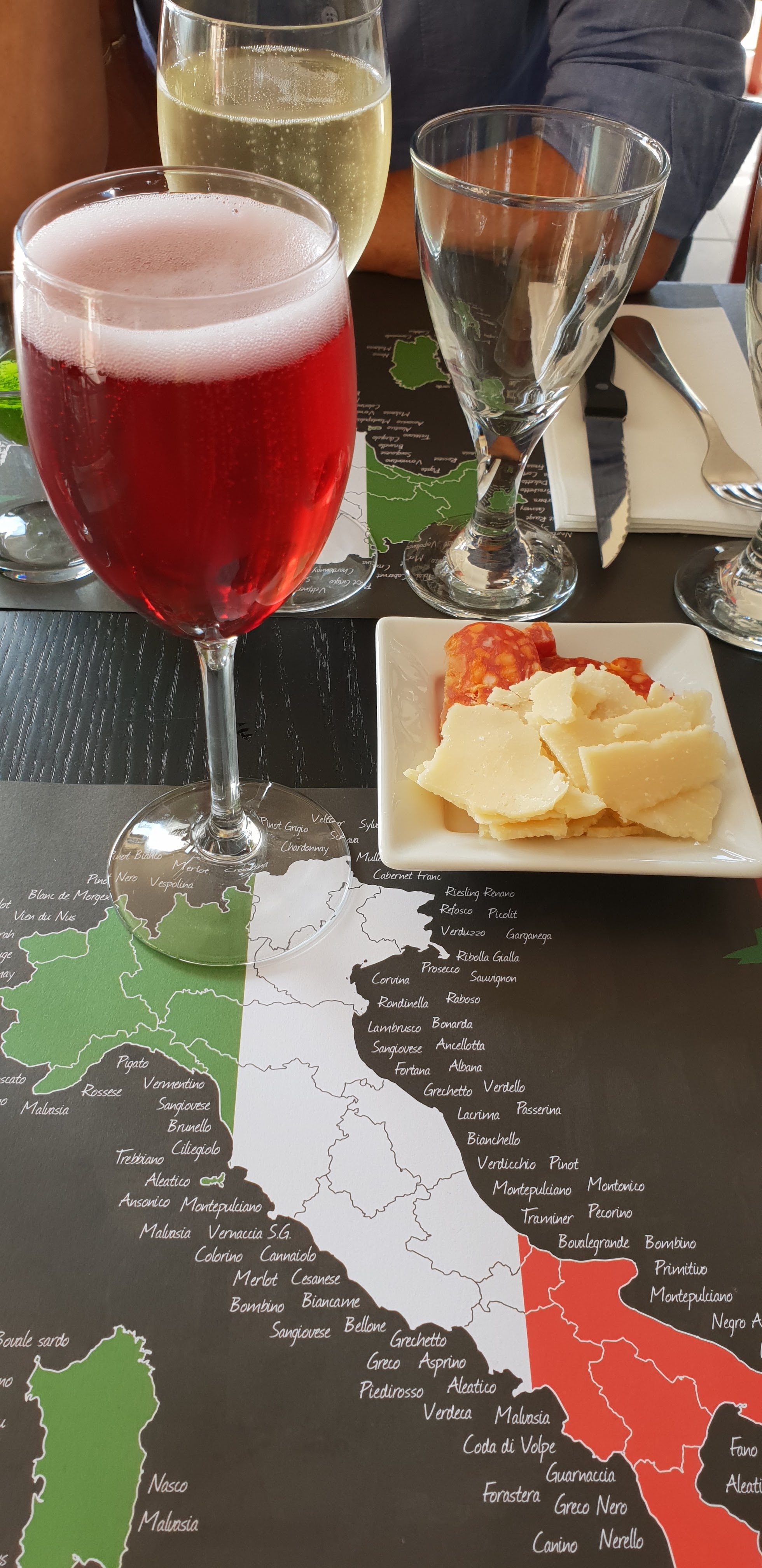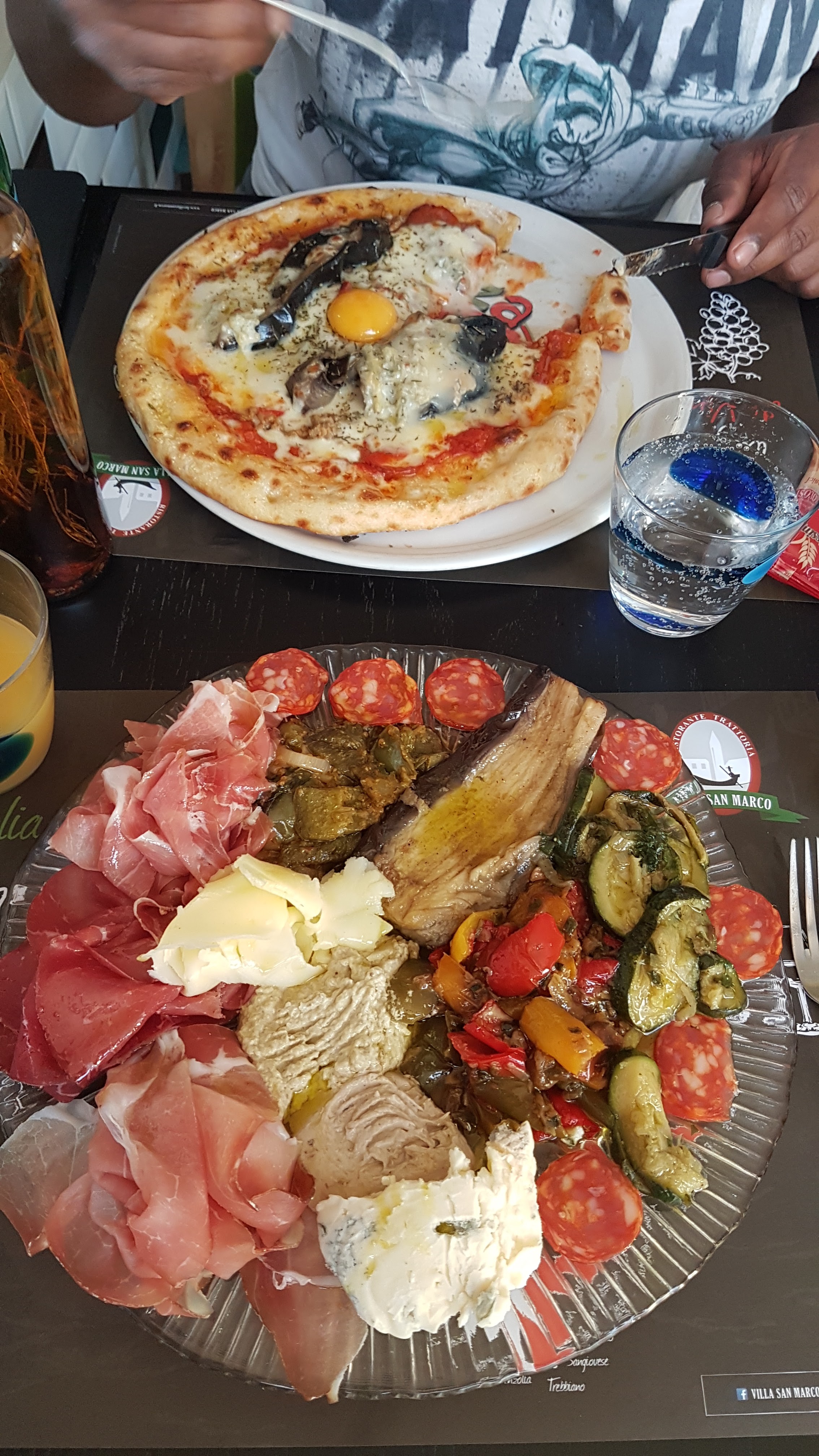 Pour la Communion de notre fille aînée, Madame eut l'idée : et si on faisait italien? Mois de Mai, ensoleillé (OK, le pari était osé en ce mai 2024) ... Qui prendre pour ça ? Ayant déjà testé quelques italiens (le nom du restau n'assurant pas nécessairement une qualite digne de la gastronomie du pays revendiqué, sinon de l'art - à traduire littéralement - en serait vraiment), notre choix s'est porté sur la Villa San Marco. Résultat : impeccab' comme on dit en finistere sud ! Plateaux d'antipastis variés, des charcuteries exceptionnelles et des fromages succulents. Pour le vin ? Nous avons laissée Hélène nous choisir les vins. A notre Française Surprise nous découvrons qu'en Italie il n'y aucune limitation de terroirs (la chance de ne pas avoir subi Colbert sans doute ?)... resultats: une multitude de vins à goûter ( et sans modération, on n'a qu'une vie) Bon sinon, à la Villa San Marco il y a des pizzas... elles sont bonnes... mais laisser vous aller à goûter leurs charcuteries, fromages, un bout de foccacia et... une petite limonade (ouaip parce que pour le coup elles sont pas mal aussi) Ciao e a la prossima volta