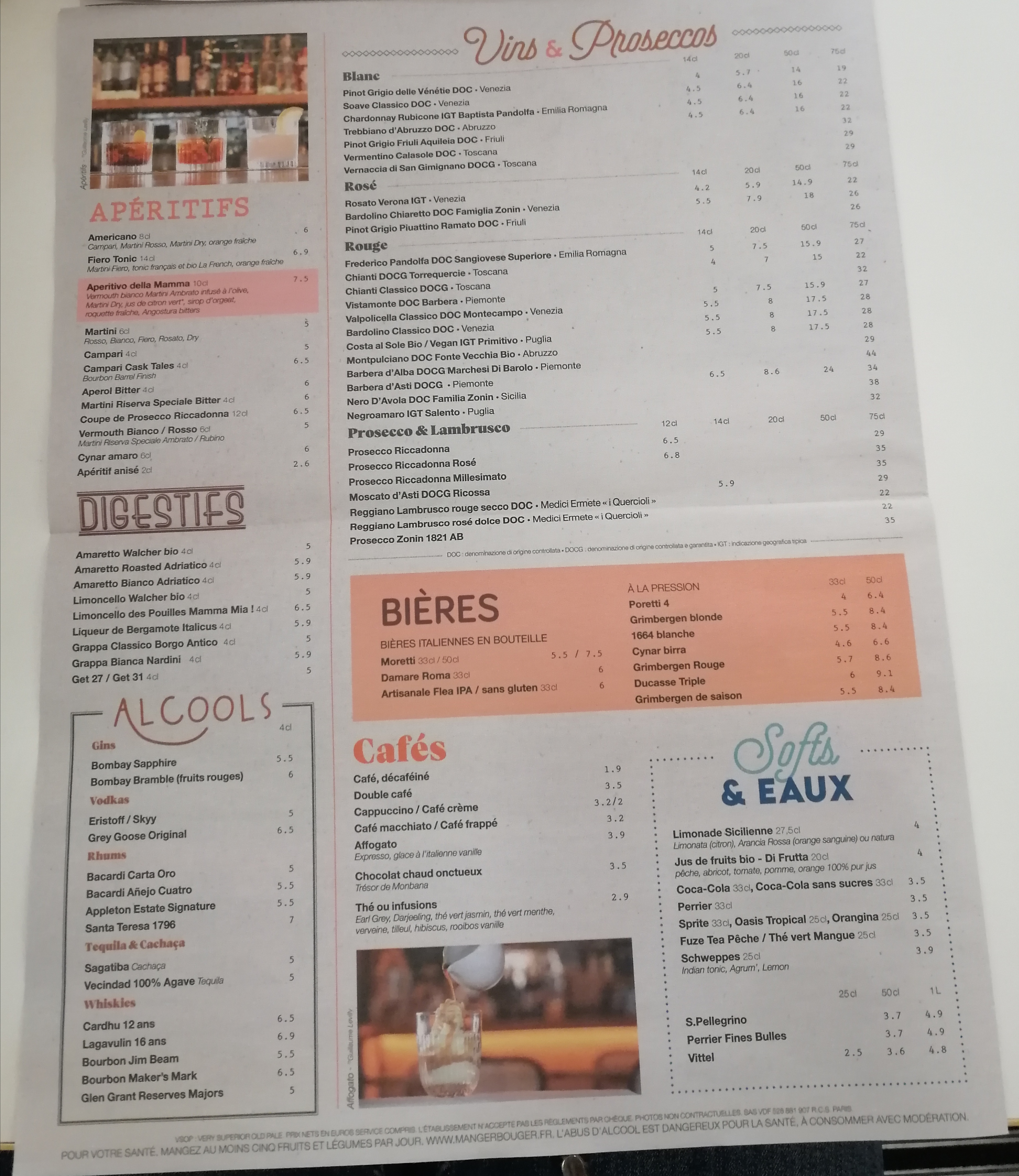 Bonjour, Étant adepte Des bons restaurants nous avons voulu essayer le votre et nous nous sommes arrêtés aux cocktails. Car très médiocre, quand je commande un FRUTTA ROSSA je ne m’attends pas à avoir un verre rempli de glace pilée, et du jus d’orange, j’ai pourtant été voir la serveuse pour lui demander s’il n’y avait pas un problème avec le cocktail,tout en souriant celle-ci me dit que non.. excusez-moi mais je pense qu’elle se trompe il va falloir revoir les bases Dommage! Sur les photos ci-dessous Vous pouvez constater un FRUTTA ROSSA Et le verre de jus d’orange à l’eau de votre établissement..