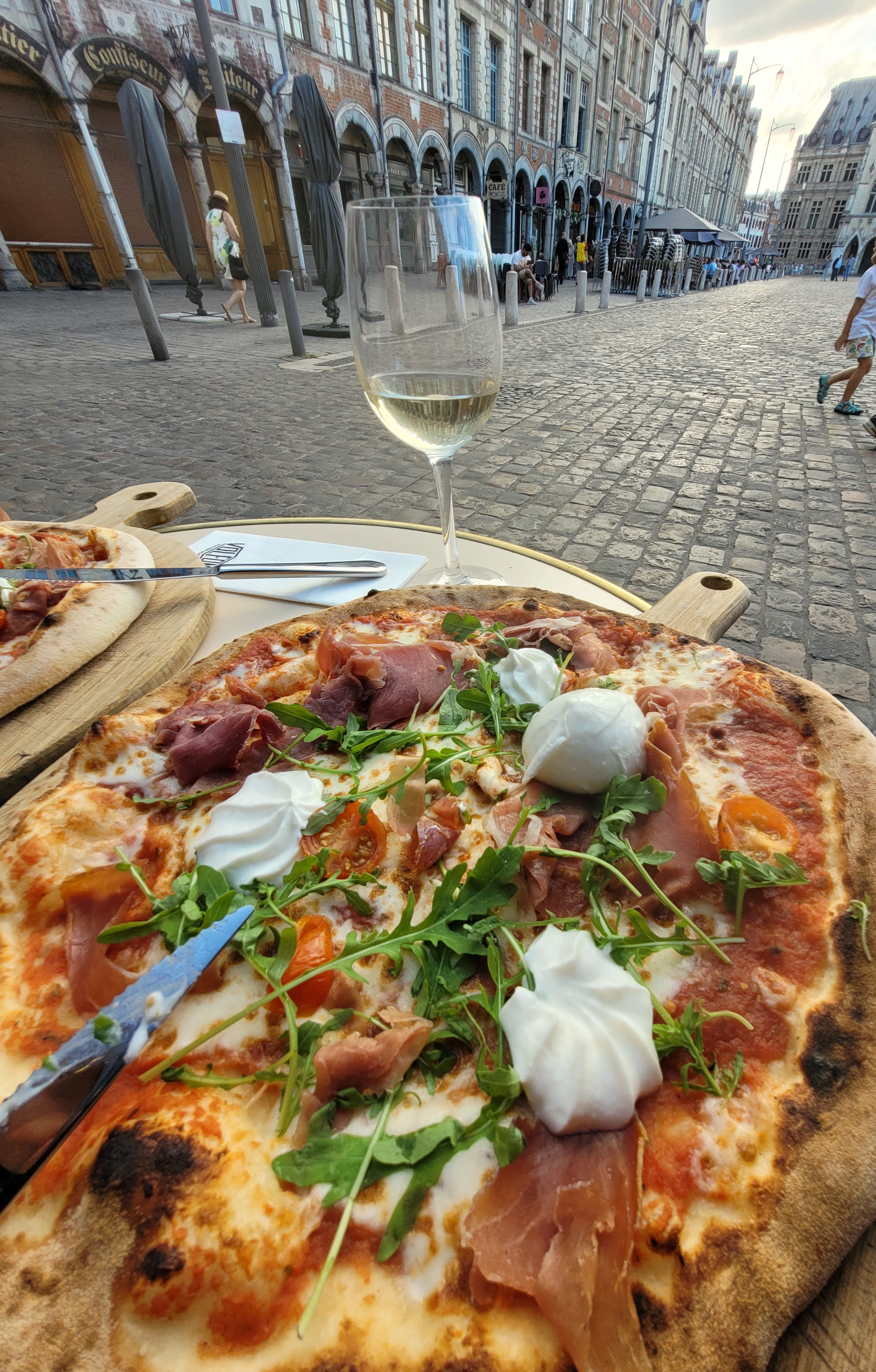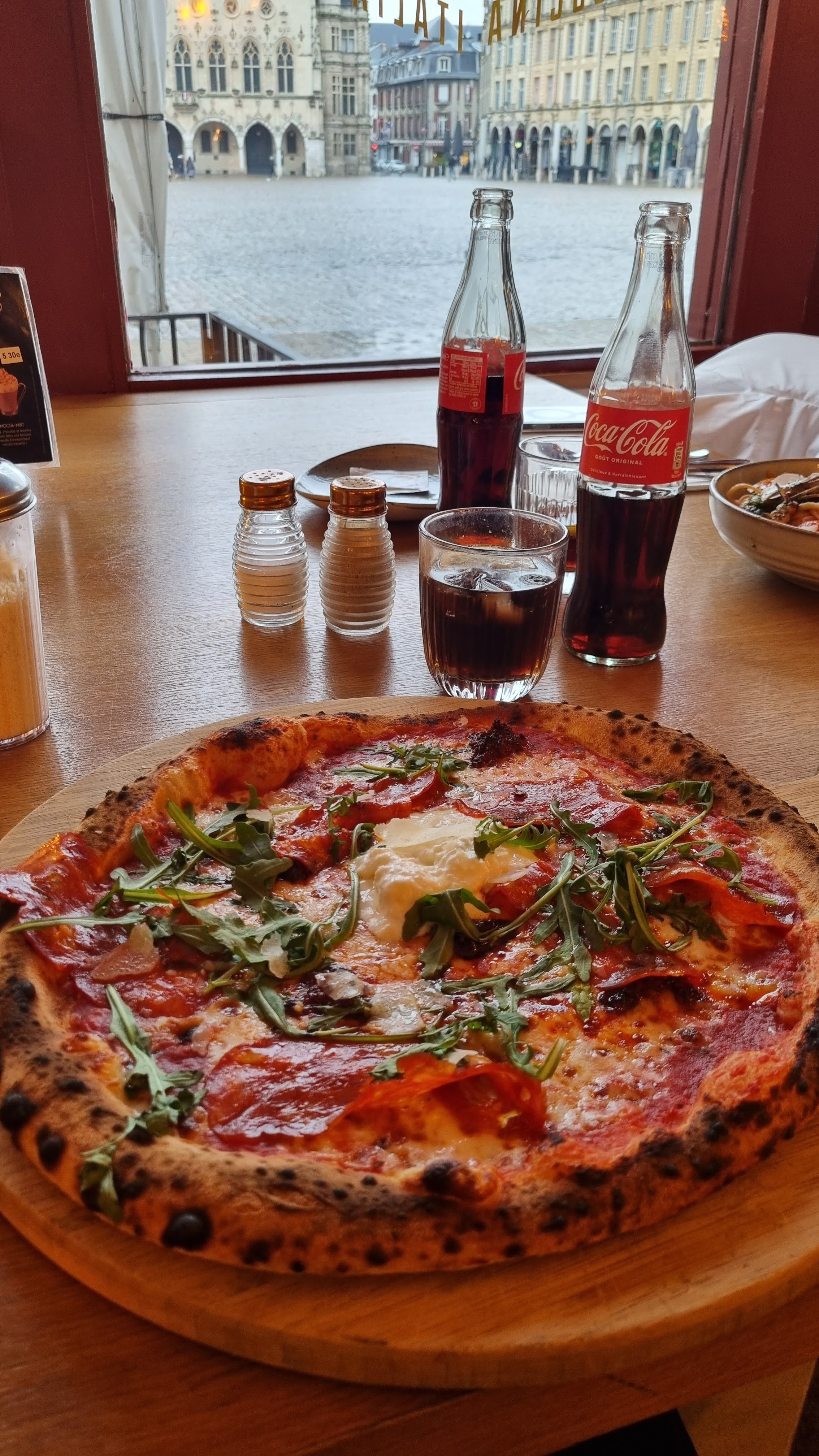 Une très bonne adresse, au menu limite mais bien suffisant et surtout avec de bons produits. Une pizza large, à la pâte bien levée, avec du goût et pas trop lourde. Les pâtes ont elles aussi été très appréciées ! Pour ne rien enlever, le personnel était à l’écoute et très professionnel. La vue sur le beffroi, couplée au cadre à la fois vintage mais très en accord avec le thème constitue une cerise sur le gâteau… et quel gâteau ! Nous reviendrons avec plaisir.