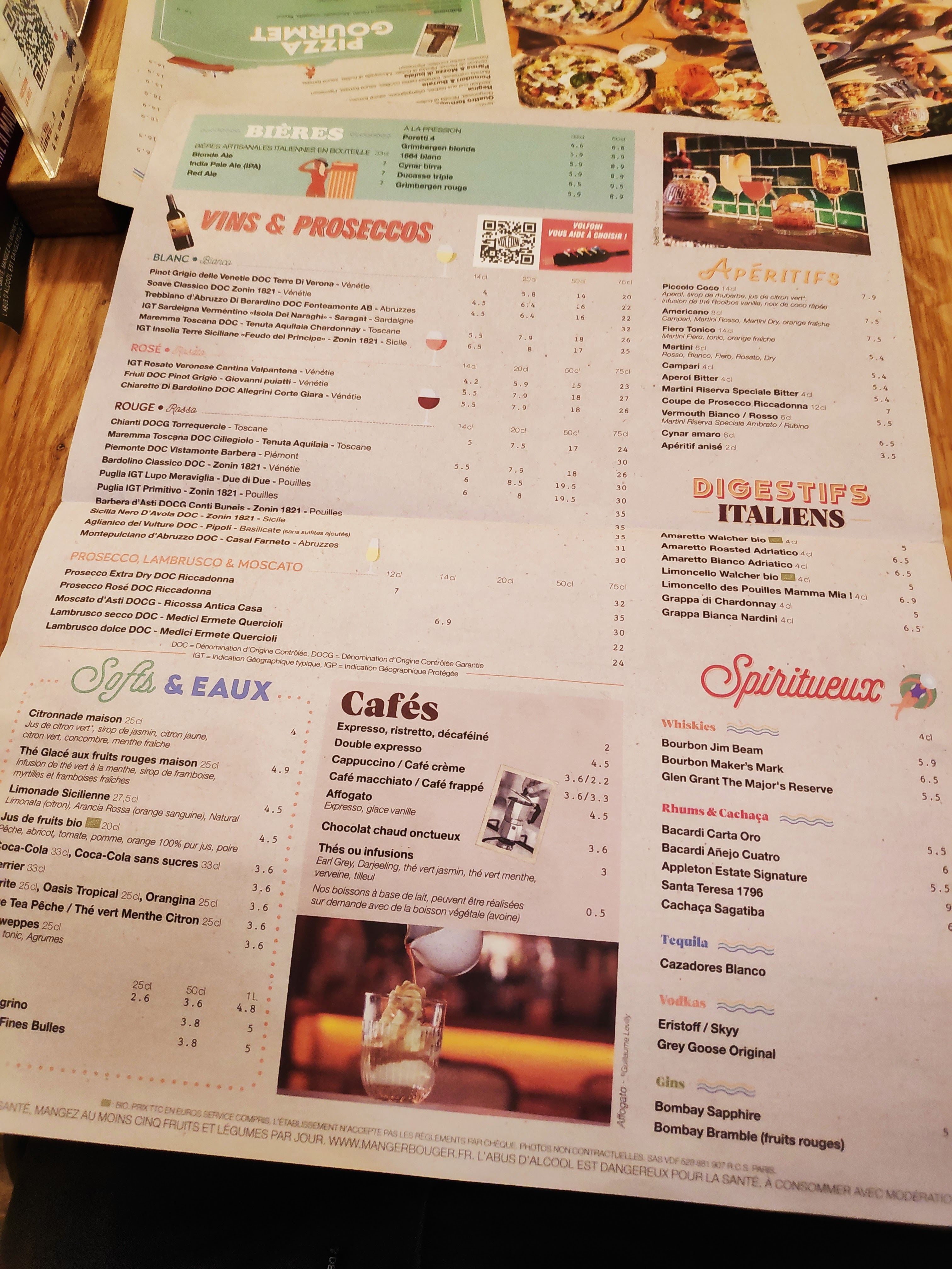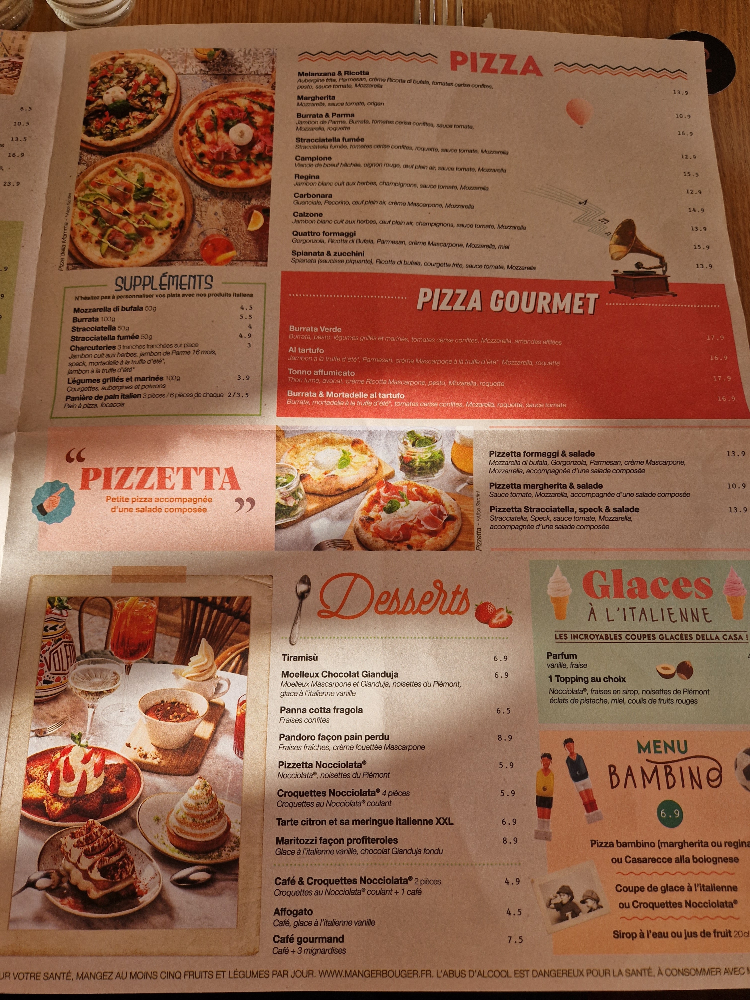 Large choix de pizzas, salades et autres plats. Les cocktails aussi sont rafraîchissant, cependant très peu chargés. Les pizzas sont grande, la pâte n'est pas sèche. La salle est jolie, nous étions à l'étage pour le dîner en semaine.