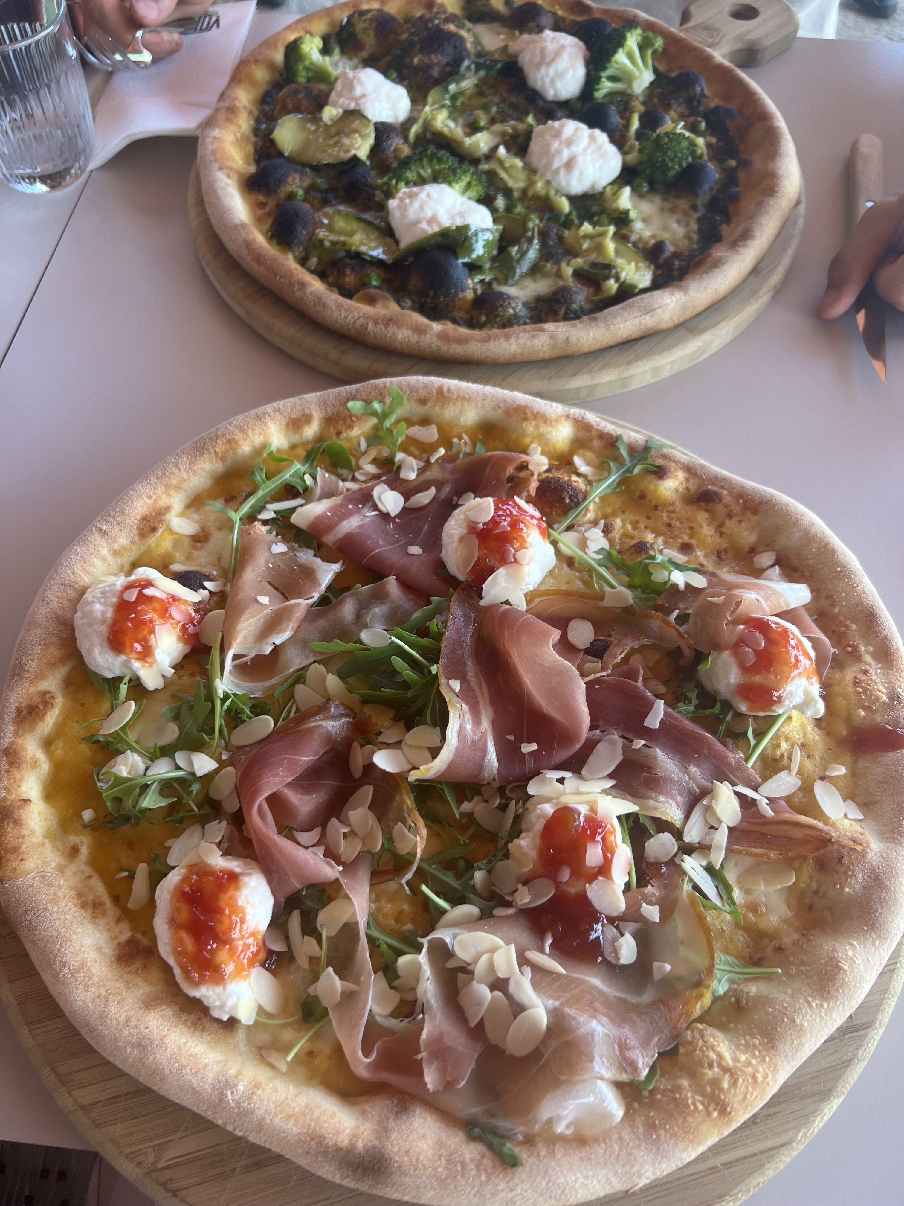 Ambiance plutôt sympathique malgres un niveau sonore très élever Pizza pâte très fine et très dur avec peu de garniture pour un prix très élevé Trop de miel sur la pizza au chèvre Attente très longue Pâtes au saumon classique rien d’exceptionnelle